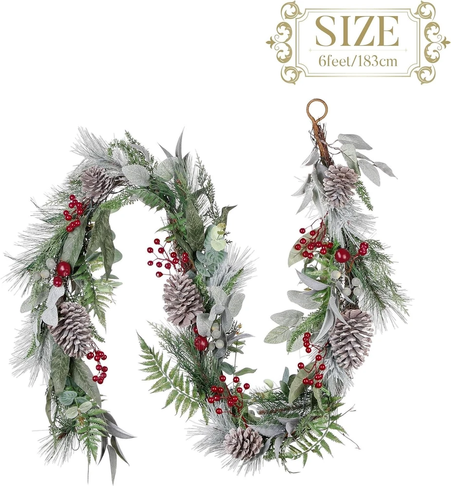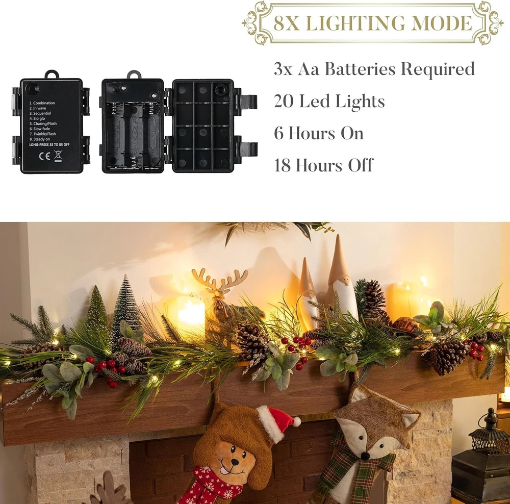 Here's a more polished and professional version of your eBay product description: 6ft Christmas Garland with LED Lights – Featuring Pine Cones, Red Berries, and Waterproof Design – Perfect for Holiday Décor Enhance your holiday season with this beautifully crafted 6ft Christmas garland from Valery Madelyn , a brand known for its original, nature-inspired designs. Designed to bring the magic of the forest into your home, this garland features a harmonious blend of rich red and brown tones, pine cones, red berries, and more, creating a festive, woodland-inspired atmosphere that radiates Christmas cheer. Key Features: Elegant & Original Design: Featuring a lush base of artificial crestwood fir branches, this garland is adorned with seasonal elements such as pine cones, red berries, and other natural accents, creating a sophisticated yet cozy holiday look. Automatic Timer Function: Enjoy convenience with the built-in automatic timer. Simply switch the garland to the "ON" position, and the lights will illuminate for 6 hours before automatically turning off for 18 hours. The lights will light up at the same time each day when initially activated, offering effortless operation. Versatile Lighting Effects: With 20 warm yellow LED lights and a control button offering 8 different lighting modes, this garland allows you to customize the ambiance to suit your holiday mood—whether you want a soft glow or a more vibrant lighting display. Indoor & Outdoor Use: Designed for both indoor and outdoor spaces, this garland can be draped over mantels, stair railings, windows, or even used as a centerpiece for your table. It also makes a perfect addition to your front entrance, welcoming guests with festive warmth. Waterproof & Durable: The garland's battery pack is rated with an IP44 waterproof standard, ensuring reliable performance in both indoor and outdoor settings, even during wet weather conditions. Perfect for Holiday Décor & Gifting: This elegant garland is the ideal addition to any Christmas display. It pairs beautifully with other Valery Madelyn products such as wreaths, stockings, tree skirts, and ornaments, allowing you to create a cohesive holiday theme throughout your home. It also makes a thoughtful gift for anyone looking to elevate their seasonal décor. Package Includes: 1 x 6ft Christmas garland 20 LED warm yellow lights with 8 lighting effects Battery pack with automatic timer (IP44 waterproof) Note: To display the garland at its best, remove it from the box and carefully fluff and arrange the branches for a fuller, more natural look.