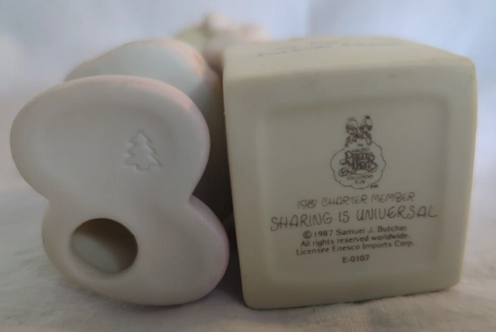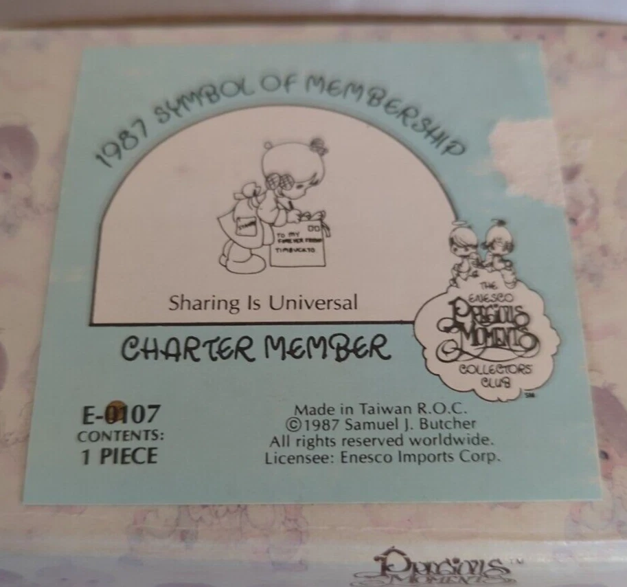 Precious Moments #E0107 Sharing is Universal 1987 Charter Club Member Box Tag. Very nice vintage, pre-owned condition with no damage noted. Please examine all the photos for a more complete condition description. All of my items are carefully packed for shipping, no matter their value - $5 items are wrapped with the same care as a $200 item. My goal is to have your purchase arrive safely. Large, heavy and fragile items are harder to use combined shipping with but just ask if you would like to purchase more than one item and I am more than happy to do so if feasible. Measurements are approximate or as close as I can get. Also, the color you see many not be the exact color depending on your computer or phone settings. Unpaid items will result in the buyer being blocked from further purchases. Please remit payment right away so we can get your item shipped out quickly.