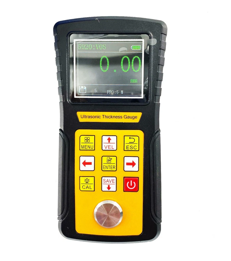 Th ickness Gauge Digital Ultrasonic Thickness Gauge with 0.03-23.62inch for Metals Steel Plastic Note: Battery not Included During The Shipping !!! Introduction: ◆Ultrasonic Thickness Gauge measuring with ultrasonic wave, is applicable for measuring the thickness of any material in which ultrasonic wave can be transmitted and reflected back from the other face. ◆ The gauge can provide quick and accurate measurement to various work pieces such as sheets of board and processing parts. ◆Another important application of the gauge is to monitor various pipes and pressure vessels in production equipment, and monitor the thinning degree during using. ◆It can be widely used in petroleum, chemical, metallurgy, shipping, aerospace, aviation and other fields. Main Functions: ◆Can collocate variety different frequencies,wafer sizes of probes ◆Sound Velocity Calibration function as a known thickness ◆Coupling status indicator showing the coupling status ◆Have the battery indicator function, can real-time display the remaining power ◆Auto sleep and auto power off function to conserve battery life Technical Specification: ◆Display : 128*64 LCD with LED backlight, Color display ◆Measuring Range : (0.75~600)mm ( Steel) ◆Velocity Range : (1000~9999) m/s ◆Resolution : 0.01mm ◆Measuring accuracy : ± ( 0.5%H+0.04mm);H is thickness value ◆Measurement cycle : Single point measurement 6 times/per ◆Storage : 40 values of saved data ◆Power Source:2pcs 1.5V AA size ( Battery Not Included In the Package ) ◆USB Port ◆Working Time:more than 50 hours (LED backlight off) ◆Outline Dimensions:145mm*74mm*32 mm ◆Weight: 245g ◆Standard Configuration : Main Body , Standard Probe ( 5MHz,D10mm ), ABS Case , Product Certificate , Warranty Card , Manual