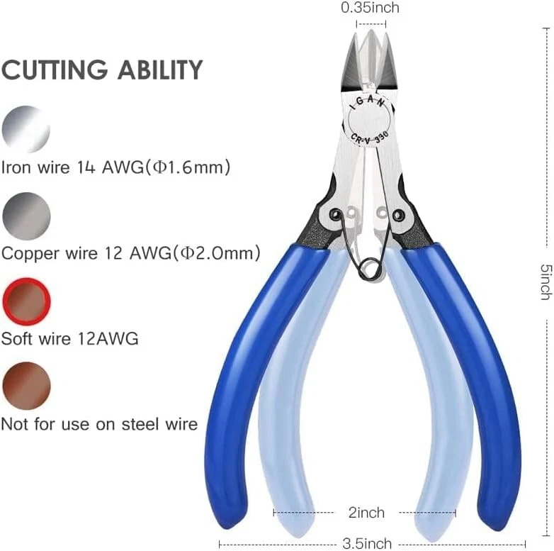 PRECISION AND DURABILITY: Crafted for exacting precision, our flush cutters and wire cutters electrical are the epitome of durability. Featuring a 13mm long upgraded jaw, these flush cutter pliers excel in flush-cutting applications, effortlessly handling up to 14 gauge (1.6mm) copper and soft wires. The hardened chrome vanadium steel construction ensures long-lasting sharpness and strength, perfect for professionals. HIGH-HARDNESS CR-V: Crafted from heat-treated chrome vanadium steel, these flush cutters and wire cutters electrical boast an angled head design and a Rockwell hardness of 60C, ranking them among the most durable small wire cutters available. VERSATILE CUTTING TOOL: Our sprue cutter and side cutters are not just tools but solutions for a wide range of cutting needs. From zip ties to plastic sprues for models, these flush cuts pliers are indispensable for electronics, jewelry wire cutters, and hobbyists engaging in gunpla or model nippers activities. The compact design allows for fast, flush cuts in tight spaces, making every project easier. ERGONOMIC COMFORT: Experience unparalleled comfort and control with our wire snips and small wire cutters. The ergonomically designed non-slip rubber handle offers a comfortable grip, reducing hand fatigue during prolonged use. Ideal for electronics, jewelry making, and more, these cutters ensure precise cuts every time. COMPREHENSIVE CUTTING SOLUTION: Our product lineup, including micro cutter and wire strippers, is designed to meet all your cutting needs. Whether it's for zip tie management with our cable tie cutter or intricate work with micro wire cutters, these tools are perfect for electrical, jewelry making, and detailed model work. Each purchase comes with our 12-month warranty and friendly customer service, ensuring your complete satisfaction.