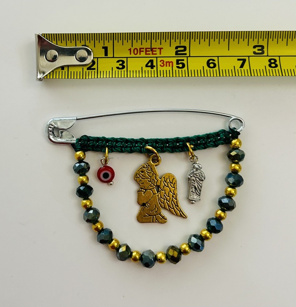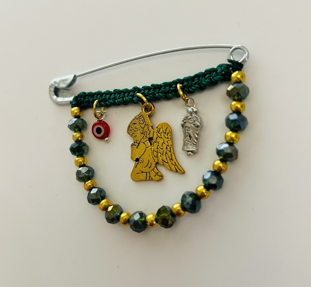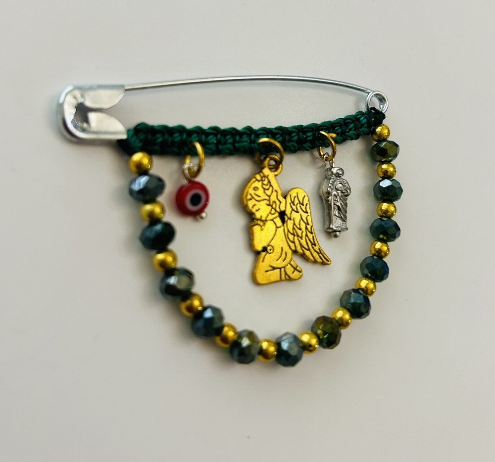 Protection Pregnancy Pin Baby Brooch Evil Eye San Judas Angel Amulet This Pregnancy Pin/Safety Pin/Baby Brooch, makes a perfect accessory for pregnant women or babies, besides the beautiful way this pin looks, it serves as an amulet for protection against any evil or negativity. Add it to your baby collection today!