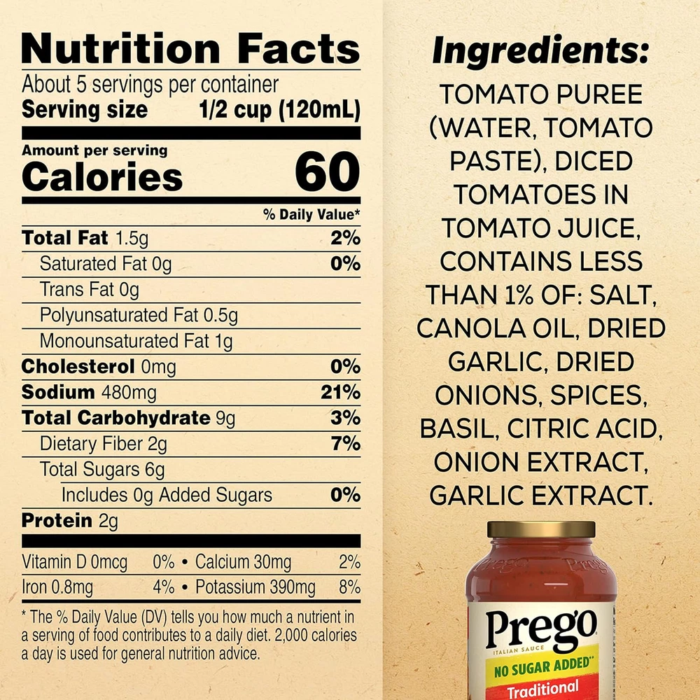 Fast Shipping Great Customer Support Satisfaction Guaranteed DESCRIPTION Shipping Shipping Shipping All domestic packages are shipped for Free (Unless other shipping method was selected during the checkout) Most items ship and arrive much sooner than the estimate delivery date. Usually within 2-3 days from payment. However, we have longer estimates to compensate for the occasional delay or supply chain breakdown. We do not accept P.O. BOXES - PLEASE PROVIDE A PHYSICAL ADDRESS Return Return Return In the event that you would like to return your purchase, we allow returns that are processed within the defined return date (the return date is to be found in the return policy/shipping and handling section) Please contact us for a return authorization and the return shipping address. Payment Payment Payment PayPal is our preferred method of payments it's the quickest, easiest and most secure way to pay for your goods or services online. PayPal offers buyer and seller protection should there be a problem. If you do not have a PayPal account, to get started and buy your first item with us is very easy. Simply click on the 'Buy It Now' button and follow the eBay checkout steps. Select PayPal as the payment method you then will be given the chance to enter your card details in to PayPal's secure checkout in order to pay for your order. Once the payment has been made, you will then be given the opportunity to make your own PayPal account to make paying for your items in the future very easy. Should there be a problem with payment please do let us know. Feedback Feedback Feedback Customer satisfaction is very important to us. If you have any problem with your order,please contact us and we will do our best to make you satisfied, please do not leave a negative feedback before we resolve your problem. We guarantee that your issue will be solved quickly. As long as you are happy with your purchase of , please leave us a positive feedback. Your feedback is very important to us it affects our search placement on eBay. We will leave a positive feedback for you in return automatically once we receive your feedback. Contact Us Contact Us Contact Us If you have any queries, please contact us via ebay. We usually respond within 24 hours on weekdays. Thank you for visiting our ebay store! One 23.5 oz jar of Prego Traditional No Sugar Added Pasta Sauce Prego spaghetti sauce with thickness you can see and a taste that everyone loves Prego sauce features the rich, sweet taste of vine-ripened tomatoes balanced with flavorful herbs and seasonings Each half cup serving of this gluten free, vegan sauce does not contain artificial colors or added MSG Makes a great spaghetti sauce, bolognese sauce or base to other recipes Be the hero at dinner with Prego Traditional No Sugar Added Pasta Sauce. Versatile and delicious, this classic red sauce features the rich, sweet taste of vine-ripened tomatoes balanced with flavorful herbs and seasonings, with no sugar added (1). This pasta sauce has a taste everyone loves and a thick texture that doesn’t water out, making it a perfect pairing with any pasta. Prego pasta sauce is gluten free, vegan and made without artificial colors or added MSG for a spaghetti sauce you can feel good about. Top off any pasta with this Prego Italian sauce for a quick, family-pleasing meal, or use it as a base for your favorite recipes. The tomato sauce jar top is easy to close and store in the refrigerator for leftovers. Give your family the taste everyone loves with Prego sauces. In addition to Traditional No Sugar Added Pasta Sauce, Prego offers a variety of favorites, including Chunky Tomato, Garlic and Onion Italian, Low FODMAP and more! (1) Not a calorie reduced food. See nutrition facts panel for sugar and calorie content Prego Traditional No Sugar Added Gluten Free Pasta Sauce 23.5 Oz Jar Click here to see description Fast Shipping Great Customer Support Satisfaction Guaranteed DESCRIPTION Shipping All domestic packages are shipped for Free (Unless other shipping method was selected during the checkout) We ship within two business days of payment, usually sooner Standard FREE shipping takes between 3-5 business days Expedited shipping takes between 2-3 business days Overnight shipping takes between 1-2 business days We do not accept P.O. BOXES - PLEASE PROVIDE A PHYSICAL ADDRESS We Ship Globally using ebay's GSP, the item is sent to a logistic center in KY and shipped from there to the rest of the world. International customers are responsible for all duties and taxes Contact your local authority for questions related to the amount of duties or taxes you will be responsible for Return In the event that you would like to return your purchase, we allow returns that are processed within the defined return date (the return date is to be found in the return policy/shipping and handling section) Please contact us for a return authorization and the return shipping address. Please contact us for a Return Merchandise Authorization (RMA) number. We advise you to use a reputable carrier service when returning your goods. Please pack all returns appropriately. We ship globally Via eBay's global shipping program (GSP). Thus we don't cover returns for items shipped globally. Buyers returning such items will be refunded ONLY for the item's cost and not for the shipping. please check the Voltage information and make sure it matches the one in your country. In case it's not stated in the description, do ask us. Payment PayPal is our preferred method of payments it's the quickest, easiest and most secure way to pay for your goods or services online. PayPal offers buyer and seller protection should there be a problem. If you do not have a PayPal account, to get started and buy your first item with us is very easy. Simply click on the 'Buy It Now' button and follow the eBay checkout steps. Select PayPal as the payment method you then will be given the chance to enter your card details in to PayPal's secure chec