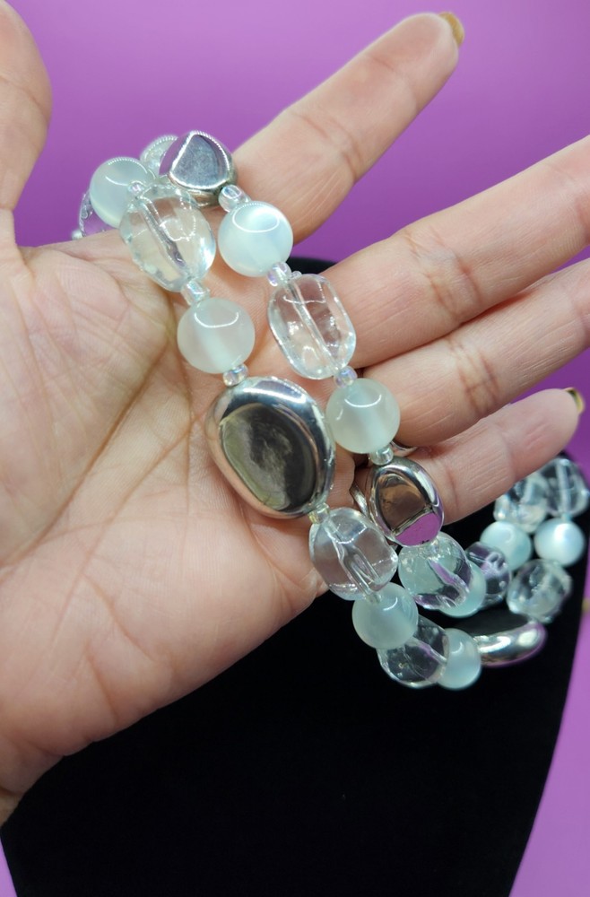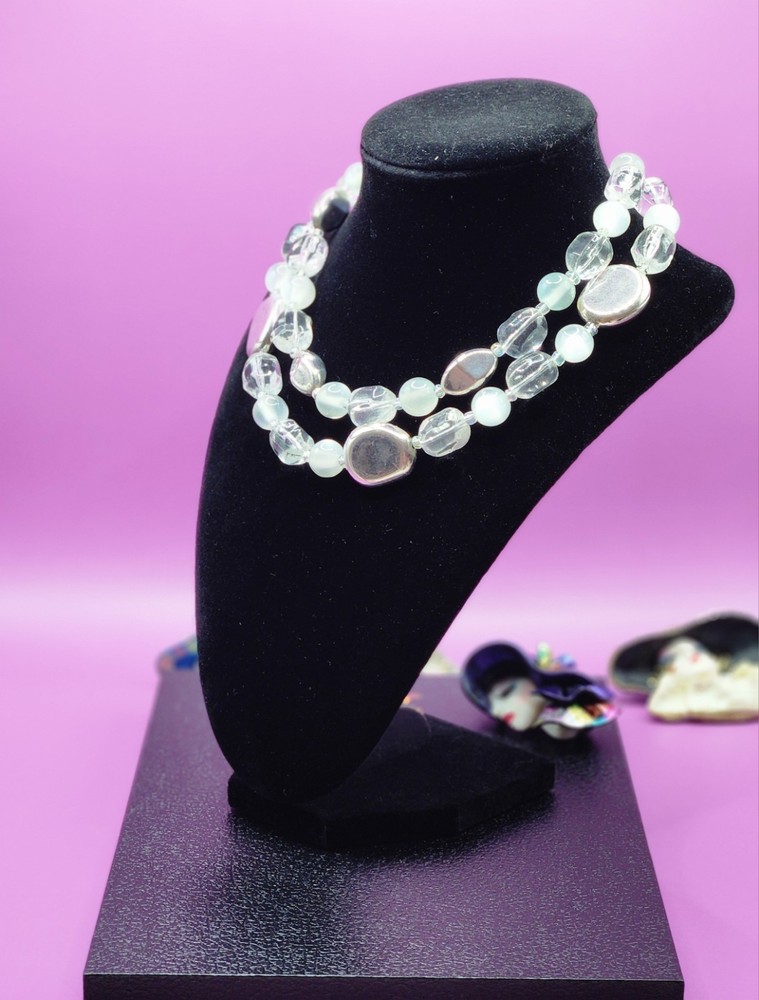 The Premier Designs Double Strand choker necklace features clear, silver, and cat's eye acrylic beads in a stylish beaded design. The necklace is signed by the brand and has a lobster closure for secure wear. With a vintage style this necklace is perfect for women who appreciate unique and fashionable jewelry pieces. If any questions plz contact me Tuly.