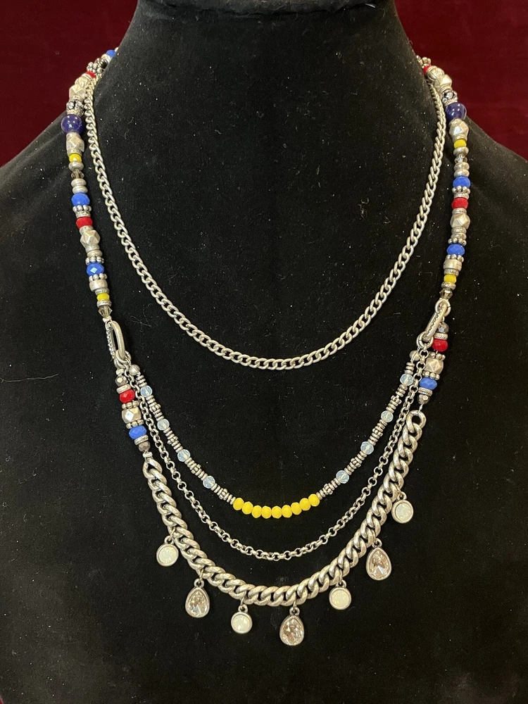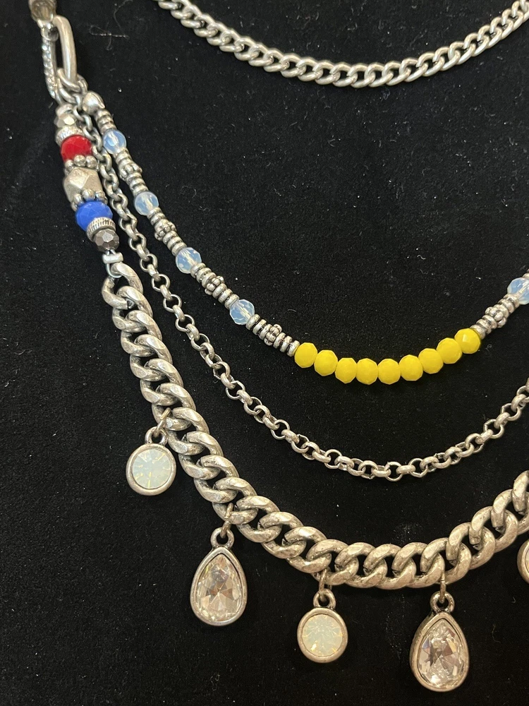 This Premier Designs necklace is a stylish and colorful piece that combines a variety of themes such as Western, Bohemian, and Retro. The silver tone necklace features multiple layers with multicolored stones, giving it a vibrant and eye-catching look. It has an adjustable closure and a 16-inch length, making it suitable for different neck sizes. Perfect for adding a touch of beauty and nature-inspired flair to any outfit, this necklace is a versatile accessory that can complement a range of fashion styles from casual to more eclectic looks.