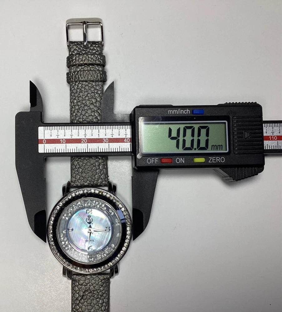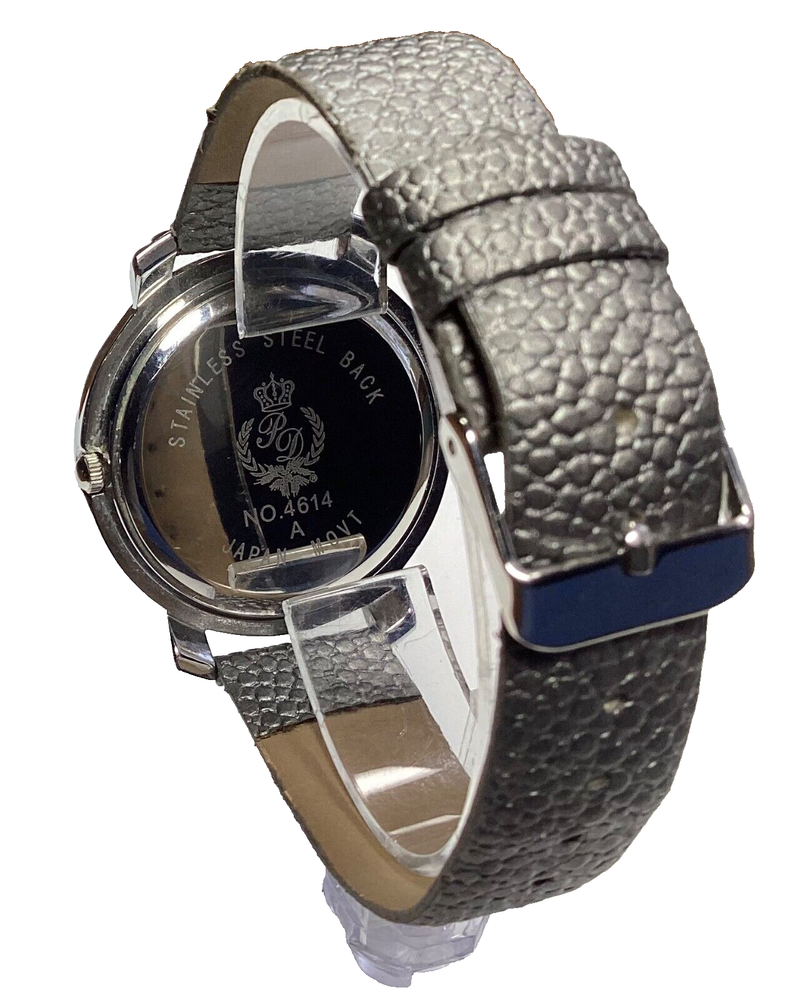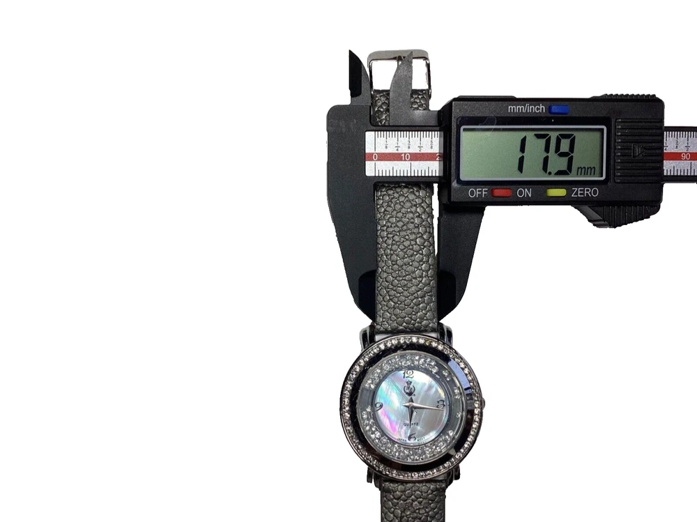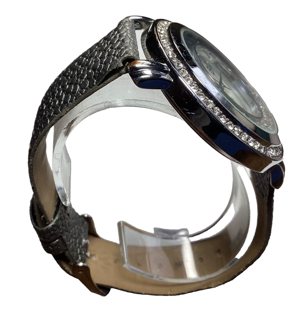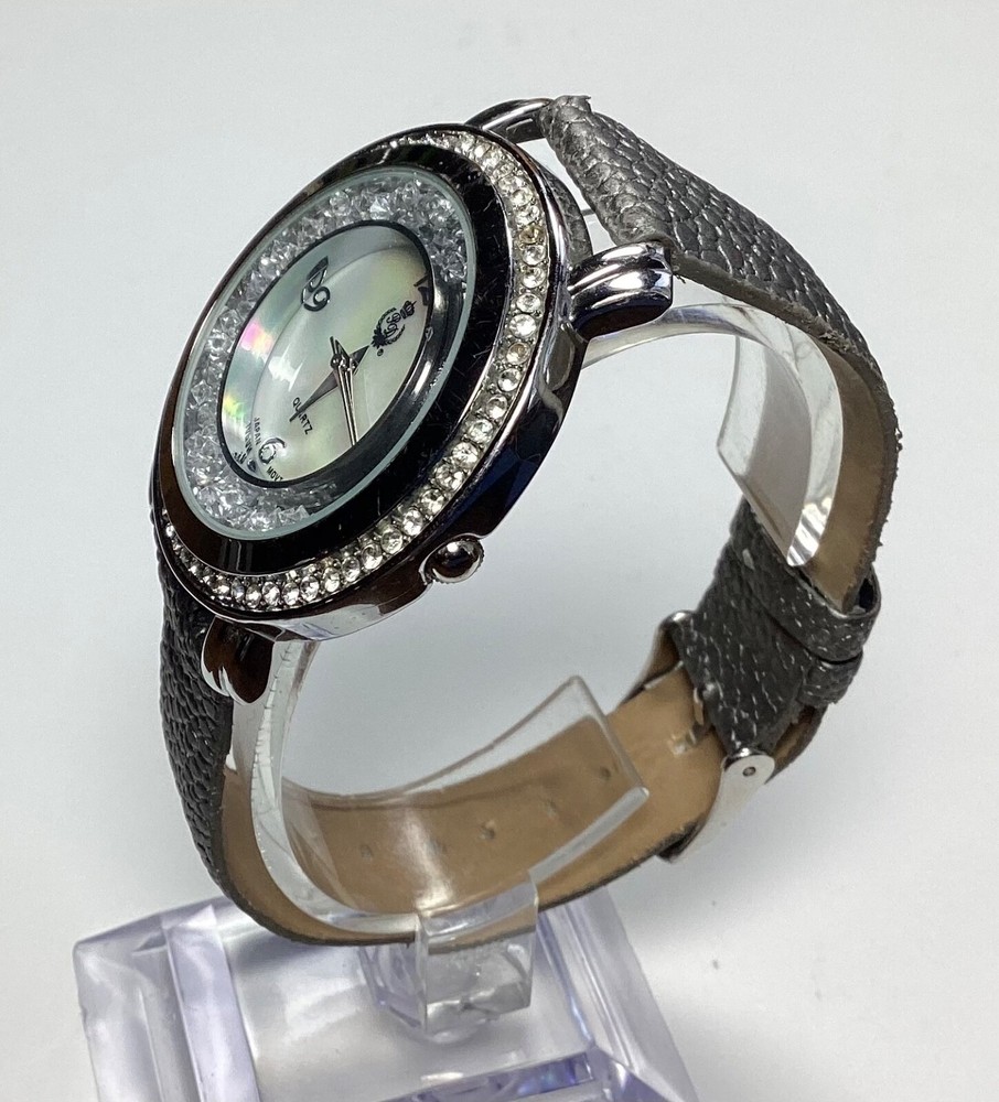 This Premier Designs women's wristwatch features a stunning mother of pearl dial with Arabic numeral indices and a gem-set bezel. The watch is powered by a quartz movement and comes with a two-piece faux leather strap with a buckle closure. The silver case has a polished finish and features a snap caseback. This wristwatch is perfect for both dressy and casual occasions, with its versatile style and analog display. It also includes features such as a central second hand, 12-hour dial, and push/pull crown. The watch is not water-resistant and does not come with papers, service records, or original box/packaging. 1155