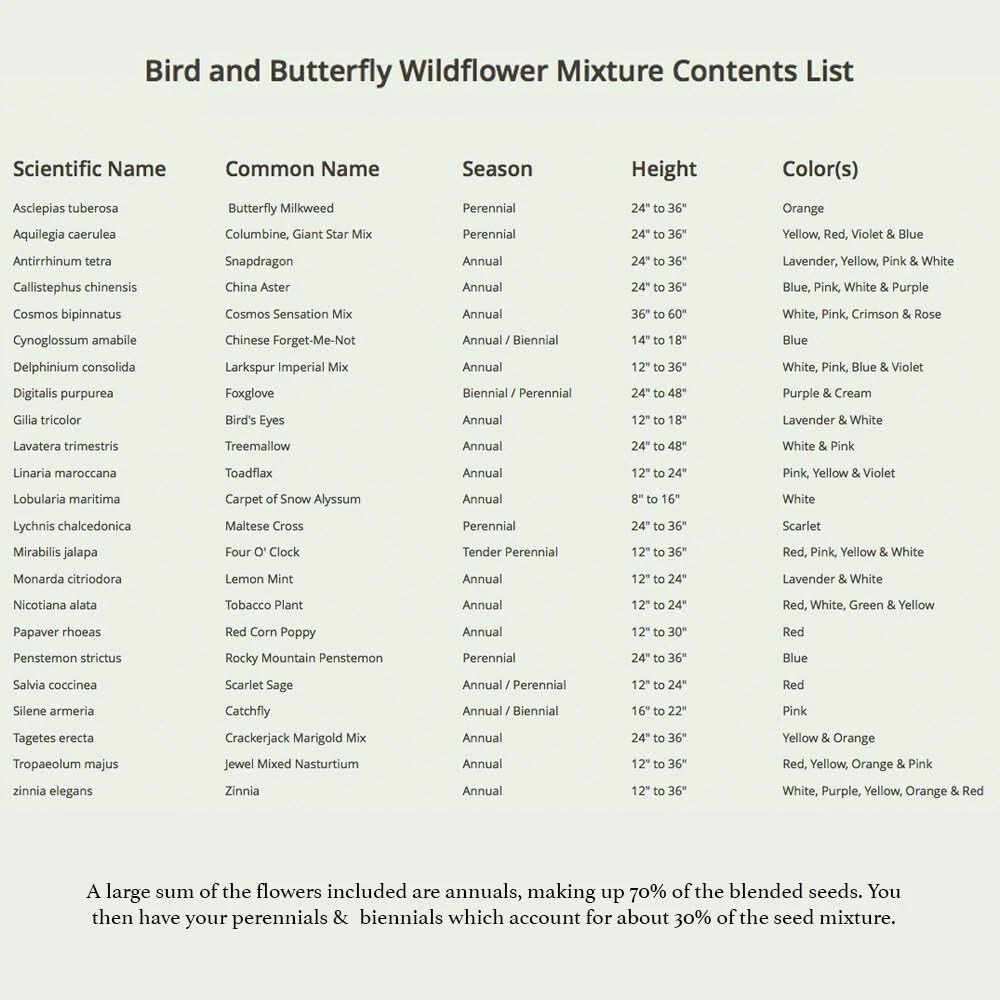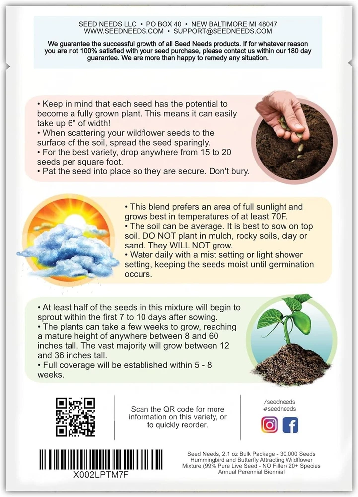 Premium 30,000+ Wildflower Seed Mix for Hummingbirds and Butterflies - 99% Pure ‹ › ‹ › ‹ › ‹ › ‹ › ‹ › ‹ › ‹ › ‹ › Premium Wildflower Seed Mix -30,000+ Seeds for Hummingbirds and Butterflies -99% Pure Flowers Features: Includes over 20 varieties of beautiful annual, perennial, and biennials 99% pure live seed with next to no inert matter Plants grow to an average height of 12 to 36 inches tall Attracts butterflies such as swallowtails and monarchs Beneficial pollinators like bumblebees, honeybees, and ladybugs Stored in a temperature controlled facility free of moisture Generous quantities for sharing or saving for the following season Artful seed packets with detailed sowing information Non-GMO, open pollinated, and heirloom seeds Fresh seeds for quick germination Tear and moisture resistant packaging for freshness Benefits: Beautiful and diverse mix of wildflowers Attracts hummingbirds, butterflies, and other pollinators Easy to grow and maintain Great for creating a vibrant and colorful garden High quality seeds for successful germination Perfect for creating a butterfly garden Environmentally friendly and non-GMO Artful packaging makes for a great gift Long-lasting freshness for optimal results Why choose our Premium Wildflower Seed Mix? Transform your garden into a paradise for hummingbirds and butterflies with our Premium Wildflower Seed Mix. With over 20 varieties of beautiful flowers, this mix is designed to attract a wide range of pollinators and create a vibrant and colorful garden. Our high-quality, non-GMO seeds are stored in optimal conditions for freshness and quick germination, ensuring a successful and stunning garden display. Don't settle for ordinary wildflower seeds - choose our Premium Wildflower Seed Mix for a truly exceptional garden experience. Order now and watch your garden come to life with beauty and biodiversity! Shipping Free & Fast Shipping - We offer free shipping to most of the USA with a normal delivery time of 3-7 days. However, due to the current situation, additional delivery time (up to 3 weeks) may be required for some items. Alternative Carriers - We may use alternative carriers (e.g. USPS, FedEx, UPS, etc.) to ensure your package arrives safely and on time. Due to the use of multiple carriers, we are unable to provide a tracking number automatically. Handling Time - Orders are processed and shipped within 1-2 business days of receiving cleared payment. Shipping Restrictions - Shipping to Alaska, Hawaii, Puerto Rico, Guam, and other US territories may incur shipping charges or delivery restrictions. Please contact us before ordering, or your order can be refunded/cancelled. State Restrictions - There may be restrictions based on your state of purchase. For example, certain items may not be shipped to California due to state regulations. Contact for Tracking Updates - If you require tracking updates or have any concerns about the delivery of your order, please feel free to contact us, and we will be happy to assist you. Return 30-Day Hassle-Free Returns - We want you to be completely satisfied with your purchase. If you are not, you can return the item within 30 days of receiving it for a full refund or exchange. Easy Return Process - To start a return, simply contact us and we will provide you with a prepaid return shipping label and detailed instructions. Restocking Fee - There are no restocking fees for returns. However, the buyer is responsible for return shipping costs if the return is not due to a seller's error. Refund Processing Time - Refunds will be processed within 5 business days of receiving the returned item in its original condition. Payment We accept all major credit cards, PayPal, and Apple Pay for your convenience. Your payment information is secure and encrypted to ensure a safe and seamless transaction. Please complete your payment within 3 days of purchase to avoid any delays in shipping. Feedback Your feedback is extremely important to us. We strive to provide the best products and customer service possible. If you are satisfied with your purchase, please take a moment to leave us a positive review. If you have any concerns or issues with your order, please contact us before leaving negative feedback. We are committed to resolving any problems and ensuring your satisfaction. Contact Us If you have any questions or concerns, please feel free to reach out to our customer support team. You can contact us through the eBay messaging system. We are available Monday to Friday, 9:00 am to 5:00 pm EST, and we will do our best to respond to your inquiry within 24 hours. Thank you for supporting our small family business!