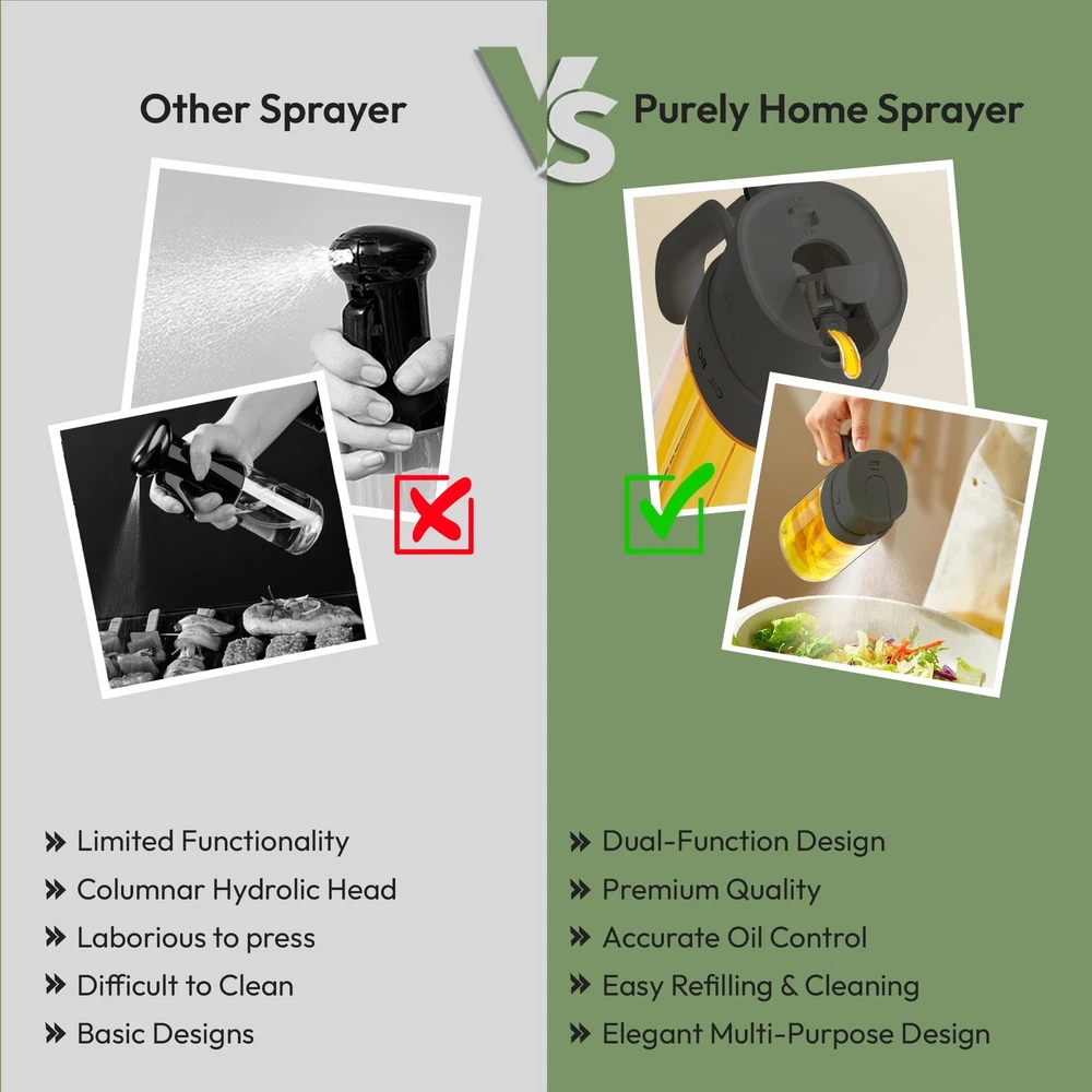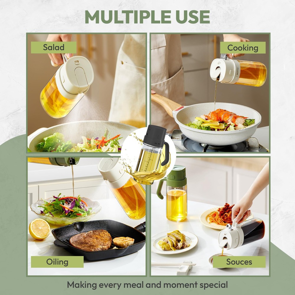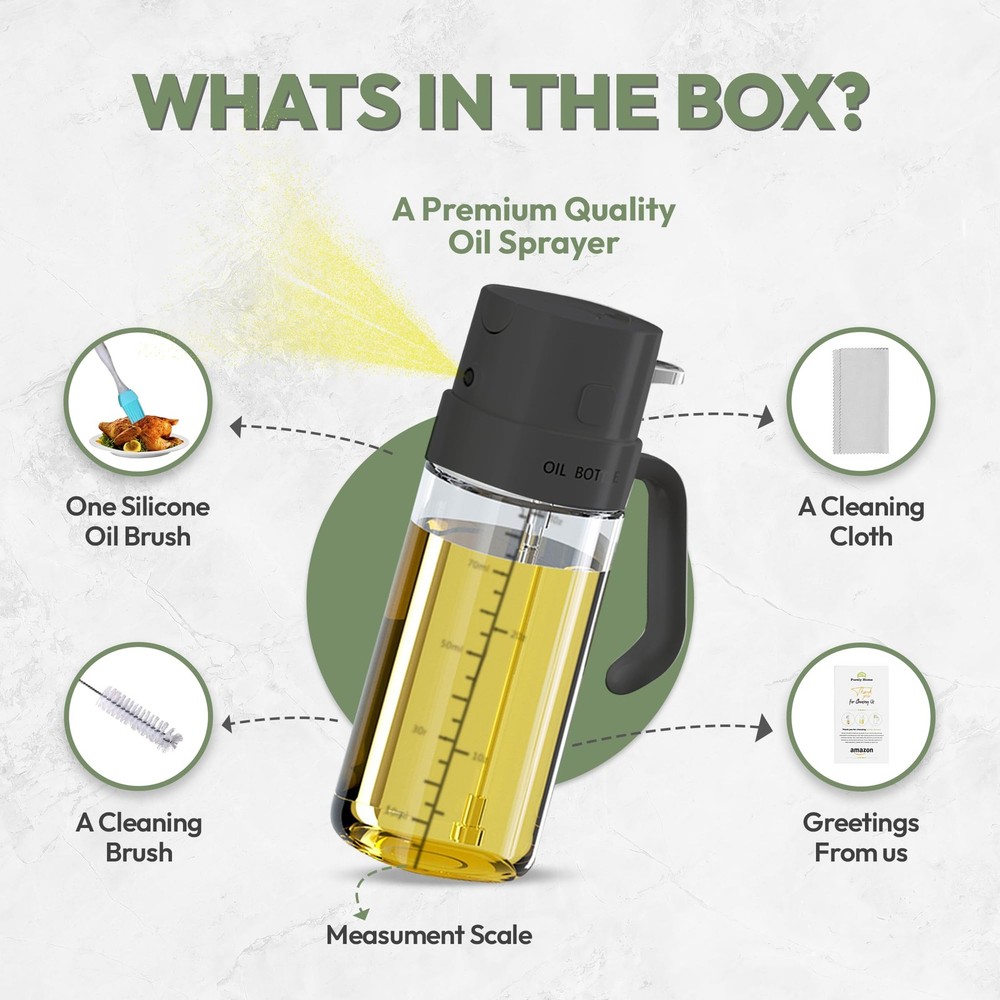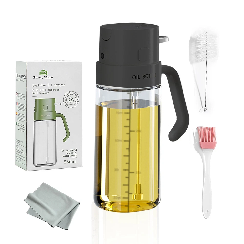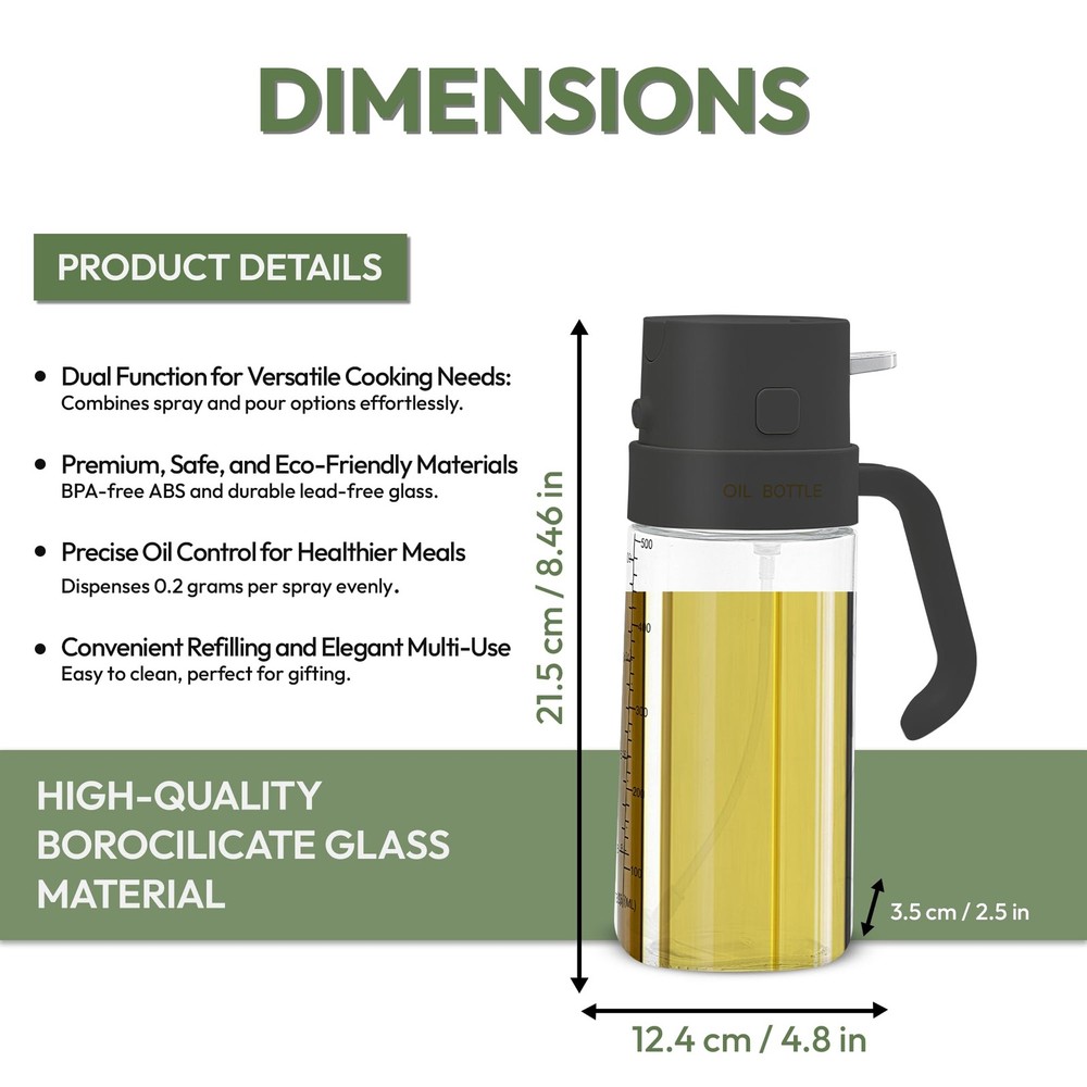 Premium Oil Sprayer 2 in 1 For Cooking Dual-Function Design for Versatility: This 550ML oil sprayer for cooking combines spray and pour options. Ideal for air frying, grilling, roasting, and baking. Its large capacity and practical design make it an essential glass oil dispenser for every kitchen enthusiast. BPA & Lead Free: Made from premium food grade quality BPA-free ABS and durable lead-free glass. Our glass pump bottle for oil is safe, eco-friendly, and built to last. Its transparent design helps track oil levels effortlessly, ensuring reliability for all cooking tasks. Accurate Oil Control for Healthier Meals: Each spray from this glass mister spray bottle dispenses 0.2 grams of oil, ensuring precise application for calorie-conscious cooking. Perfect for evenly coating salads, grills, or pans. It supports a healthier cooking lifestyle. Hassle-Free Refilling & Cleaning: Featuring a wide mouth opening, this spray glass bottle allows easy refilling without spills. It’s reusable, dishwasher-safe, and designed for eco-friendly maintenance making it a convenient choice for modern kitchens.