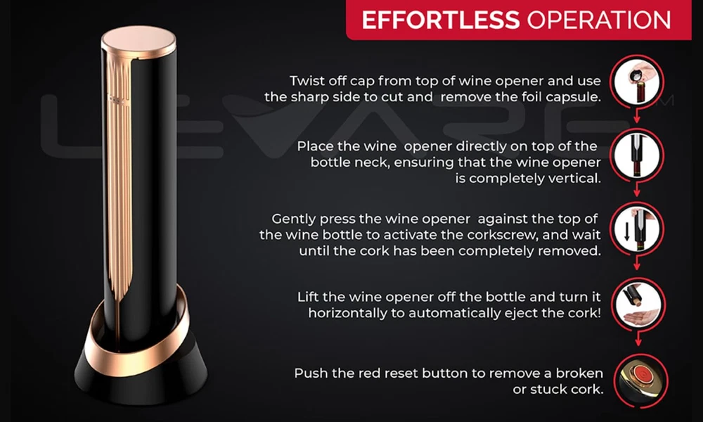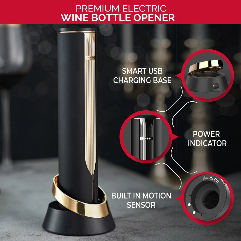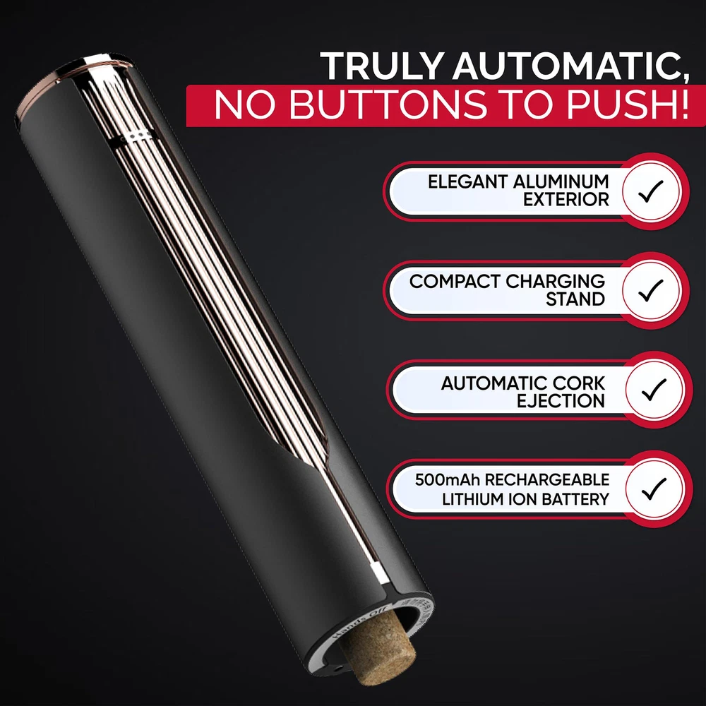 π· Effortless Cork Removal: Say goodbye to the hassle of manual openers! Our fully automatic electric wine opener has no buttons β simply press it down onto the cork, and it will effortlessly remove the cork in just 6-8 seconds. Once the cork is removed, it automatically ejects when you rotate the opener 180 degrees. Whether you're a wine connoisseur or an occasional sipper, it makes uncorking a breeze. π· Stylish & Ergonomic Design: Crafted with an elegant aluminum alloy exterior and ergonomic grips, our wine opener adds a touch of sophistication to any kitchen. It's a stylish statement piece and a reliable tool. π· Rechargeable & Highly Efficient: With a built-in powerful rechargeable Li-ion battery and a USB charging base, you can enjoy opening up to 60+ bottles of wine on a single charge. The battery indicator ensures you're always ready for that next uncorking. Red reset button for automatic sensor reset and for broken or stuck cork ejection. π· All-in-One Package: Our wine opener package includes a foil cutter integrated seamlessly into its design, making it a thoughtful gift for wine enthusiasts. Perfect for home or professional use, it elevates the wine-opening experience. π· Quality Assurance & Support: We stand behind the quality of our premium wine opener with a 12-month guarantee and lifelong customer support. This investment in quality ensures a delightful wine opening experience every time.