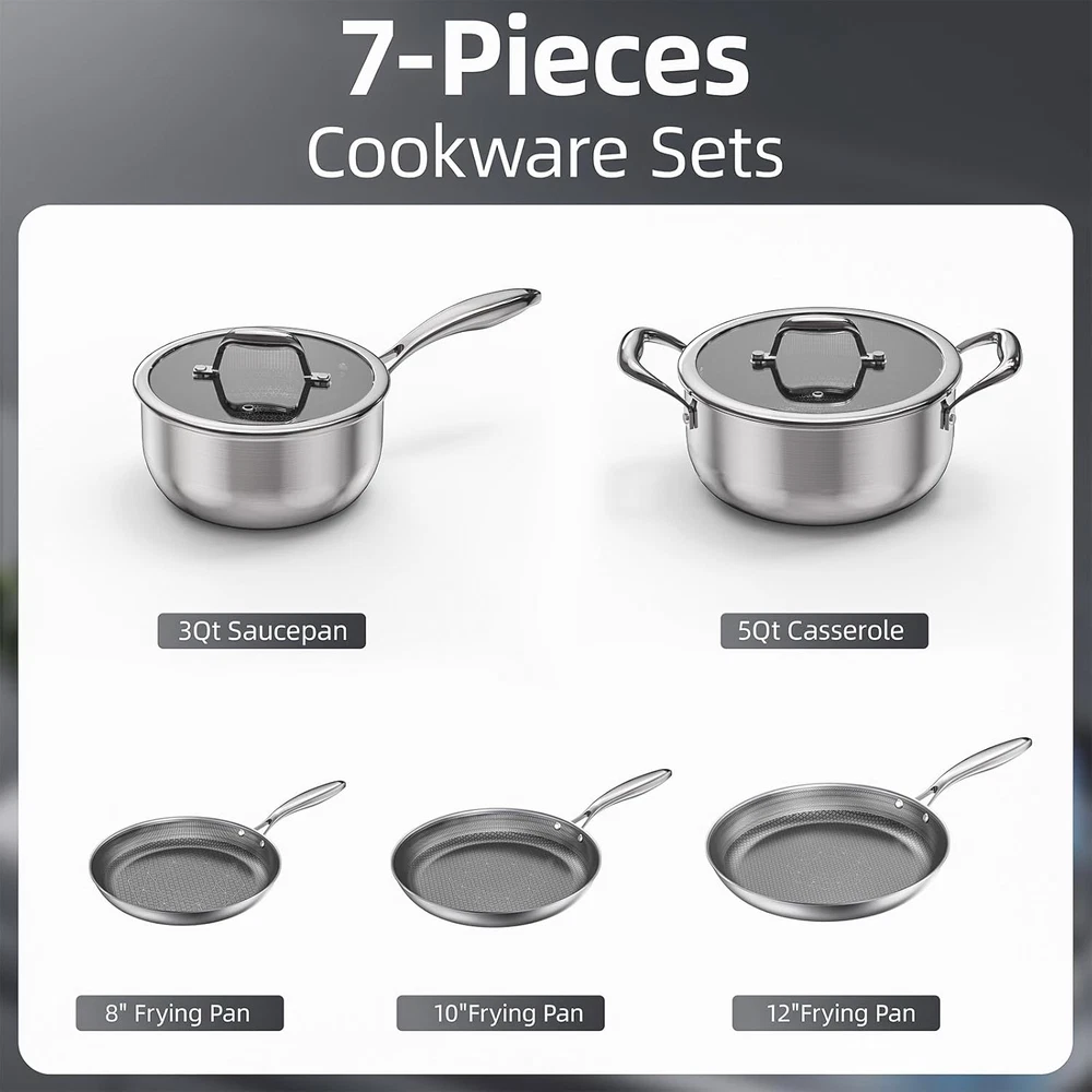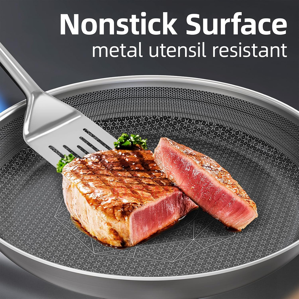 Absolutely love this stainless steel cookware set! The non-stick ceramic coating works like a dream—eggs slide right off, and cleanup is a breeze. The tempered glass lids let me monitor cooking without lifting, and the tri-ply construction ensures even heating. The elegant design looks great in my kitchen, and the etched surface adds durability. Perfect set for everyday cooking—no toxic chemicals, just high-quality performance. Worth every penny!