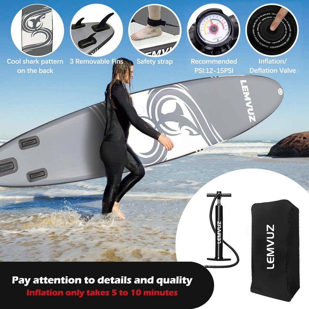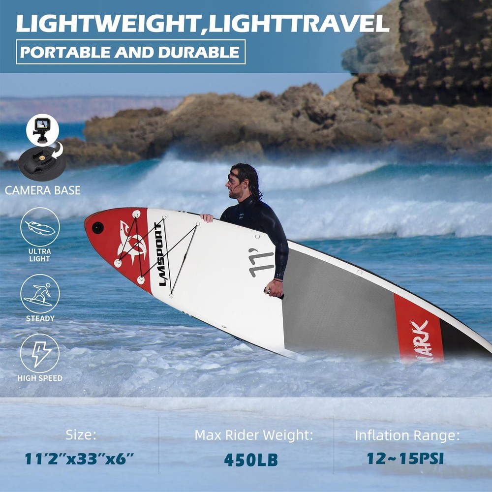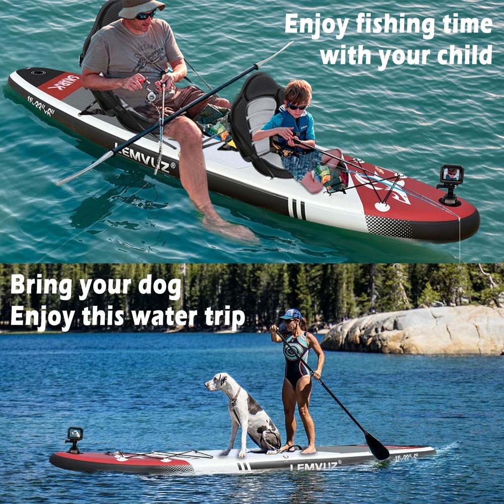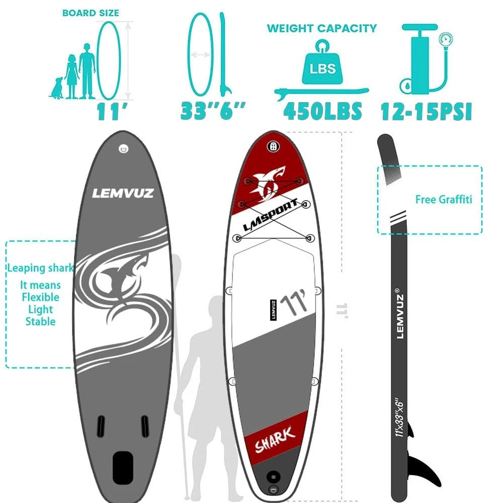 All around Paddleboards version is suitable for beginners and intermediate paddlers. With a weight capacity of up to 450 lbs, the SUP paddle board can accommodate three young adults of medium weight standing on board at the same time. It is very suitable for all skilled paddlers to cruise, explore, or sit back and enjoy the scenery of nature. Our inflatable stand up paddle board provides more stable paddling and better tracking, ideal for all SUP paddlers đăDurable ConstructionăBuilt with military-grade PVC and ultra-lightweight EVA decking,our SUP delivers unmatched stability while maintaining structural integrity.The textured anti-slip surface ensures secure footing for maximum safety during water activities. đăStable PerformanceăEngineered with a 33" width and 11'33" optimized shape,this all-round blow up paddle board offers exceptional balance-perfect for beginners learning to stand and experienced users exploring water sports. đăSmart Storage & VersatilityăOur stand up paddle board feature 12 reinforced D-rings for gear attachment and dual seat compatibility,plus an integrated camera mount to capture adventures.Reinforced side rails prevent wear for long-lasting durability. đăFamily-Friendly Capacityă450lb weight capacity supports 2-3 riders,ideal for family outings or solo activities like yoga/fishing.Multi-user design accommodates teens to adults with 6"-thick inflation for optimal buoyancy. đăComplete Package & SupportăIncludes premium paddle (3 height settings),3 removable fins for speed control, dual-action pump,coiled safety leash,and waterproof bag.Backed by 24/7 customer service with 12-hour response guarantee.