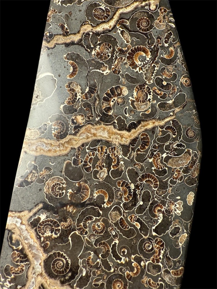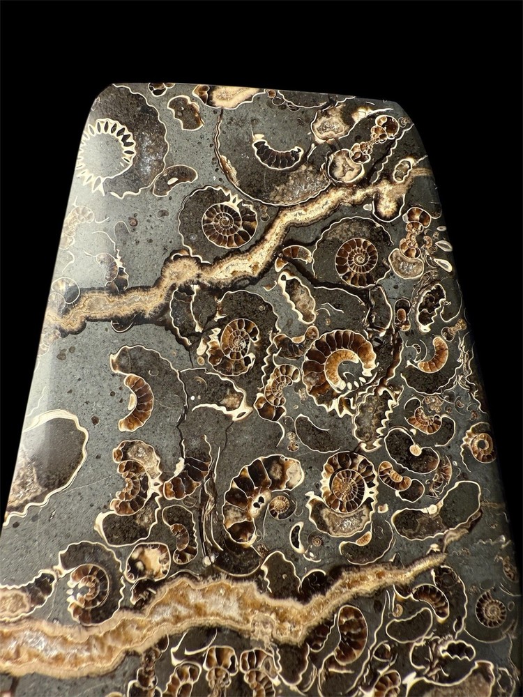 A grade + Polished slab of ammonite deathbed from Marston Magna. Very rare to get a piece this quality these days. Jurassic - 200 million years old Measures - 23.5cm x 10.7cm