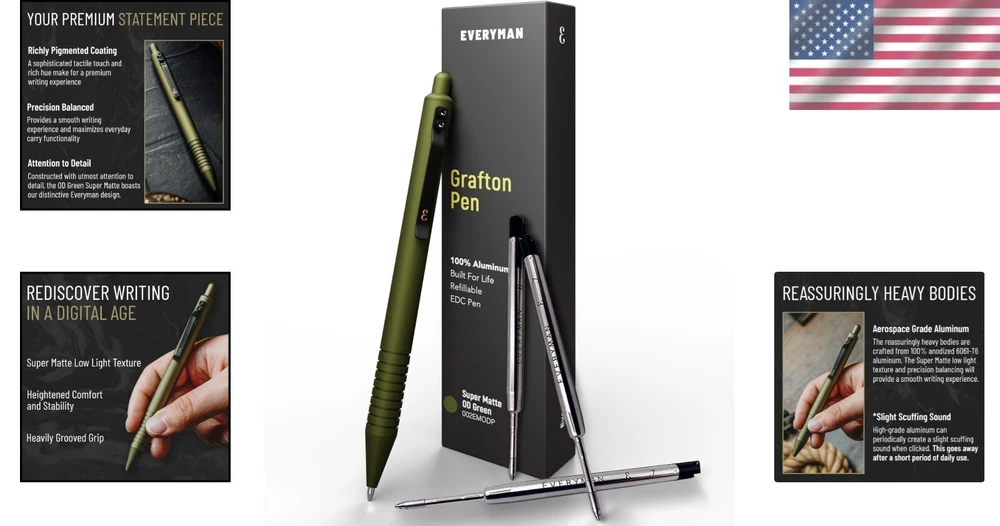 Premium OD Green Grafton Pen Bundle with 3 Black Gel Refills - Ideal for Gifts ‹ › ‹ › ‹ › ‹ › ‹ › ‹ › ‹ › ‹ › ‹ › Premium OD Green Grafton Pen Bundle Includes 3 Black Gel Refills - Ideal for Gifts! Features: Premium Construction: Crafted from 100% anodized 6061-T6 aluminum which not only gives a reassuringly heavy feel but also ensures unparalleled durability and longevity. Enhanced Comfort: Designed for effortless writing, featuring a deep-groove grip and an expertly weighted body that offers stability and comfort during prolonged use. Versatile Compatibility: Accommodates included Grafton ink refills (.7mm) as well as most competitor refill cartridges for enhanced usability. Thoughtful Gift Option: A perfect gift for writers or anyone who cherishes high-quality writing instruments; destined to become a staple in the office or a treasured family heirloom. Lightweight Design: Weighs just 1 oz, combining sturdiness with portability, making it ideal for everyday carry (EDC) while ensuring an exceptional writing experience. Why Choose the Premium Grafton Pen? Elevate your writing experience with the Premium OD Green Grafton Pen Bundle. The impeccable craftsmanship of this pen, made from high-grade aluminum, not only promises longevity but also adds a touch of sophistication to your every stroke. Its perfectly balanced design and comfortable grip make it a delight to use, whether you're jotting down notes or penning your next masterpiece. Gift the essence of quality with this exquisite pen bundle that is not just a tool but a statement piece. Perfect for professionals, students, or anyone who appreciates fine writing instruments, this pen is sure to impress. Don't wait—secure your Grafton Pen Bundle today and experience writing like never before! Shipping Free & Fast Shipping - We offer free shipping to most of the USA with a normal delivery time of 3-7 days. However, due to the current situation, additional delivery time (up to 3 weeks) may be required for some items. Alternative Carriers - We may use alternative carriers (e.g. USPS, FedEx, UPS, etc.) to ensure your package arrives safely and on time. Due to the use of multiple carriers, we are unable to provide a tracking number automatically. Handling Time - Orders are processed and shipped within 1-2 business days of receiving cleared payment. Shipping Restrictions - Shipping to Alaska, Hawaii, Puerto Rico, Guam, and other US territories may incur shipping charges or delivery restrictions. Please contact us before ordering, or your order can be refunded/cancelled. State Restrictions - There may be restrictions based on your state of purchase. For example, certain items may not be shipped to California due to state regulations. Contact for Tracking Updates - If you require tracking updates or have any concerns about the delivery of your order, please feel free to contact us, and we will be happy to assist you. Return 30-Day Hassle-Free Returns - We want you to be completely satisfied with your purchase. If you are not, you can return the item within 30 days of receiving it for a full refund or exchange. Easy Return Process - To start a return, simply contact us and we will provide you with a prepaid return shipping label and detailed instructions. Restocking Fee - There are no restocking fees for returns. However, the buyer is responsible for return shipping costs if the return is not due to a seller's error. Refund Processing Time - Refunds will be processed within 5 business days of receiving the returned item in its original condition. Payment We accept all major credit cards, PayPal, and Apple Pay for your convenience. Your payment information is secure and encrypted to ensure a safe and seamless transaction. Please complete your payment within 3 days of purchase to avoid any delays in shipping. Feedback Your feedback is extremely important to us. We strive to provide the best products and customer service possible. If you are satisfied with your purchase, please take a moment to leave us a positive review. If you have any concerns or issues with your order, please contact us before leaving negative feedback. We are committed to resolving any problems and ensuring your satisfaction. Contact Us If you have any questions or concerns, please feel free to reach out to our customer support team. You can contact us through the eBay messaging system. We are available Monday to Friday, 9:00 am to 5:00 pm EST, and we will do our best to respond to your inquiry within 24 hours. Buy it now and enjoy a pleasant shopping experience! Features: Deep-Groove Grip,Weighted Body,Versatile Compatibility,Stylish Matte Finish,Durability,Lightweight Design,EDC (Everyday Carry),100% Anodized 6061-T6 Aluminum,Enhanced Comfort,Compatible with competitor refills,Ideal for office gift,Portable design,Reassuringly heavy feel,Suitable for adult use Brand: Unbranded Material: Aluminum Ink Color: Black Country/Region of Manufacture: Not Set Vintage: Not Set Handmade: Not Set Personalized: Not Set