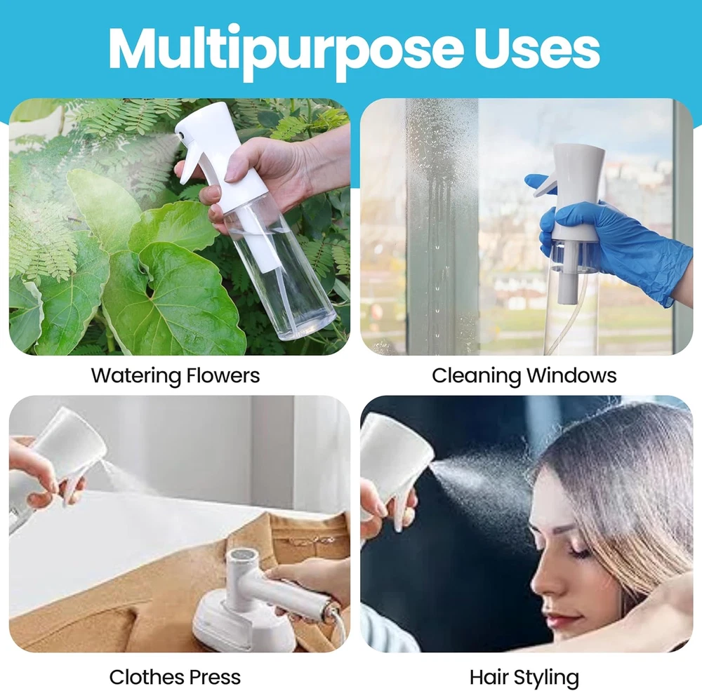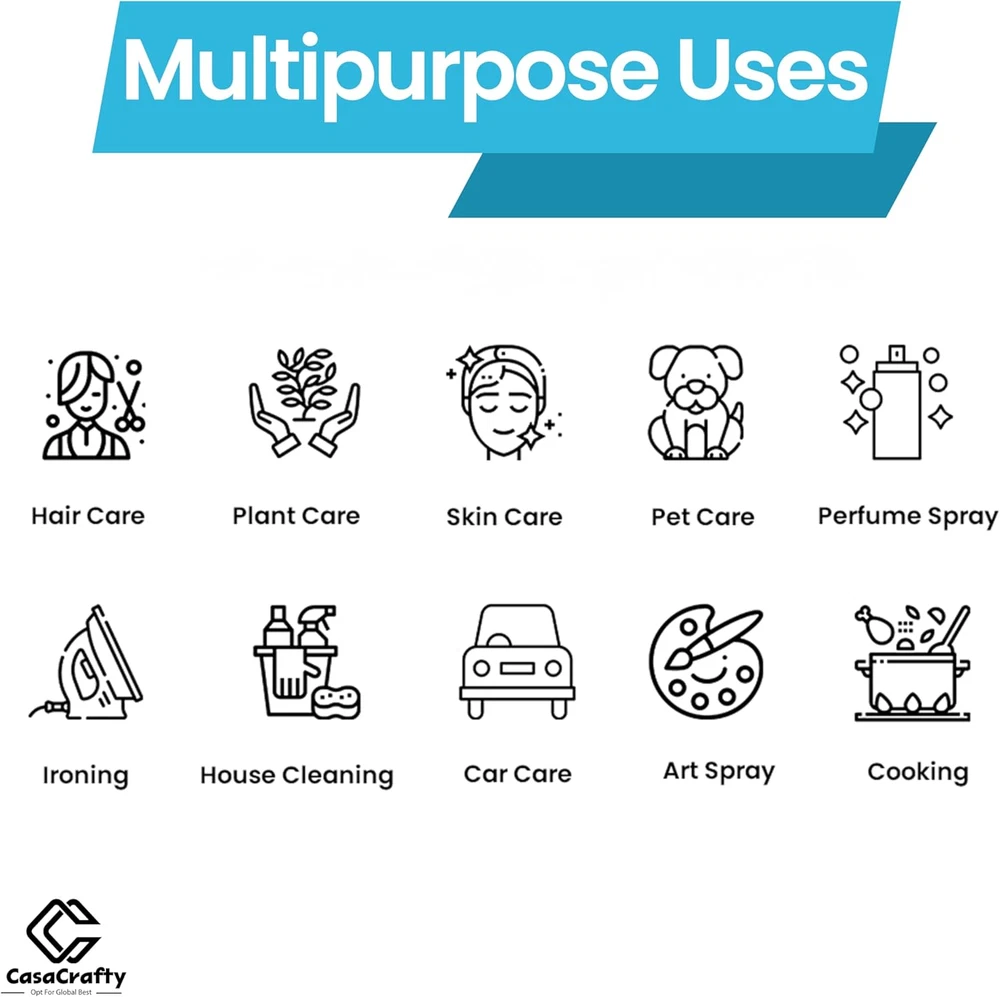 PRO-DESIGN: The expertly crafted Casacrafty spray bottle continues to redefine excellence in the spray industry. Featuring an elegant design and advanced engineering, it uses robust pre-compression technology to deliver a continuous, 0.3mm ultra-fine mist that lasts up to 1 second. With multiple full-trigger strokes, it ensures smooth, consistent, and effortless spraying every time. LEAK-PROOF & 360° SPRAY FUNCTIONALITY: Designed with a secure threaded mouth and a reliable leak-proof seal, our innovative spray bottle keeps liquids contained without any mess. Enjoy effortless 360-degree spraying, perfect for reaching tricky spots and evenly covering large surfaces with ease. MULTI-PURPOSE WONDER: Versatile and practical, this ultra-fine mist spray bottle is perfect for countless tasks at home or on the go. Ideal for professional salon use or your daily hair and body care routine, it also excels in self-tanning, home cleaning, disinfecting, pet grooming, plant care, car detailing, arts and crafts, and so much more! SPRAY BOTTLE FOR HAIR: This fine mist spray bottle is perfect for styling, refreshing curls, or dampening hair evenly. With a continuous spray function and ergonomic design, it’s ideal for salons or daily use. Lightweight, leak-proof, and BPA-free, it’s a must-have for effortless hair care at home or on the go! SUSTAINABLE & REUSABLE: Made from durable PET materials, this mist spray bottle is designed for long-lasting use. It’s easy to refill and reuse, making it perfect for creating your own custom liquid blends at home. NOTE: Before first use, press the trigger 10 times to prime the system and begin spraying. For best performance, do not fill the bottle with thick or viscous liquids, as this may affect atomization quality. Product Description Easy Fill Press Mechanism Continuous Spray