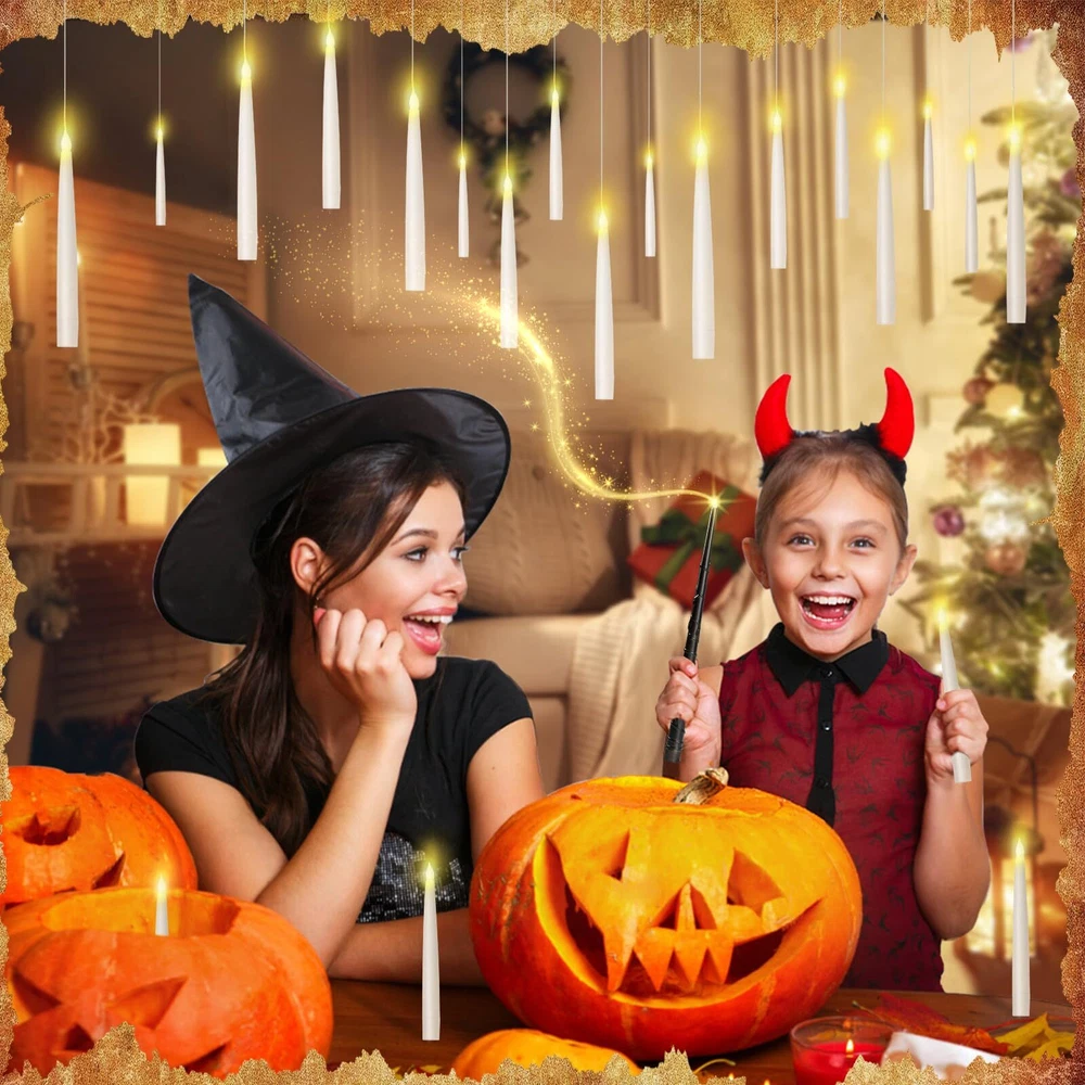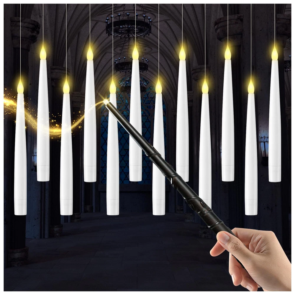 ENTER THE WORLD OF MAGIC - These 12 PCS of magic floating candles measure 0.6" (D) x 6.6" (H), have 20 hooks, and a 13" magic wand remote control that allows you to control the candles with a touch of fun and fantasy. Use your children's imagination to light Halloween candles with spells and hone their wand skills while competing to be the most powerful wizard. SAFE FLOATING CANDLES - Floating candles with wand use advanced 3D flickering technology that perfectly simulates the jumping and flickering of real flames. No need to worry about the risk of starting a fire or melting candles, this Halloween candle is perfect for families with pets and children, allowing you to enjoy the warm light while keeping your family safe. Powered by AAA batteries, they are decorative and more environmentally friendly. EASY HANGING DESIGN - Each candles comes pre-attached with string, making the installation easy. Simply tie the fishing line to the hook and attach the hook to the ceiling to hang the candles straight and evenly, our hanging candles can easily create a magical levitation visual effect on ceilings, walls, porches, shelves, or tables anywhere. Whether candles for holiday decorations or everyday accents. HALLOWEEN DECOR - Floating candles light up at parties, on porches, and in living rooms to add a touch of glamour to your home decor, parties, weddings, or any special occasion. Fixed on windows, walls or cabinets, perfect for holiday decorations, church services, window candles, fireplaces, tables, and home and outdoor decorations for room decorations. Halloween candles create a warm, comfortable living environment for you. EXCLUSIVE MAGICAL EXPERIENCE - This set of floating candles with remote is designed for magic lovers, suitable for Potter fans or curious children and adults about the magical world, whether it's the mystery of Halloween, cozy Christmas, celebrating birthdays or hosting a movie-themed party, these floating candles are the ideal gift for them. A unique magical experience for your loved ones, this flameless candle is a tribute to the Harry Potter series.