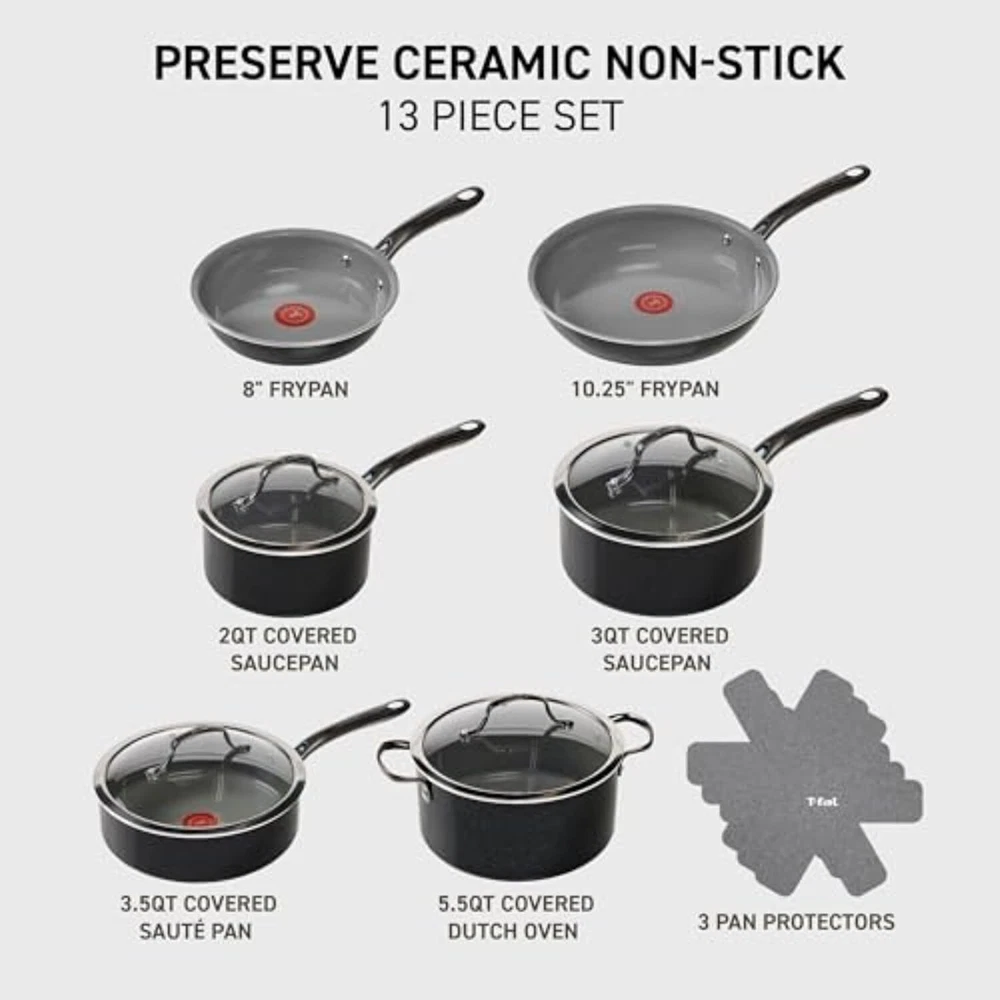 ๐๐ฅ๐ญ๐ข๐ฆ๐๐ญ๐ ๐๐จ๐ง๐ฏ๐๐ง๐ข๐๐ง๐๐: This cookware is oven-safe up to 350ยฐ and features an even heat base that prevents hot spots. Plus, it is compatible with all cooktops, excluding induction. Thermo-Spot technology indicates when the pans are perfectly preheated to start cooking. Hand-wash is recommended. ๐๐จ๐จ๐ค ๐ข๐ง ๐๐ญ๐ฒ๐ฅ๐: Elevate your kitchen's aesthetics with a sleek glossy finish on your pots and pans, made possible with GlossTech by T-fal. Plus, with metallic finish stainless steel handles, you'll enjoy a of sophistication and comfort every time you cook! ๐๐ฅ๐ฅ ๐๐จ๐ฎ ๐๐๐๐: This set comes with 8.5 inch and 11 inch frypans, 2.3 quart and 3 quart saucepans with lids, 3.5 quart sautรฉpan with lid, 5.7 quart dutch oven with lid and 3 pan protectors to prevent scratches on the cooking surface while storing. ๐๐ง๐จ๐๐๐ซ๐๐ฆ ๐๐ฅ๐ข๐๐ ๐๐๐๐ก๐ง๐จ๐ฅ๐จ๐ ๐ฒ: Experience ultra-smooth gliding paired with a 20x harder surface for exceptional durability compared to T-fal's basic nonstick coating. On Dec 12, 2024 at 18:30:44 PST, seller added the following information: