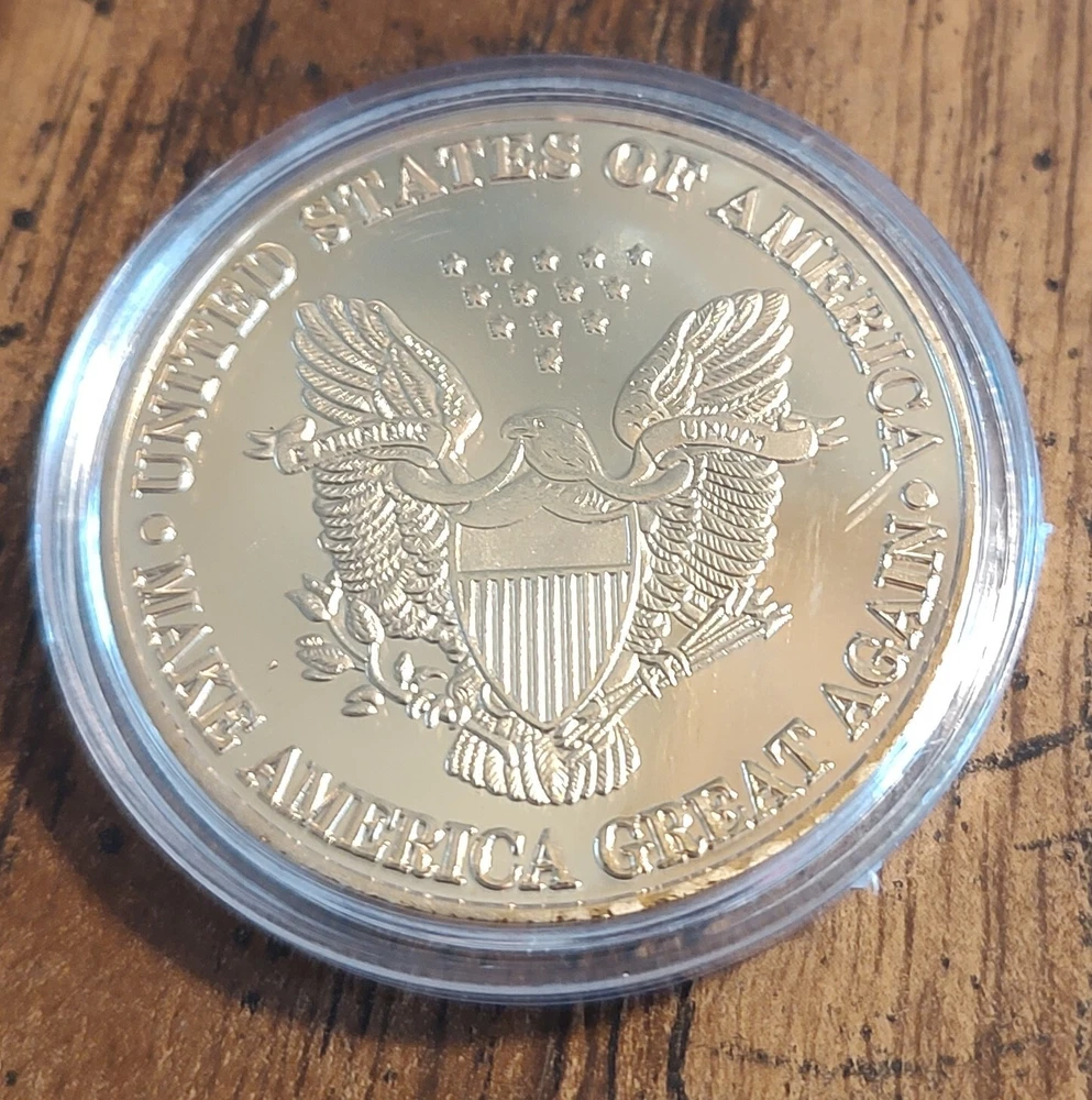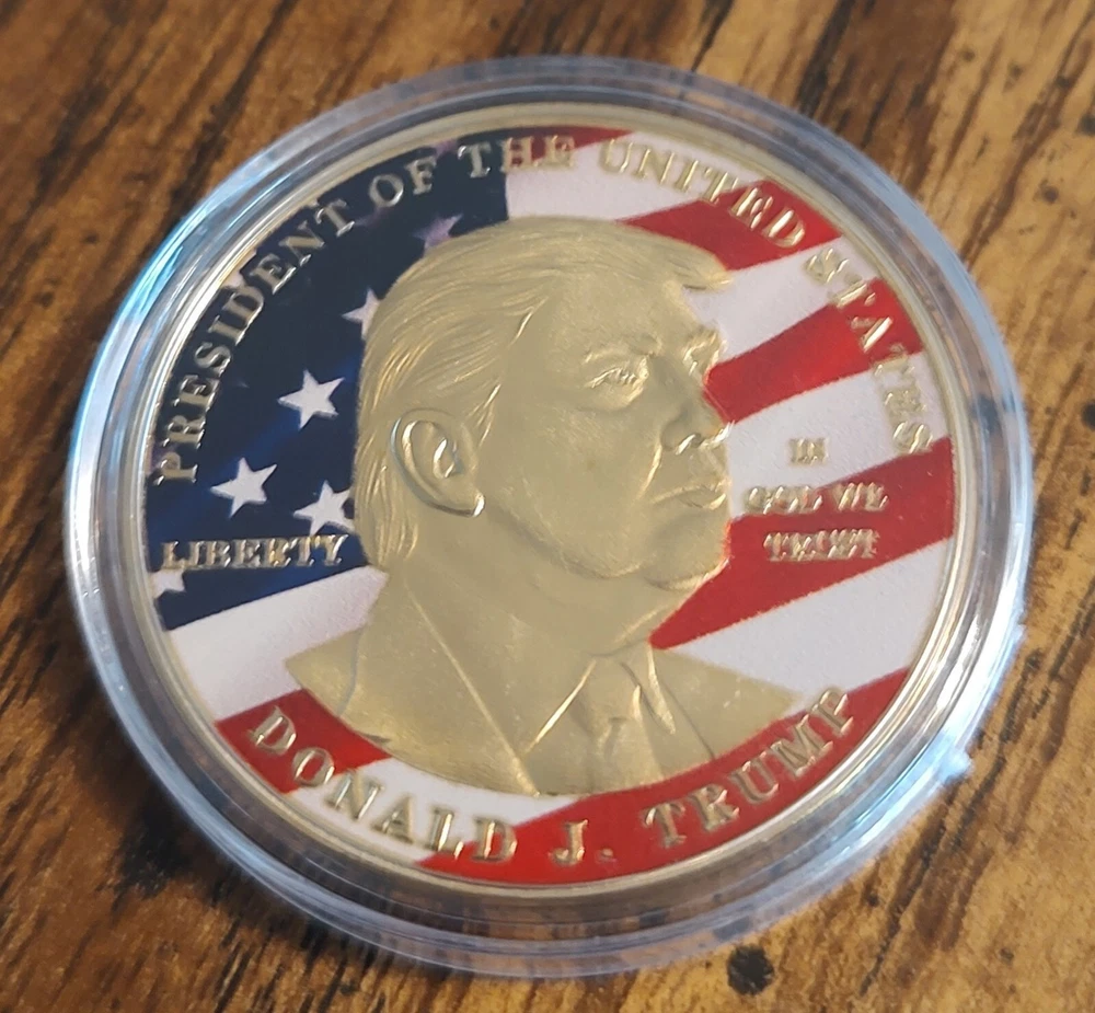 This commemorative coin features President Trump with a gold tone finish. It comes in a decorative box for display. The coin is made of alloy with an uncirculated condition. No certification is included. Perfect for collectors of world coins and presidential memorabilia. Don't miss out on owning a piece of history!