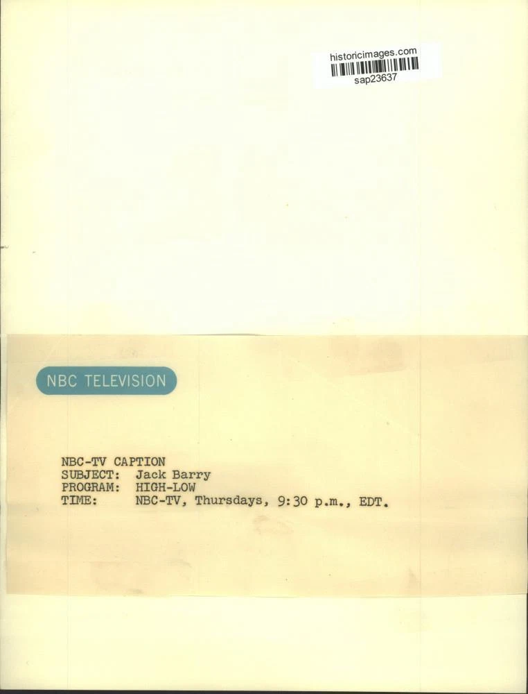 ebay template Note: Please study the images carefully to determine the condition of this vintage photograph, as it may not be in perfect condition. It may contain wrinkles, cracks, and possibly even tears due to its age and how it was handled before it got to us. A scanner may interpret colors and contrast differently than human eyes will, so it is possible that the actual photograph may be slightly darker or lighter in person. This vintage photograph is offered for sale as a collectible item and conveys no transfer of copyright. Press Photo Entertainer Jack Barry in "High-Low" on NBC Television - sap23637 This is an original press photo. Entertainer Jack Barry in "High-Low" on NBC Television Photo measures 7 x 9.25 inches. Photo is dated --None. PHOTO FRONT PHOTO BACK Historic Images Part Number: sap23637 Sell Smarter with Kyozou. Inventory and Ecommerce Management