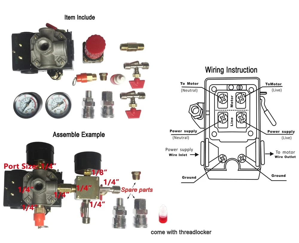 90-120PSI Air Compressor Pressure Switch Manifold Regulator Gauges Specifications: Auto control. Cut off at 120PSI, Turn on at 90PSI Voltage: 110V-240V Max AMP Rating: 16A Pressure range: 90-120 PSI Package Include: 1x pressure switch 2x Gauges 2x brass coupler 1x safety valve 1x manifold 1x threadlocker Auto control. Cut off at 120PSI, Turn on at 90PSI. Port Size of the Switch: 1/4" NPT, 4 Female Ports ADJUSTABLE AIR OUT: air pressure from of the brass coupler is adjustable Heavy duty Air Compressor Pressure Switch + Valve Gauges Regulator Thick material makes solid quality manifold Comes with threadlocker. Easy to use, easy to assemble