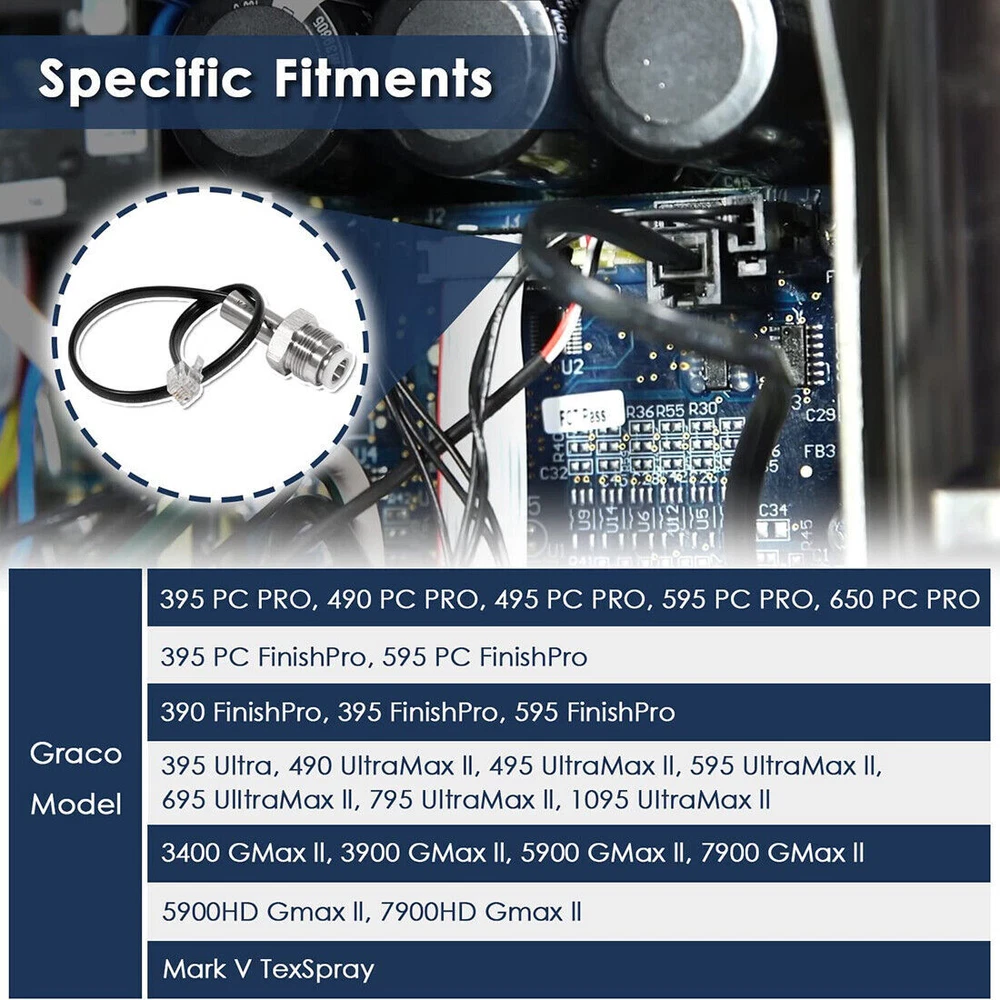 243222 airless paint sprayer pressure sensor is compatible with most Graco airless paint sprayers. Models are: 190ES, Ultra Models -210ES,210PC,230PC,295ST;UltraMax and UltraMax II-390, 395, 490, 495, 595;UltraMax and UltraMax II -695, 795, 1095, 1595;PC Pro- 390 395 490 495 595 695 795 1095 1595;GMAX and GMAX II -3400, 3900, 5900, 7900;Linelazers-3400, 3900, 5900, 7900. Please note: This product is compatible with Graco sprayers and is not compatible with Titan sprayers. 243222 airless sprayer pressure sensor is made of good materials and has excellent durability for better connection to high pressure filters and control panels. Sprayer Pressure Transducer adopt preciseness compensation technology and sensitive components, bear high volumes from 6bar to 6000bar.Replaceable Part Number: 243222. 243222 airless sprayer pressure sensor is connected between the high pressure filter and the control board. The sensor is sending a signal to the control board, and the control board uses that information to know when the sprayer has reached maximum pressure. Excessive pressure can cause the sensor to cause an error code to appear on your digital display, a timely reminder to replace or report an error. Over-pressurized machines can cause dangerous burst paint lines or damage to other components, such as pumps or drain valves. Sensor failure in Graco airless paint sprayers is a common occurrence; sensors are not repairable and they must be replaced. Guarantee:If you're not 100% satisfied with this Tools, simply return it for a full refund in 60 days.Premium Support & 24 Months Warranty.