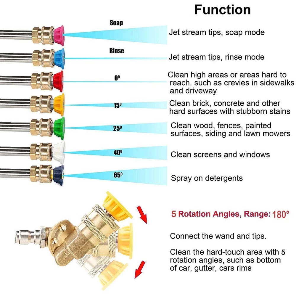 Universal pressure washer accessories fit most leading brands. Ideal for cleaning gutters, the underside of motor vehicles, watering plants, and cleaning hard-to-reach areas etc. 1.The universal pressure washer accessories have 7 Spray Nozzle Tips and 180 Degree Quick Connect Pivoting Coupler (Pivot Coupler), fit most leading brands of high pressure washer wands up to 4,500 PSI. 2.Including 1 pc Quick Connecting Pivoting Coupler to connect between the wand and nozzle tips. Pivot Coupler can adjust 180 degree for 5 different cleaning angles to get hard to reach areas, such as the bottom of your car, cars rims and gutter Nozzle Specifications: 1. Reddish orange pressure washer tip offer soap mode and blue offer rinse mode; 2. The other 5 tips have different angle degrees, 0, 15, 25, 40, 65. 3. Material: PA66 nozzle cover, stainless steel tips; 4. 1/4 Quick connection design; 5. High pressure: up to 4,500 PSI ; 6. Attached to a quick-connect wand or coupler. Reddish orange pressure washer tip offer soap mode and blue offer rinse mode; The other 5 tips have different angle degrees, 0, 15, 25, 40, 65. Material: PA66 nozzle cover, stainless steel tips; 1/4 Quick connection design; High pressure: up to 4,500 PSI Attached to a quick-connect wand or coupler.