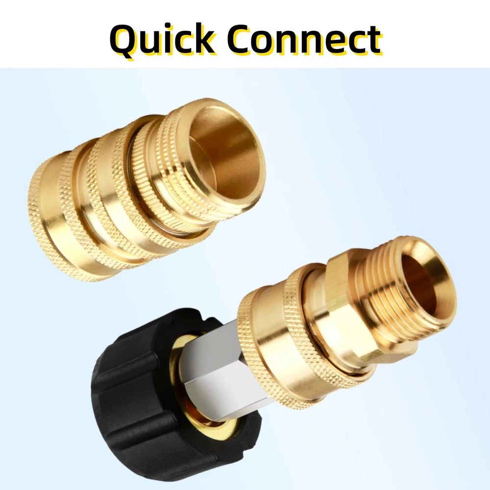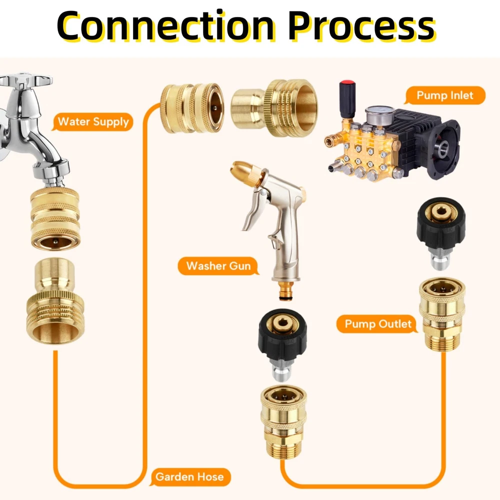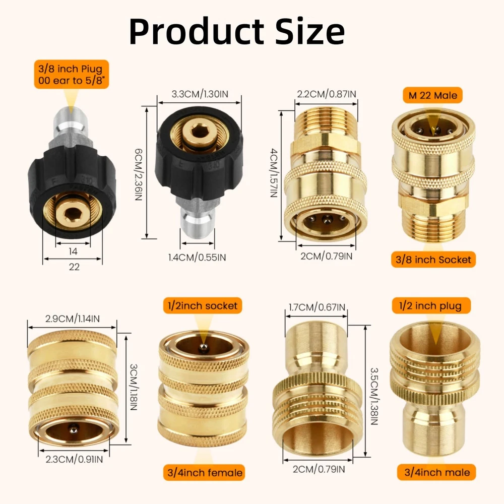 Pressure Washer Adapter Set Package:This pressure washer adapter set includes a variety of connectors. 2 pack M22-14 swivels + 3/8" plugs, 2 pack 3/8" quick disconnects + M22-14 males, 2 pack 3/4" female + 1/2" quick connects, and 2 pack 1/2" plug+ 3/4" male, ensuring versatile compatibility Attention to Fitting Size: Note that the M22-14 swivel has a 14mm fitting (inside diameter). It is crucial to verify your fitting size, as a 15mm fitting may lead to leaks and is not with this adapter set. And not fit some pressure washer with M22 15mm fitting Effortless Connection and Disconnection: The quick connectors enable easy attachment and detachment between the pressure washer pump and hose. sets connect the pump outlet to the pressure washer hose or the cleaning hose to the , while the other kits convert 3/4" threads into quick release connectors for standard 3/4" garden hoses to connect to the washer pump inlet Long-Lasting Construction: Crafted from premium brass, these adapters are designed to resist wear and tear, ensuring they maintain their integrity and performance over time, making them ideal for frequent outdoor use High Pressure Resistance:Built to withstand demanding conditions, this adapter set supports working pressures up to 5,000 PSI, ensuring reliable performance for heavy-duty pressure washing applications