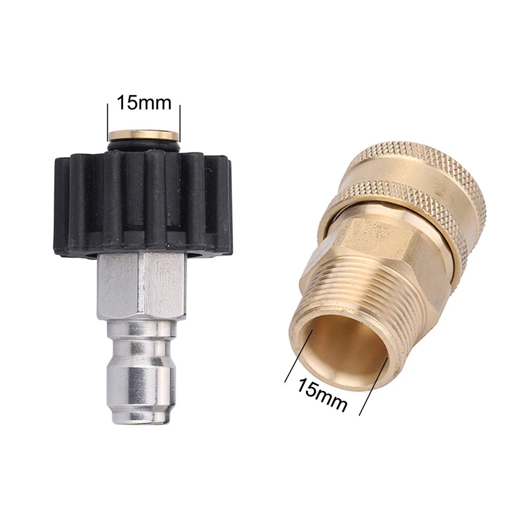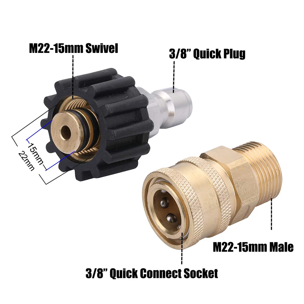 Pressure Washer Adapter SELL 15mm FITTING, NOT 14mm. It fits pressure washer of Sun Joe, Campbell, MI-T-M, AR Blue, Stanley, Cleanforce, Simoniz. If your fitting is 14mm, it may cause leakage. M22 15mm swivel + 3/8” plug, 3/8” quick disconnect + M22 15mm male. Convert the M22 thread-on couplings to a 3/8 inch quick connector. Apply on universal , hose and pump connection. Easy to connect and disconnect. Working Pressure is up to 5,000 PSI. Provides secure and quick fittings, simple to assemble and disassemble