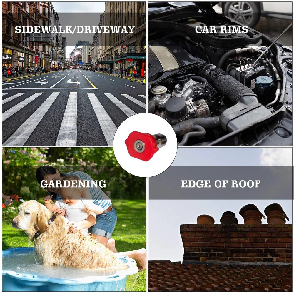 Package: Include 7 pack 15" high quality pressure washer wands, 5.9" 30°, 90° and U shape curved wands, 6 different sizes nozzle tips and 10 replacement rings. Material: pressure washer extension wand are made of solid brass and stainless steel. Maximum Working pressure: 4000 PSI. Maximum Working temperature: 140 ℉. 6 spray nozzle tips: 1/4" quick connector spray nozzle tips are for different use: 0, 15, 25, 40, 60 degree and soap nozzles. The various sizes can be used for most cleaning jobs. Connector: the size of the end of the extension wand is 1/4" quick conncetor, fit for all pressure washers with 1/4" quick conncetor. 4 types of extension wand: Come with 4 types of pressure washer extension wand, including 30°, 90°, U shape and straight wand, suit for cleaning, roof, wall, gutter, floor, corner, etc.