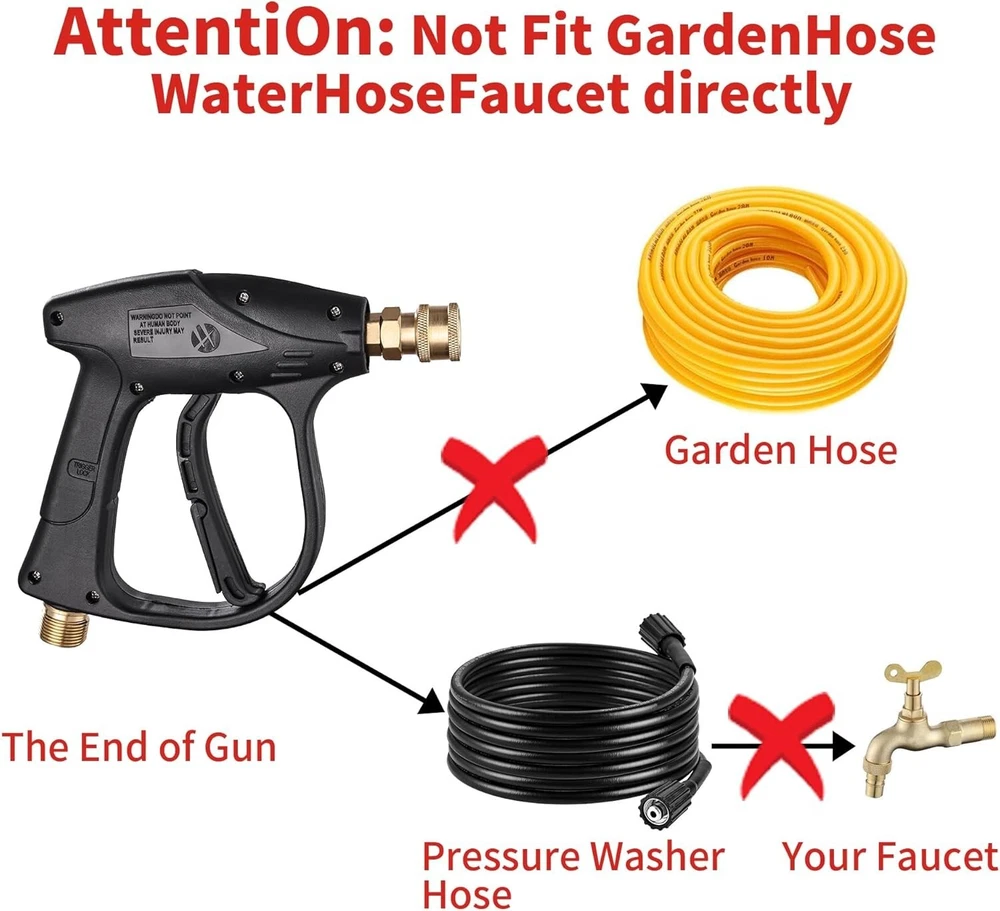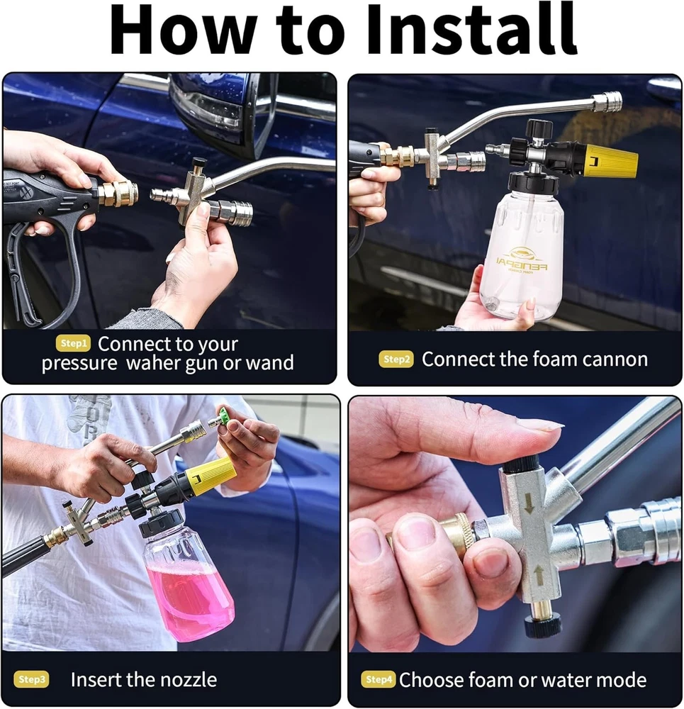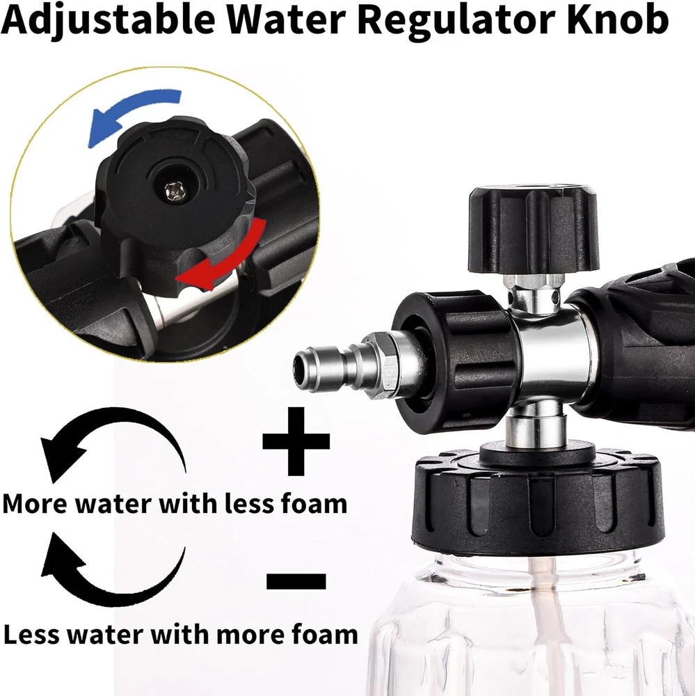 Pressure Washer Foam Cannon Gun Kit with Dual Connector Accessory, Car Wash Foam Gun for Car Washing and Cleaning, 1/4" Quick Connect with 7pcs Nozzles, Dual Adjustable Snow Foam Lance Dual Connector Foam Cannon: Our pressure washer foam cannon features a unique design with two different connector ends - a longer one for the power washer nozzle to water washing and a shorter one for the snow foam cannon to foam washing. This design simplifies the use process, easily switch between water and foam modes, improves efficiency Snow Foam Cannon with Short Gun: 1 Liter / gallon snow foam cannon with a detachable 1/4'' quick connector and a pressure washer short gun, you can choice the connector according to your pressure washer gun. Turn the top knob right (-) and the top knob left (+) to adjust to the desired foam level, adjust nozzle to control the spray area and horizontal/vertical 7 Spray Nozzles: Each nozzle orifice size is , different nozzles have different spray angle (0, 15, 25, 40, 65 degree, Risen and Soap). According to your cleaning purpose, choose different nozzle, washing car, garden, roof or more, universal 1/4’’quick connector. Tips: Please make sure that the nozzle is clean; If there is no enough water, release the gas after you add water, it will not work normally Widely Use: Constructed from premium-grade materials, our power washer foam cannon connector promises exceptional durability and reliability for prolonged use. Which is widely used for various cleaning applications, such as motorcycle, car, roofs, driveways, floors, windows washing. And more helpful for detailing Trucks or SUVs What You Get: Our snow foam cannon working pressure is 1000 psi to 3600 psi. Additional orifice nozzle is included for improved performance. Package contains a dual-purpose switch spray gun, a spray bottle for easy detergent mixing, a pressure washer gun for precise control, and 7 power washer sprayer nozzles
