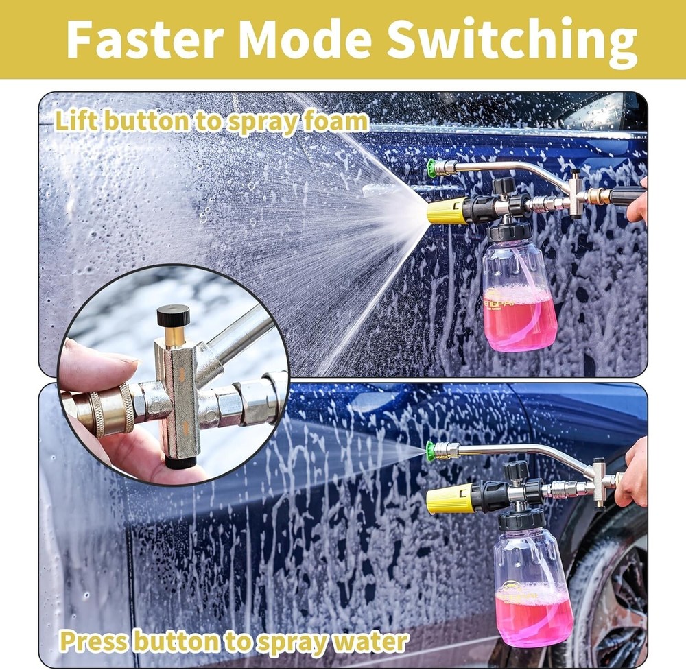 Pressure Washer Foam Cannon Gun Kit with Dual Connector Accessory, Car Wash Foam Gun for Car Washing and Cleaning, 1/4" Quick Connect with 7pcs Nozzles, Dual Adjustable Snow Foam Lance Dual Connector Foam Cannon: Our pressure washer foam cannon features a unique design with two different connector ends - a longer one for the power washer nozzle to water washing and a shorter one for the snow foam cannon to foam washing. This design simplifies the use process, easily switch between water and foam modes, improves efficiency Snow Foam Cannon with Short Gun: 1 Liter / gallon snow foam cannon with a detachable 1/4'' quick connector and a pressure washer short gun, you can choice the connector according to your pressure washer gun. Turn the top knob right (-) and the top knob left (+) to adjust to the desired foam level, adjust nozzle to control the spray area and horizontal/vertical 7 Spray Nozzles: Each nozzle orifice size is , different nozzles have different spray angle (0, 15, 25, 40, 65 degree, Risen and Soap). According to your cleaning purpose, choose different nozzle, washing car, garden, roof or more, universal 1/4’’quick connector. Tips: Please make sure that the nozzle is clean; If there is no enough water, release the gas after you add water, it will not work normally Widely Use: Constructed from premium-grade materials, our power washer foam cannon connector promises exceptional durability and reliability for prolonged use. Which is widely used for various cleaning applications, such as motorcycle, car, roofs, driveways, floors, windows washing. And more helpful for detailing Trucks or SUVs What You Get: Our snow foam cannon working pressure is 1000 psi to 3600 psi. Additional orifice nozzle is included for improved performance. Package contains a dual-purpose switch spray gun, a spray bottle for easy detergent mixing, a pressure washer gun for precise control, and 7 power washer sprayer nozzles