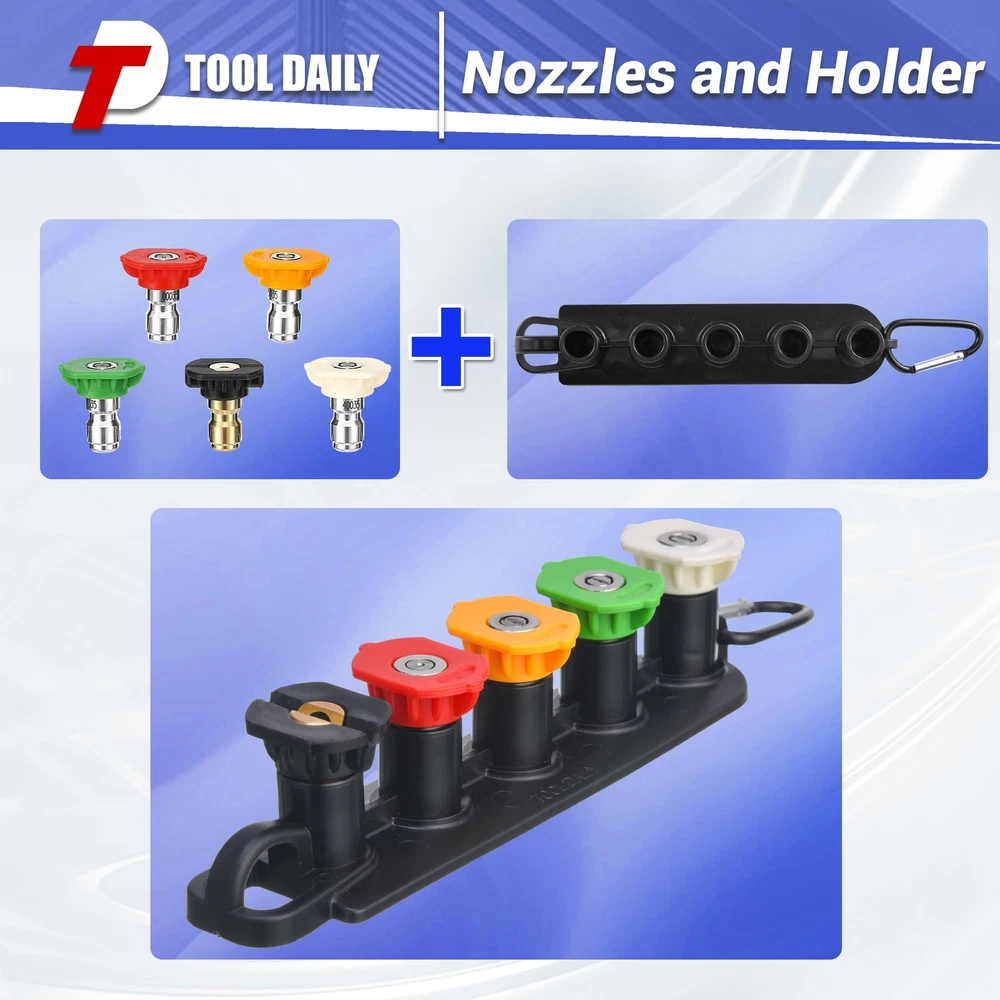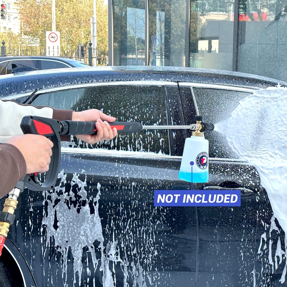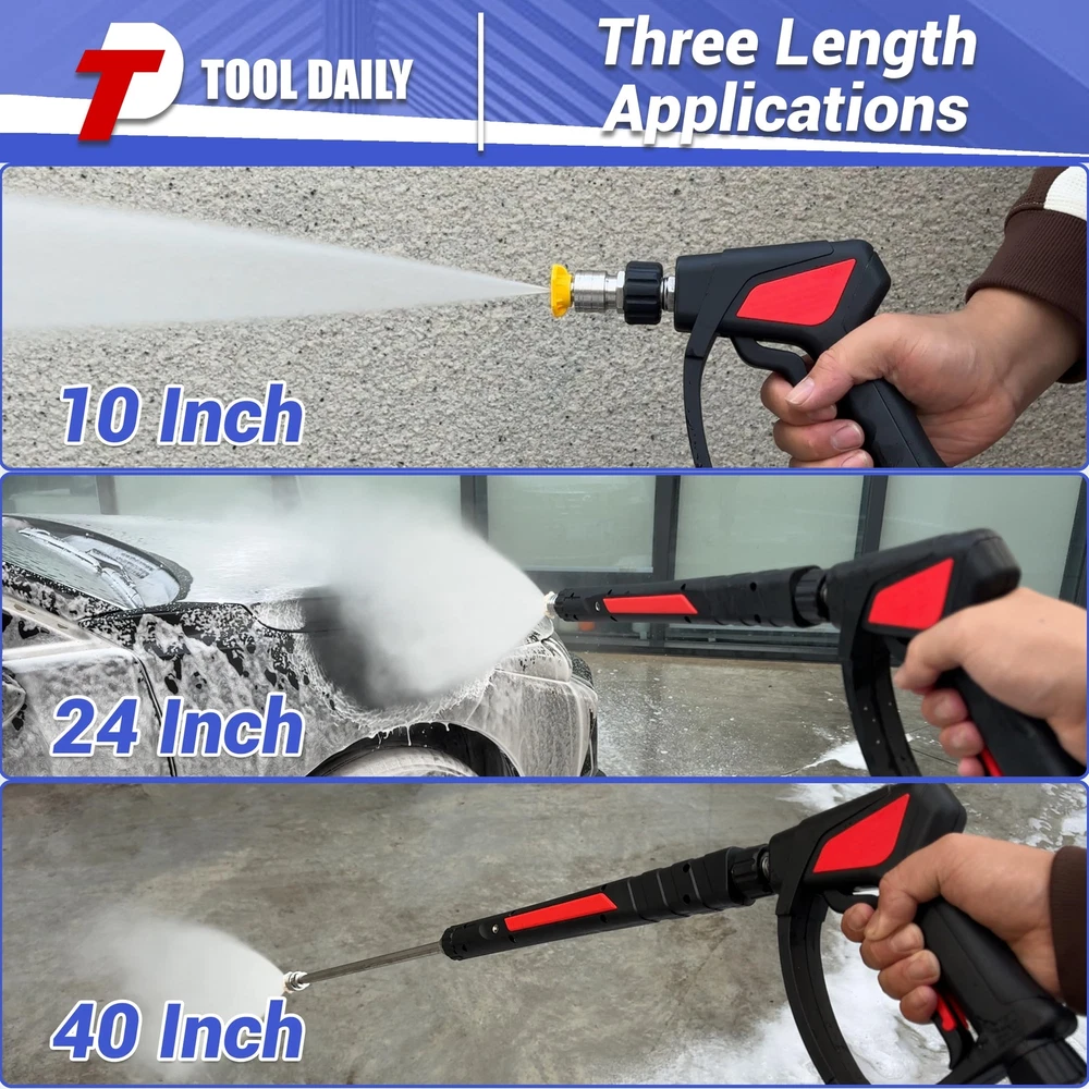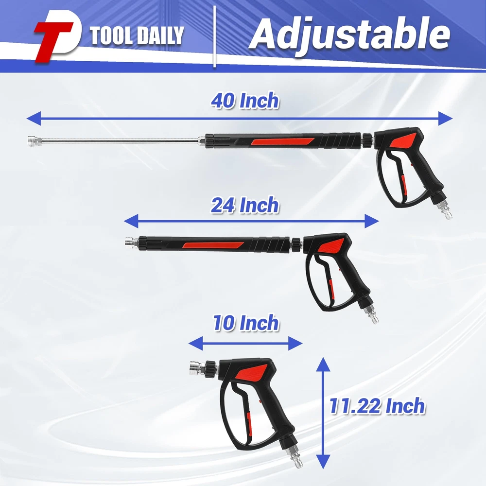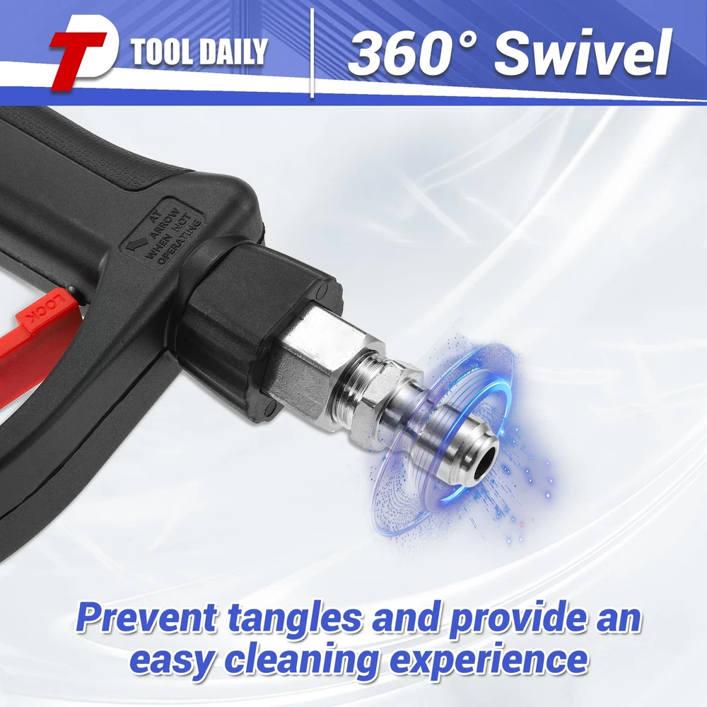 【Powerful and Efficient Cleaning】The pressure washer gun swivel delivers a maximum pressure of 5800 PSI and a water flow rate of 12 GPM. It is suitable for various scenarios such as different car models, urban roads, farm breeding grounds, and parks. With its impressive strength to break down and remove dirt, it ensures efficient completion of cleaning tasks while saving time and effort. 【Tangle-Free Swivel Connector】Our pressure washing gun is equipped with a unique swivel 3/8" quick connect fitting. Designed to handle cleaning tasks from various angles, it effectively prevents hose tangling, ensuring efficient and flexible cleaning. After use, it can be conveniently stored and organized. 【Flexible Extension Kit】To meet the high-pressure cleaning needs in various scenarios, our high pressure washer gun comes with a stainless steel extended lance and a 1-piece extension rod. With a maximum length of 40 inches, you can easily adjust the length according to your application requirements. 【Safe and Durable】- The extended lance and suction tube of our powerful cleaning machine are constructed with reinforced materials and stainless steel components, ensuring long-lasting leak-proof performance. The easy-to-pull trigger and comfortable grip are ergonomically designed to prevent hand fatigue during prolonged cleaning tasks. pressure washer spray gun is equipped with a safety trigger lock, preventing accidental operation during cleaning. 【Heat Resistant】Designed to withstand temperatures up to 320℉ (160℃), this pressure washer gun with swivel is capable of effortlessly tackling even the toughest grease and oil-based dirt. Its robust construction ensures optimal performance in challenging cleaning tasks. Pressure washer gun replacement is compatible with multiple high-pressure nozzles, foam cannons, surface cleaners, undercarriage cleaners, and other accessories, providing a wide range of cleaning options.