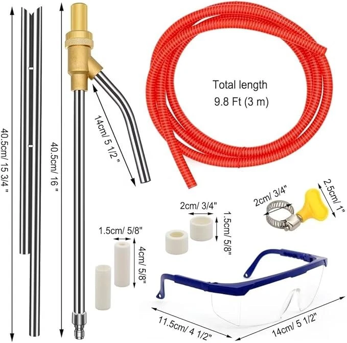 SANDBLASTING PACKAGING KITS: Our pressure washer sandblasting includes 3 m hose, 16 inch pressure washer wand (water input), 15 3/4 inch sand wand (sand input), a goggle, 4 hose clamps, 4 ceramic nozzles, and 2 rubber bands WORKING PRINCIPLE: The pressure sandblasting kit is used to inject sand into the water system for cleaning; Use dry silica sand, baking soda or washed river sand for better results APPLICATION: The pressure washer sandblaster kit is mainly used to remove rust, graffiti, paint and grease baking, and is ideal for household and factory abrasive cleaning UNIQUE PERFORMANCE: Sandblasting kits are made of materials, brass and stainless steel, which are resistant to corrosion, abrasion, and stable performance; It's working pressure can reach 5000PSI and the temperature can reach 60 ℃ / 140 ° F EASY to USE: 1/4 inch quick connector on the end of a gun, suitable for most pressure washer