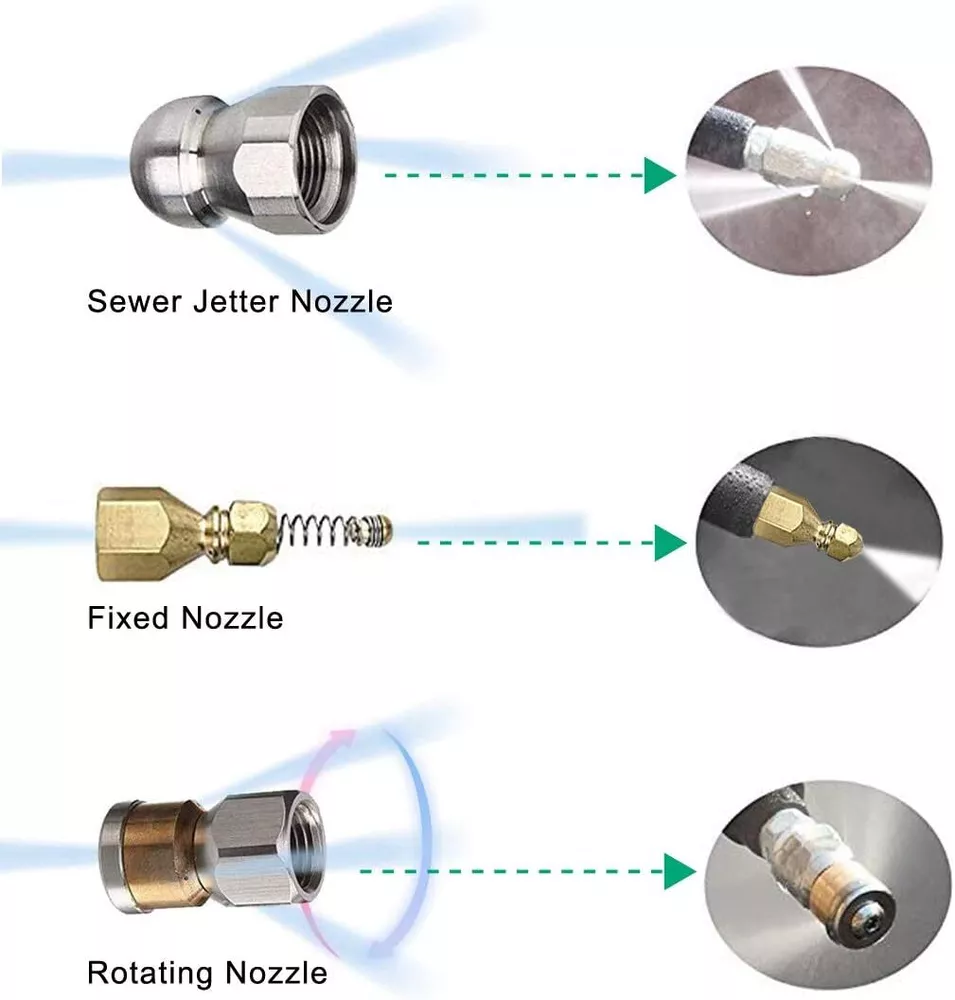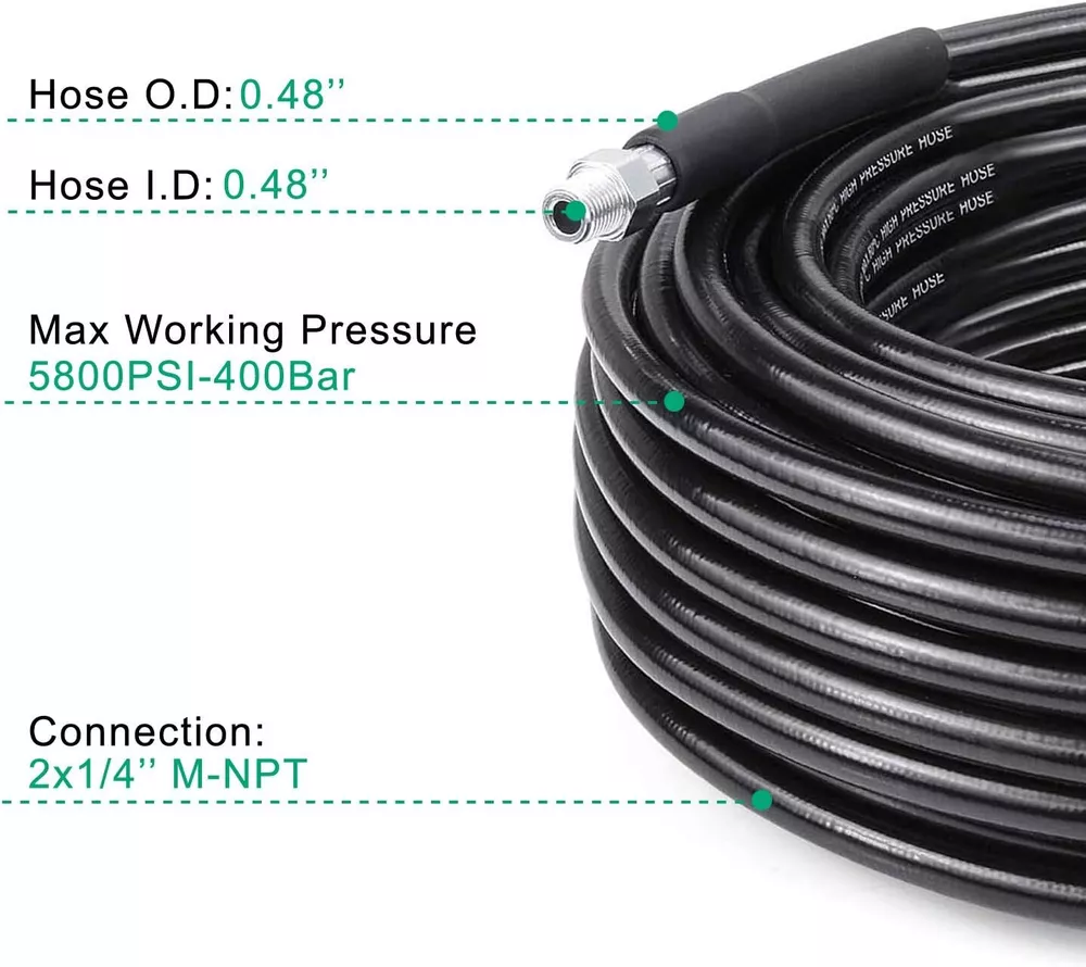 Product Description Pressure Washer Sewer Jetter Kit - 100Ft X1/4" Hydro Drain Jetter Cleaner Hose, Corner, Rotating and Button Nose Sewer Jetting Nozzle Waterproof Tape,Orifice 4.0 4.5,1/4 Inch NPT,5800 PSI SELKIE PRESSURE WASHER SEWER JETTER KIT INCLUDE: Sewer jet hose 100FT X1/4" ,button nose sewer jetter nozzle(front),button nose sewer jetter nozzle(corner),fixed nozzle,rotating sewer jet nozzle,1/4" quick coupler plug,coupler (female M22 to female 1/4" NPT) and waterproof tape.Sewer Jetter parts for Pressure Washer can help you unblock More types of indoor and outdoor drainage devices,combined with any brand of pressure washer,can easily flush obstructions.Working pressure is rated to 5800 PSI. DURABLE DRAIN JETTER HOSE: Sewer spray hose (Max 5800 PSI )has an inner tube, cover and reinforcement. The inner tube of the hose is made of thermoplastic polyester.Cover layer is made of thermoplastic polyurethane, which can resist oil, weather, ozone and abrasion. Reinforcement layer is 1/4" high tenacity polyester textile braid, which is chemically bonded. 6PCS SEWER JETTER NOZZLES: Ideal for general water pipe flushing and cleaning, provides excellent cleaning effect, clean soft sewer blocke. EASY TO USE: Both ends of the hose is 1/4“M-NPT, Sewer Jetter Kit equipped with M22-14 adapter and 1/4" quick connect plug, it can be easily applied to most pressure washer and gun. Nozzles are made of stainless steel or brass, not easy to break or rust. WIDELY APPLICATION: This pressure hose widely used to clean cars, motorcycles, floors, windows, driveways,roofs,siding, sink, toilet, outdoor, indoor and etc. Contact seller directly if any issues, Service Team will respond you within 24 hours during working days. always stand behind our products and customers. About Us We are a reputable seller with many years of experience selling on eBay. Our goal is to provide high-quality products and excellent customer service. Shipping Items will be shipped within 1-3 business days when we received payment. (Orders are not processed on weekends & holidays) Tracking information will be sent once item is shipped. Delivery time depends on destination and other factors Item is shipped to ebay address. Leaving correct address can minimize delay. For international shipping and shipping to Guam, Hawaii and Alaska, Please contact us before placing the order. International buyers please note: Import duties, taxes and charges are not included in the item price or shipping charges. These charges are buyer’s responsibility. We will try our best to reduce the risk of the custom duties. Local pick-up is unavailable at the moment. Contact Us We reply any email messages within 1 business / working days(off-duty at weekend). If you do not get a response from us, then please check your junk or spam mailbox. Our Business hours: Mon-Fri 9:00-18:00, UTC/GMT +8 hours. Please contact us either by clicking "contact seller" in the "purchase history" section or simply click "ask a question" at the bottom of this page. If you are unsatisfied with our item or service, please contact us before leaving any feedback. We are committed to resolve all issues in a friendly and satisfactory manner.