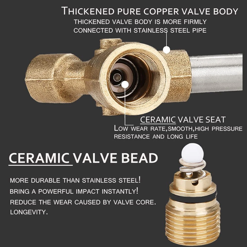 ✔5000 PSI Working Pressure. The highest pressure washer , ideal for homeowners and professionals, perfect design for car cleaning, windows washing, driveways, roofs, siding washing... ✔Ergonomic and Soft Pull desgin, reducing your hand fatigue operation. The features a locking safety handle to prevent accidental sprays. ✔5 pressure washer spray tips Included,Use for a wide range of spray patterns and applications ✔Universal for Most high pressure washers, with 3 adapters, easy connect to pressure washer hose with 3/8 NPT thread inlet fitting, Quick Connect 3/8” Pressure Washer Hose, M22-14mm Washer hose or M22-15mm Power Washer Hose. ★For pressure washer use only Not fit Garden Hose or Water hose. An extra teflon tape is included. ♦Please apply Teflon tape on all thread connections before use to avoid any leakage. ✔1/4" outlet quick disconnect fitting, connect all accessories to the with a 1/4 inch plug. Such as nozzle tip, pivot coupler, foam , extension wand, etc.