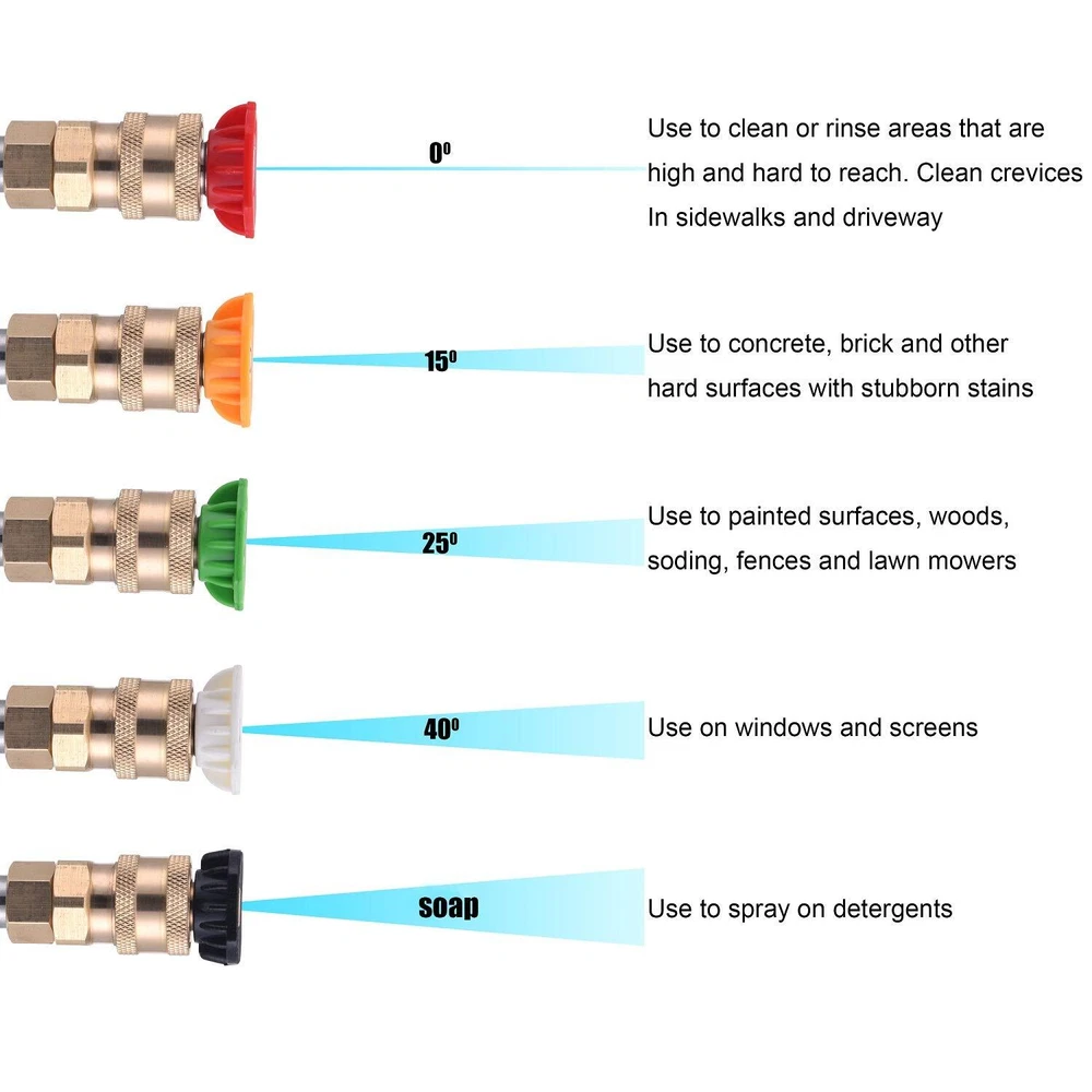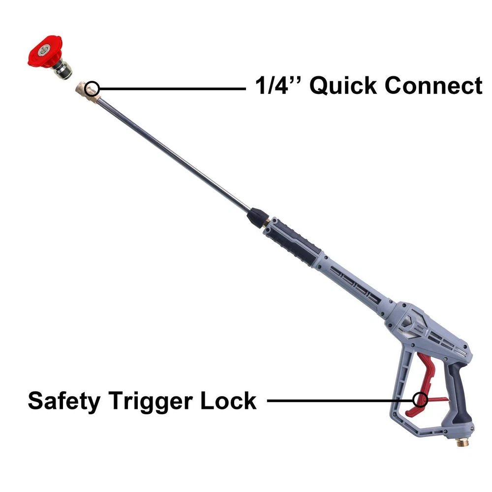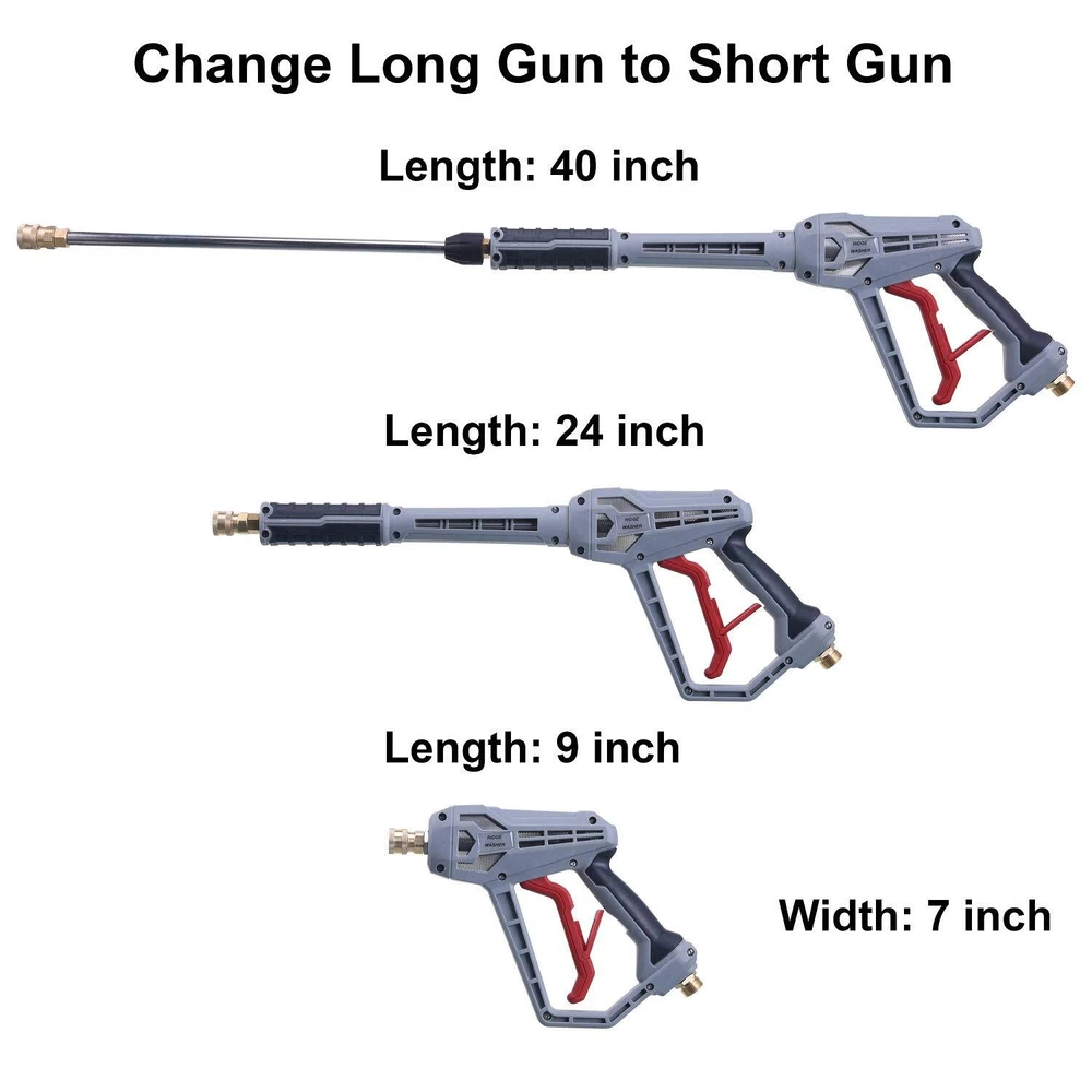WARM TIPS : Not Fit GardenHose or WaterHose!!! Power washer is designed for gas and pressure washer. Pressure washer 's Max Temperature is up to 60 ℃ ( 140 °F ). Max Flow Rate is up to 7 GPM. Max Pressure is up to 4500 PSI Pressure washer wand is suitable for pressure washer hose with M22 14 mm or M22 15 mm fitting. M22 14 mm fitting's pressure washer hose has Generac, Ryobi, Briggs Stratton, Craftsman, Simpson, Karcher; M22 15 mm fitting's power washer hose has , Excell, MI-T-M, Stanley, Campbell, AR Blue, Cleanforce, Simoniz. if your hose's M22 14 mm fitting, please connect pressure washer wand to hose directly. But if your hose's M22 15 mm fitting, you can connect brass coupler wand and hose Adjustable pressure washer handle's easy to change its length according to cleaning purpose by using wrench, has three different length: 9 inch, 24 inch, 40 inch. it meets your different needs. Pressure washer ’s comfortable handle and safety trigger lock is easier to operate 5 pcs Spray nozzles with NOZZLE HOLDER have different spray angle (0, 15, 25, 40, 65 degree). According to your cleaning purpose, choose suitable nozzle.Such as watering flowers or plants, washing car, fence or roof. Universal 1/4’’ quick connector is also designed for turbo nozzle, surface cleaner, water broom, undercarriage cleaner, pivoting coupler, foam cannon, pressure washer sandblasting kit, gutter cleaner attachment