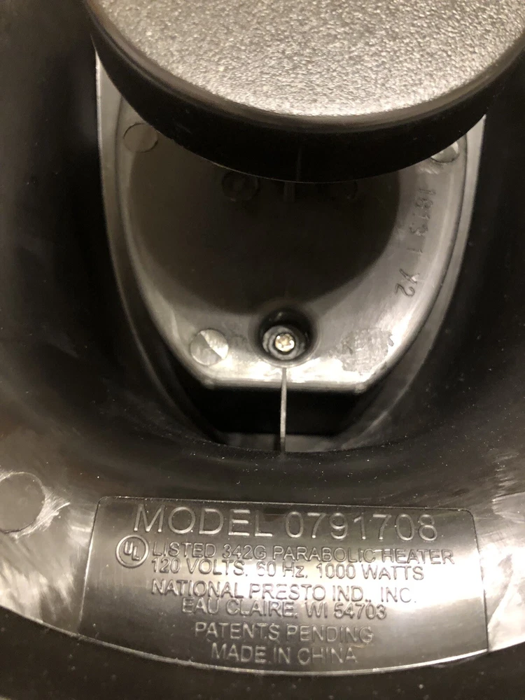 Area Covered:451-500 sq ftColor:BlackMPN:0792401Voltage:120 VBrand:PrestoPower Source:ElectricItem Width:16 inCountry/Region of Manufacture:ChinaControl Style:DialHeating System:RadiantMounting Location:Cabinet, Desk/Tabletop, FloorModel:0791708Item Depth:12 inItem Length:19 inHeating Element Material:SteelPower:1000 WFeatures:Auto Shut-off, Tip over shut offNumber of Heat Settings:3Type:Portable HeaterHeating Element Format:CoilMaterial:Aluminum, Steel, Plastic