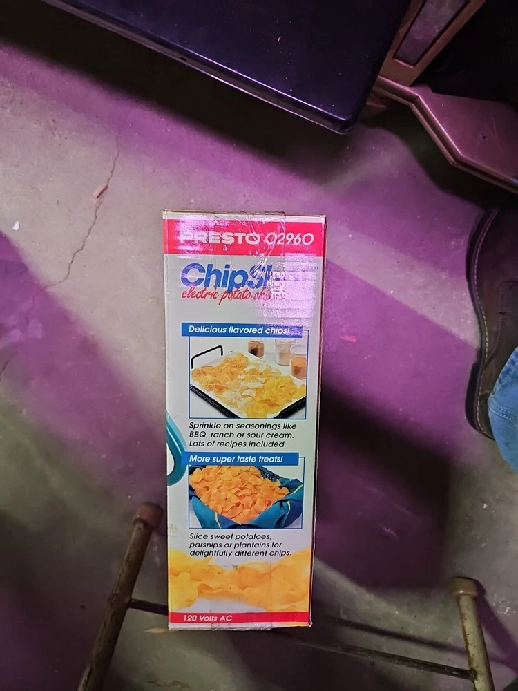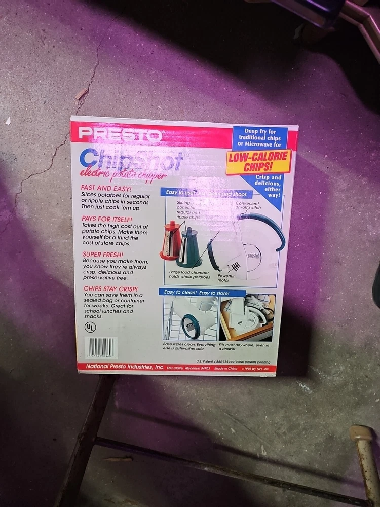 Introducing the Vintage Presto Chipshot Electric Potato Chipper, a versatile kitchen tool that peels, slices, and dices potatoes with ease. This machine comes in a sleek white color and is made of durable stainless steel and plastic. It features interchangeable blades/discs that allow you to create your favorite potato shapes and sizes. The Presto Chipshot is perfect for those who love to make their own potato chips at home. With this electric potato peeler and slicer, you can create thin or thick chips, and even create other snacks like French fries and potato sticks. The machine is easy to use and comes with a base, potato peeler, slicer, and interchangeable blades/discs.