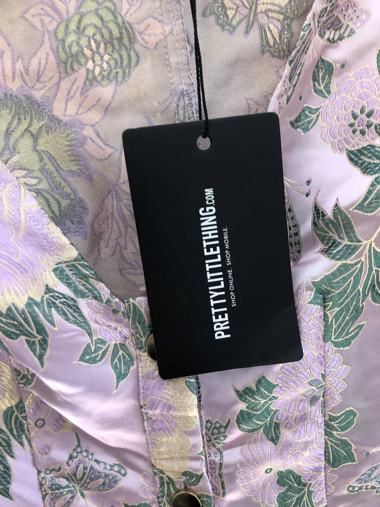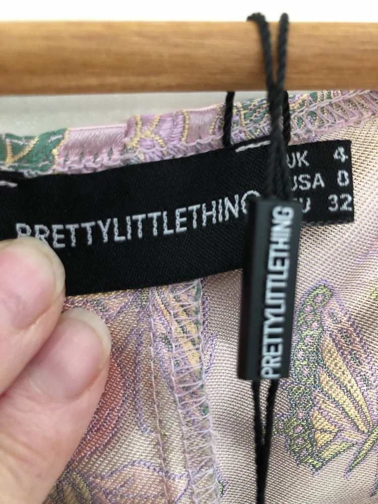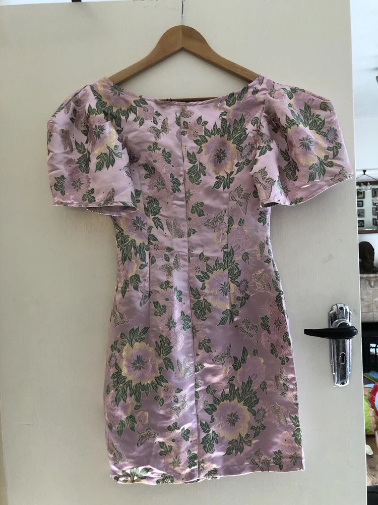 Stunning pink brocade floral/ butterfly design mini dress , with gold shiny buttons and angel sleeves.BNWT
