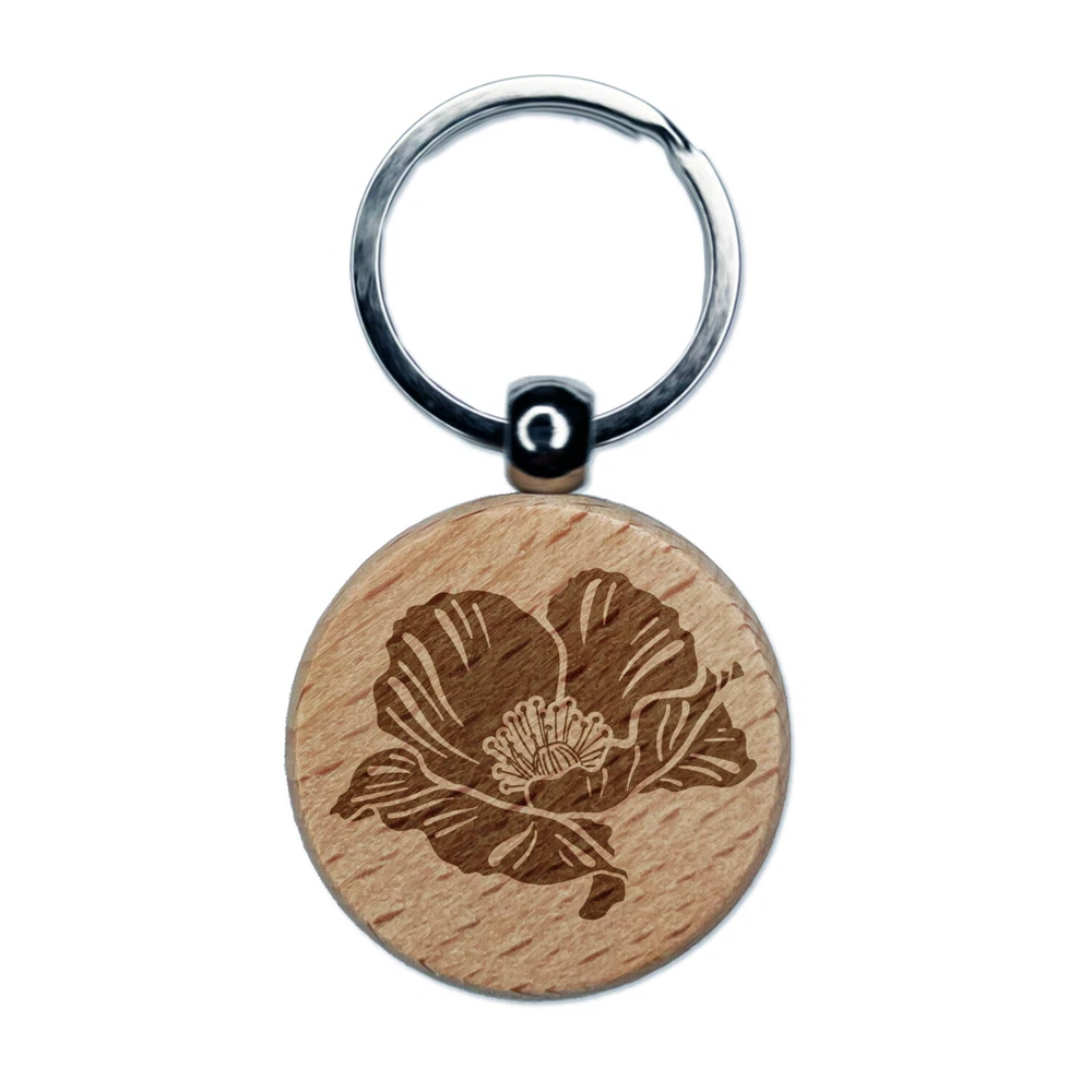 Pretty Poppy Flower Engraved Wood Round Keychain Tag Charm