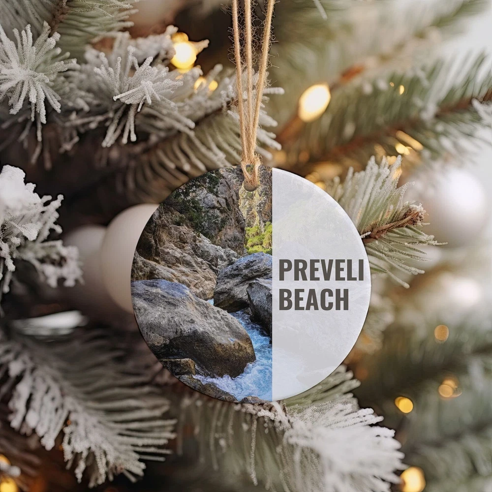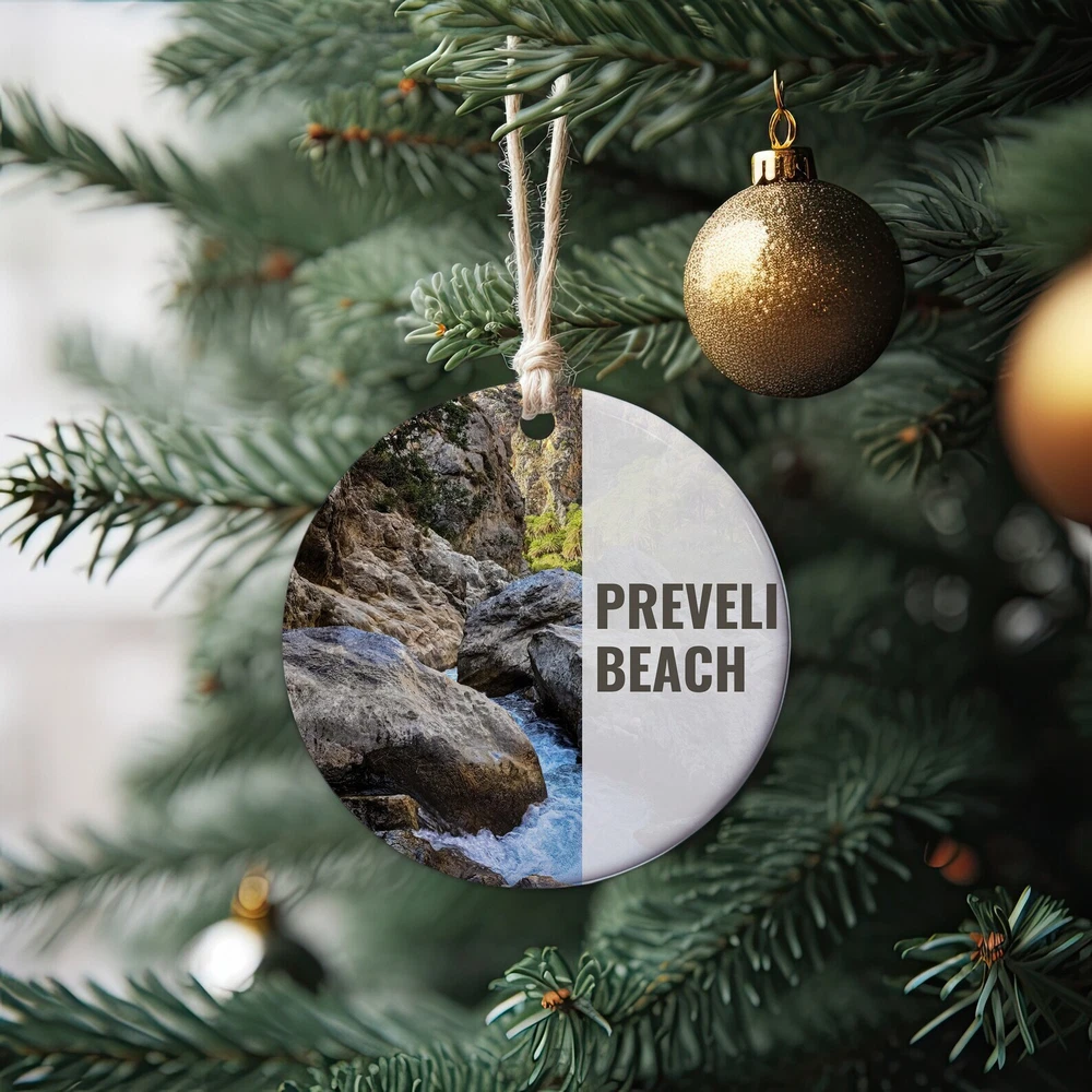 Preveli Beach Ornament Christmas Ornament Preveli Beach Gift Christmas Gift Christmas Decor Preveli Beach Souvenir Material: Ceramic Color: White Shapes: Circle, star, heart and oval Can be printed on both sides Imprint full-color artwork, photos, or logos Hole for hanging string and hanging string included Printed in the USA