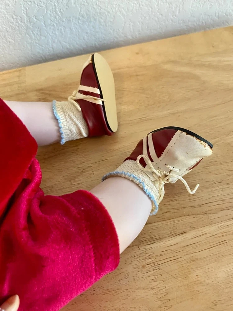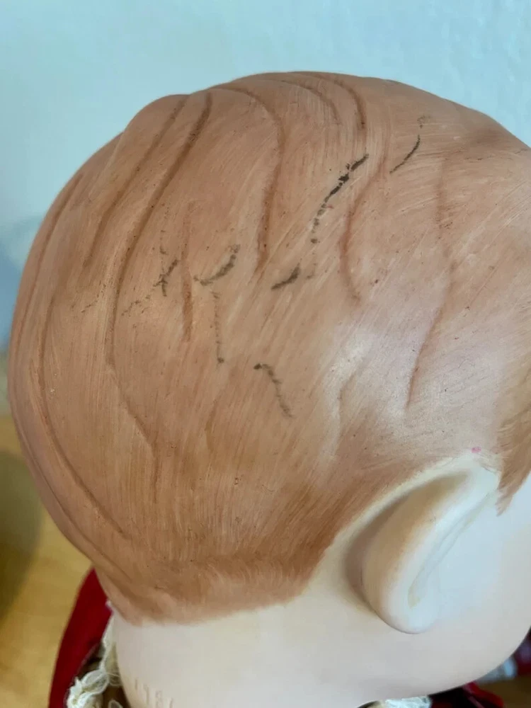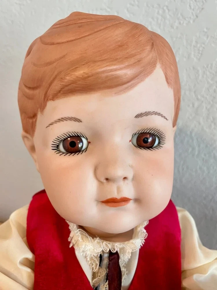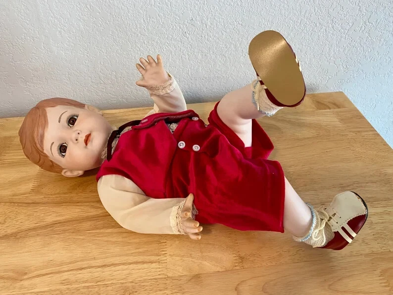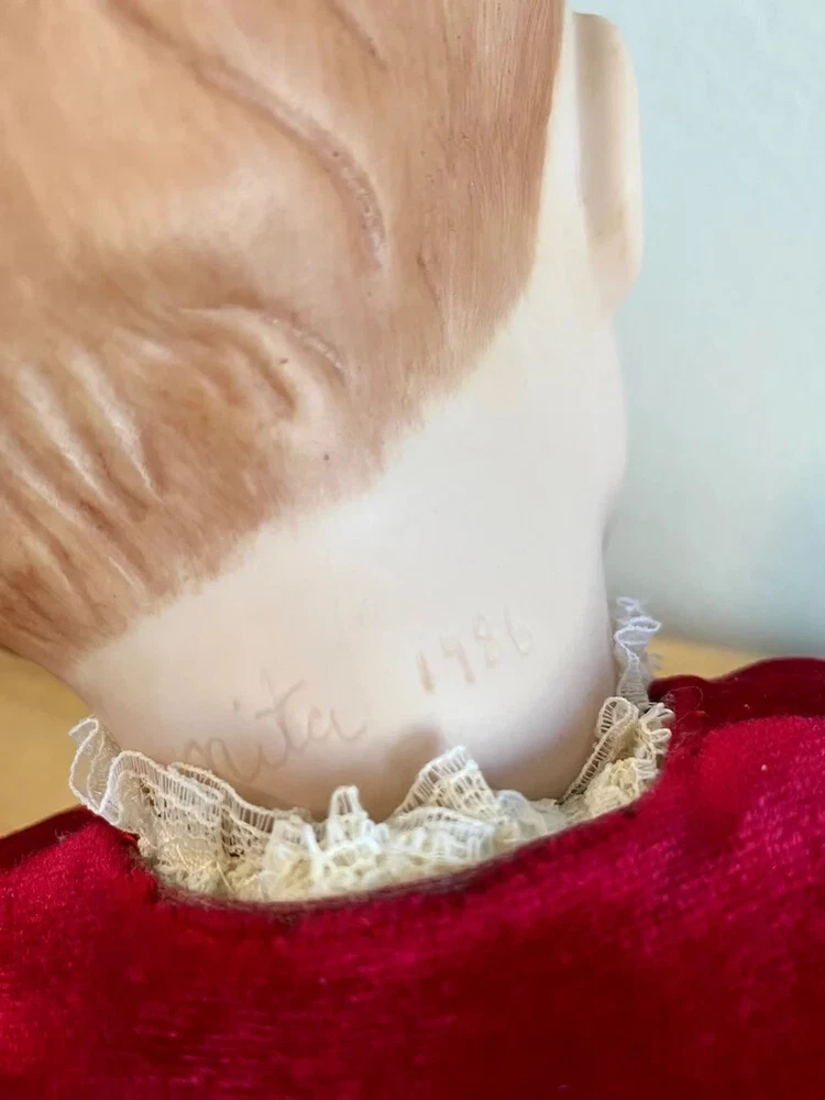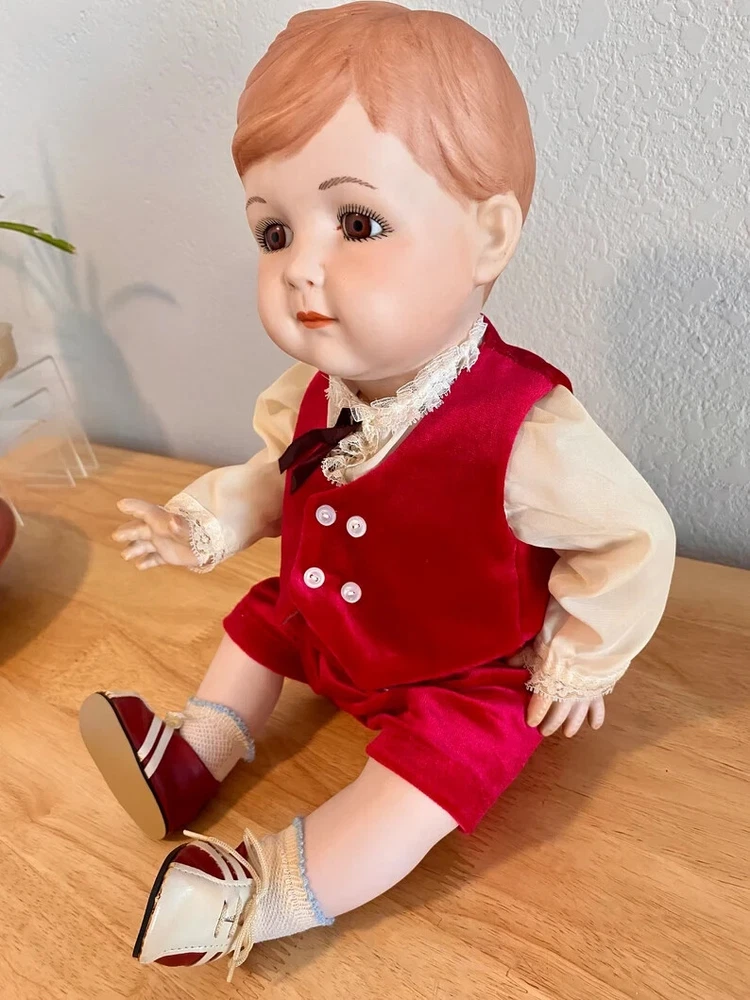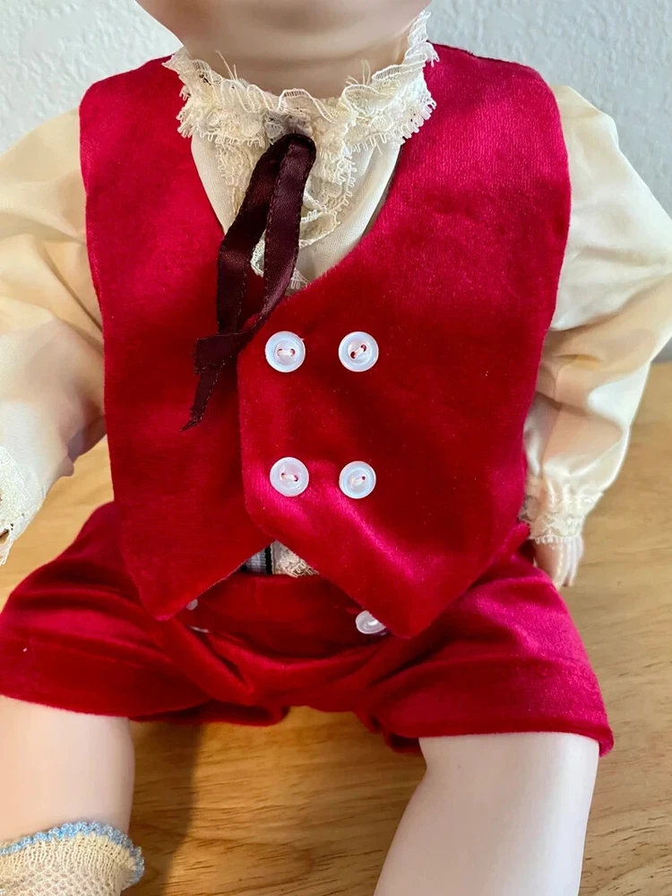 18" tall, toddler Prince Charles "Born a prince, became a king" 1986 remake of a 1950's porcelain issue Signed "Nita, 1986" Limbs are heavy * Needs restringing BUT he sits well Doll is clean; no odors Clothes are clean 5pc Ceramic body; heavy Doll is restrung with felt padding in joints *Scuff marks on head No cracks or chips Painted face with glass eyes Eyes do not close No box, stand or tags Dressed in double vest red velvet vest and pants Adorable vintage shoes with socks * Pants need new elastic Clothes are removable Doll is like new Doll weighs 4 lbs; could affect shipping cost Look close; ask questions I do not accept returns on this doll Thank you