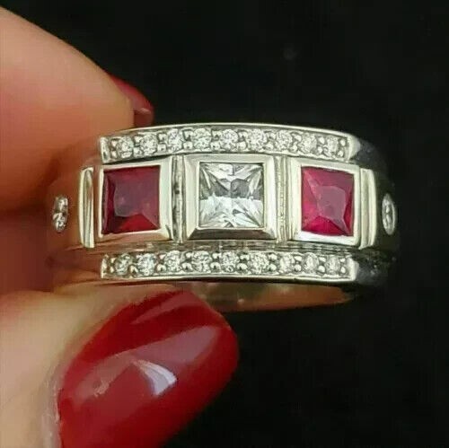 Princess Cut Simulated Red Ruby Men's Stunning Band Ring 14k White Gold Plated