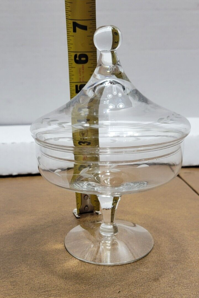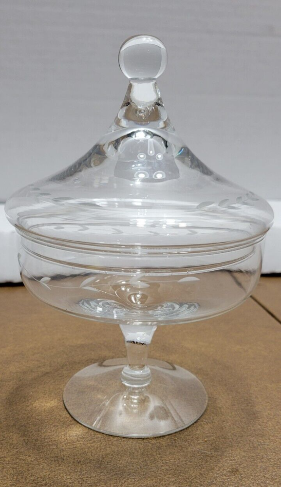 The Princess House Heritage Etched Crystal Pedestal Candy Dish with Lid is a stunning collectible piece made of clear crystal with Americana style etching. This original Princess House item features a pedestal design and comes with a lid, making it perfect for storing and displaying candies or other small items. The intricate etching adds a touch of elegance to this piece, making it a beautiful addition to any decorative collection. See photos for condition as they are part of the description.