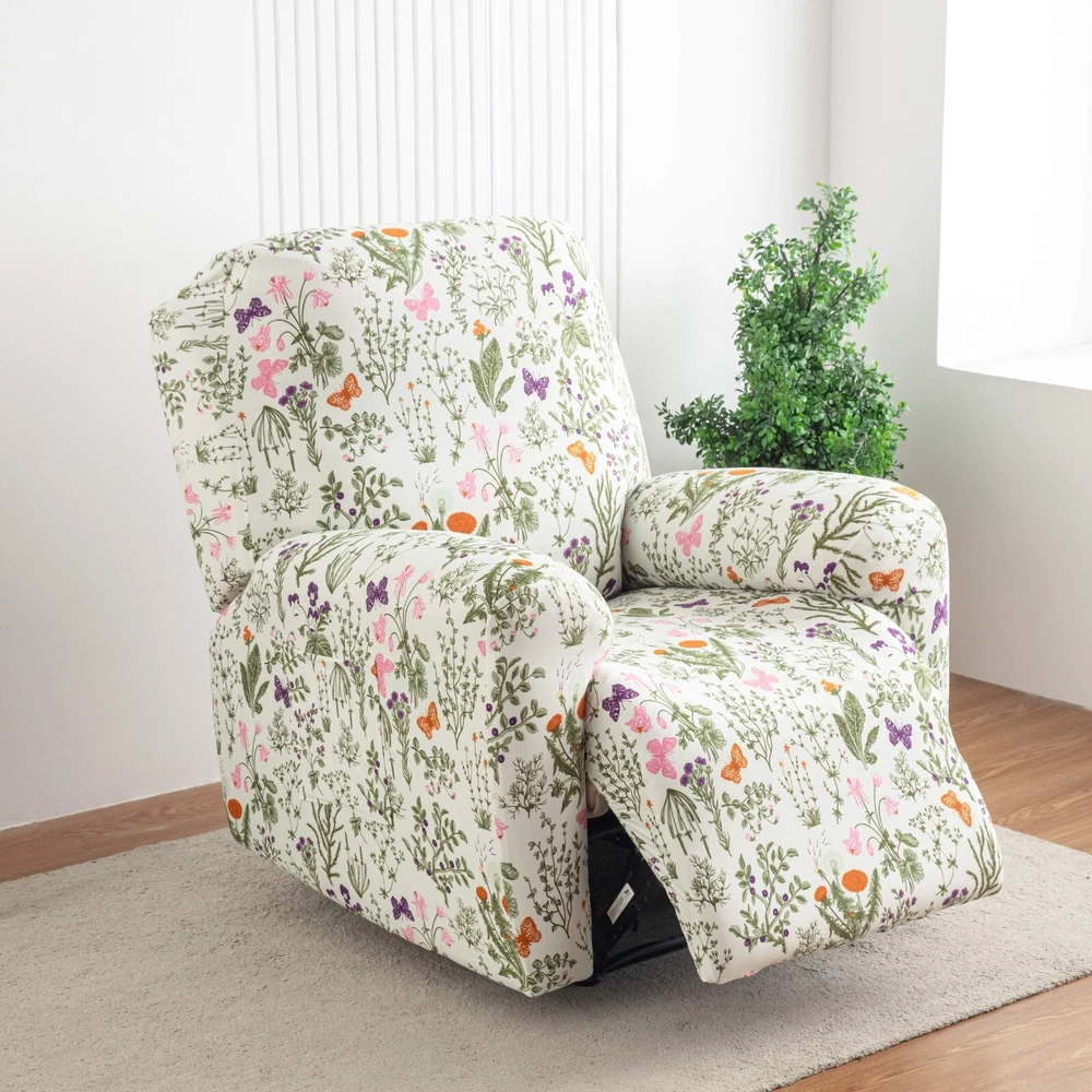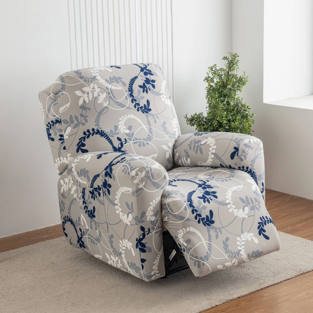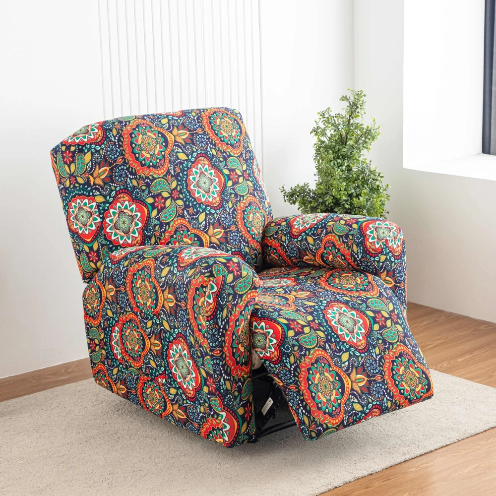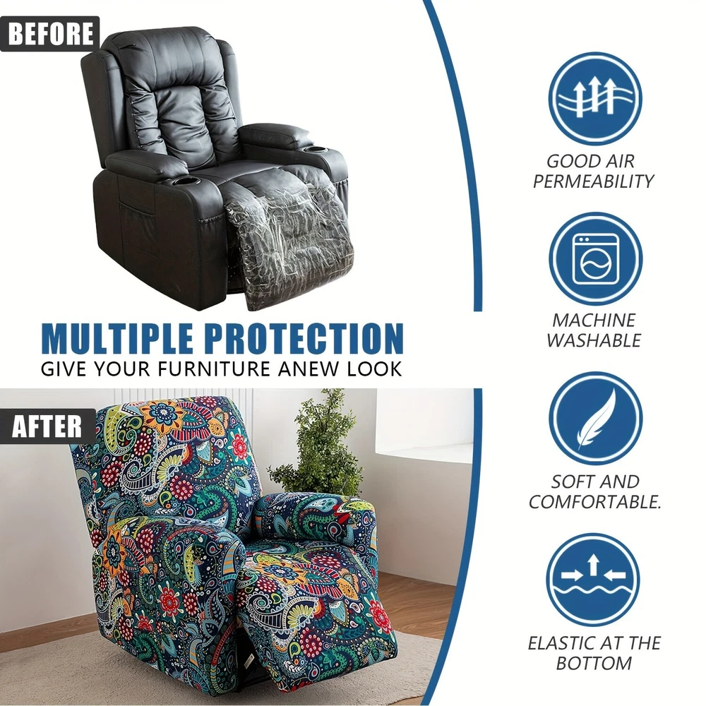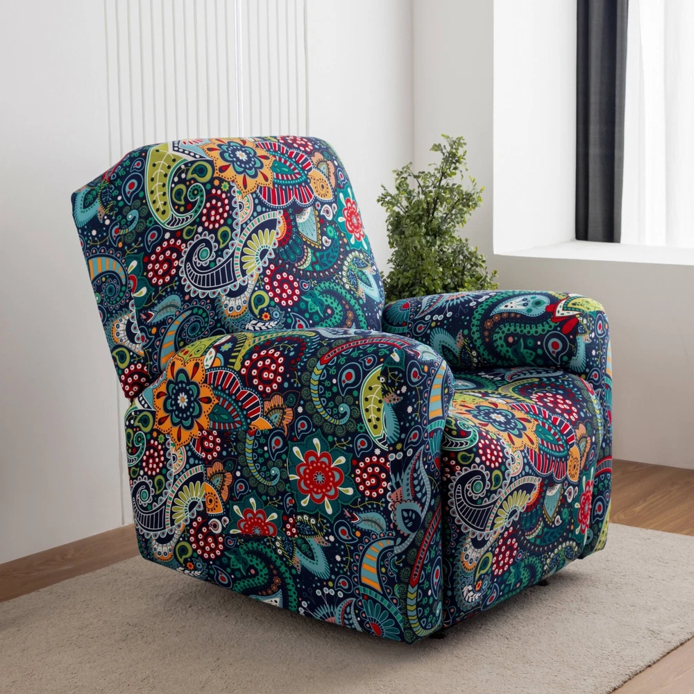 Printed stretch recliner cover, side pockets, home decor protection, stylish