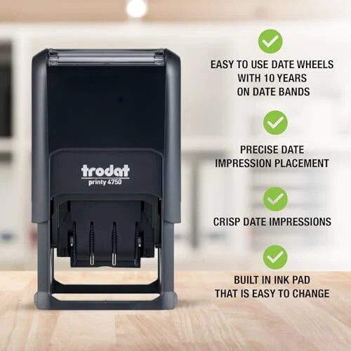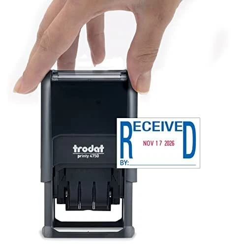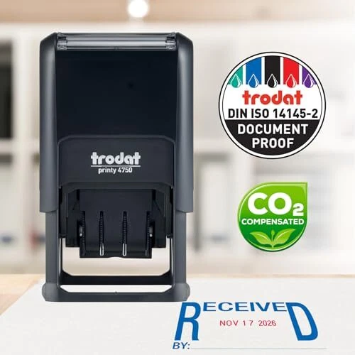The quick and easy way to stamp documents with the date. Self-inking dater delivers Rapid, repeat impressions to keep up with your busy office. Replaceable stamp pad delivers up to 10, 000 impressions. Four-band date: months, days and 10 years for long stamp life. Date band cover ensures fingers remain clean. Dater with impression size 1" x 1-5/8”, character height date 5/32”(4mm) – easily readable date band with 12 years; months in letters, days and years in numbers For well-organized paperwork in the office this stamper marks invoices, reminders, incoming mail or any other documents Features a built-in ink pad for a compact design and provides thousands of clear imprints – document proof stamping ink according to DIN ISO 14145-2 – Ink cannot be removed without leaving visible traces, protecting against forgery and fraud Change the ink pad with ease and no mess thanks to its intuitive design. 2-color replacement ink pads 6/4750/2 are available to extend the life of your stamp Produced with high percentage of recycled plastic material through renewable energy plus off-set programs to further reduce the CO2 footprint