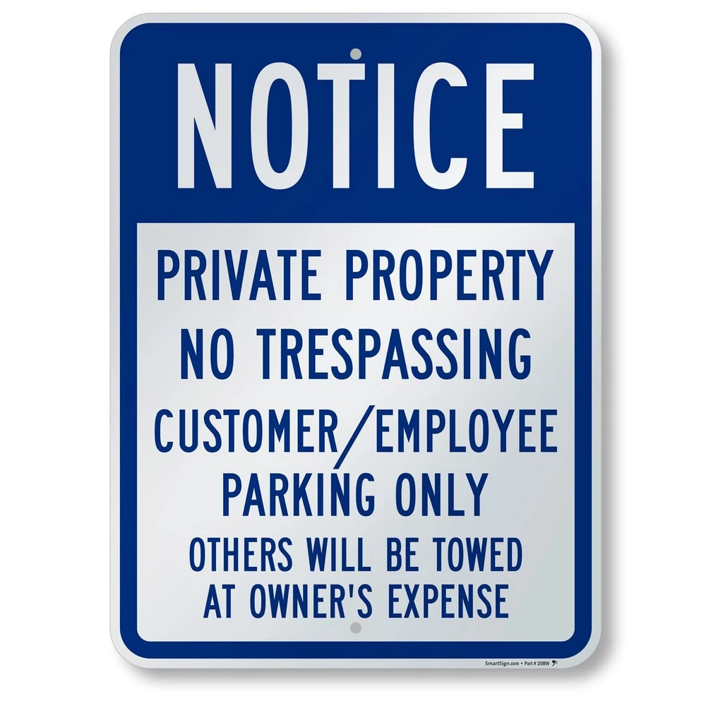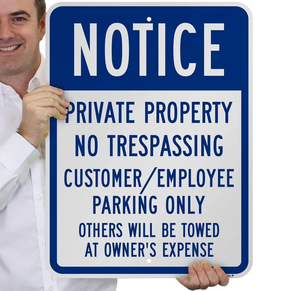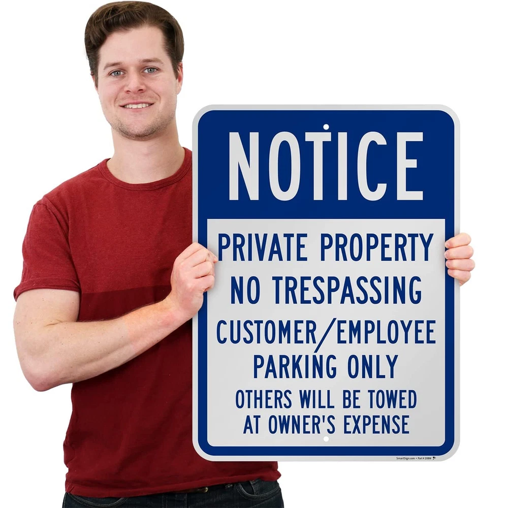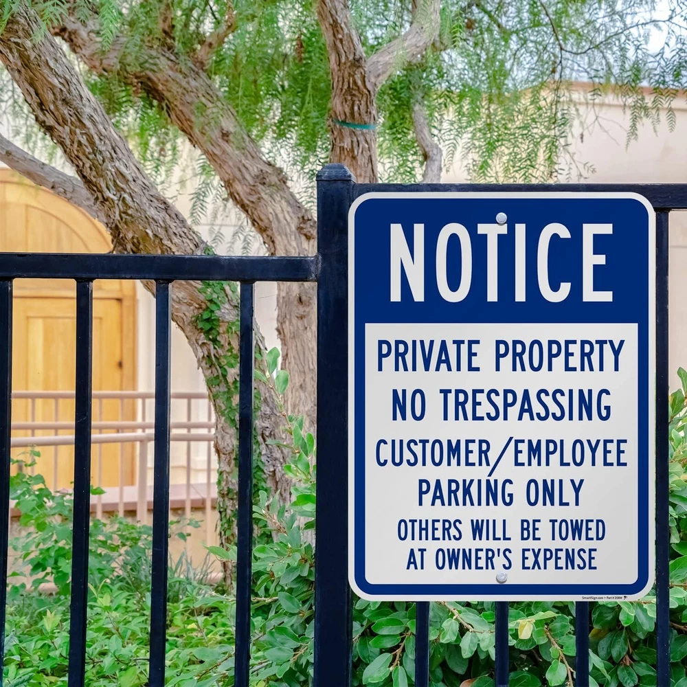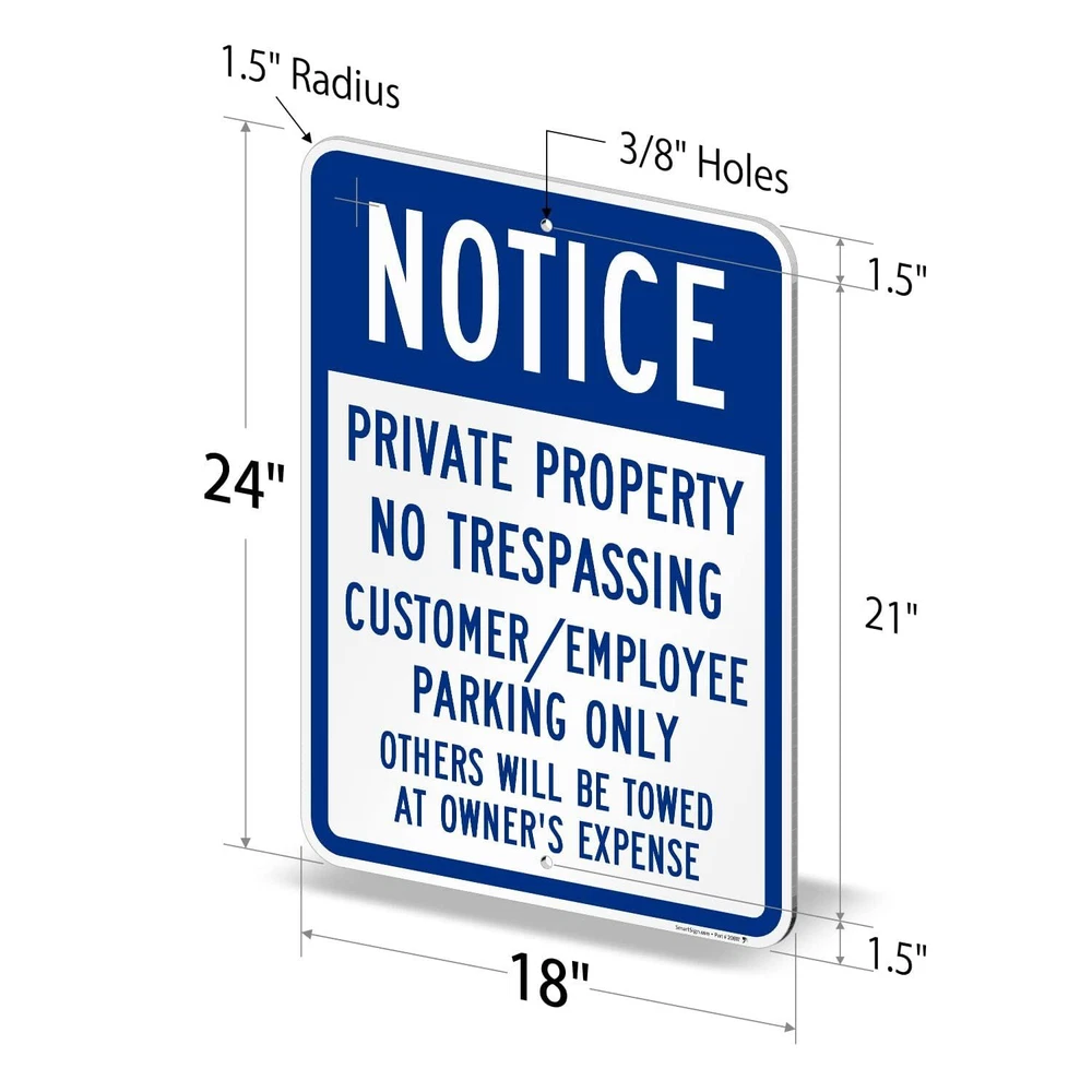DURABLE ALUMINUM: 'Notice Private Property' signs are made using 80 mil thick non-reflective aluminum and do not bend easily. They have been proven to outlast the toughest of storms. Signs last over 10 years outside. EASY INSTALLATION: All signs come with rounded, burr-free corners and 3/8 inch punched and pre-cleared holes. Signs mount to U-channel posts, square or round galvanized posts, wooden posts, and chain-link fences. LAMINATED FOR PROTECTION: With lamination, graphics are protected from weather and abuse to preserve a fresh look. Graffiti can be cleaned off too. Clear UV laminate resists chemicals, UV rays, water, and abrasion. 3M QUALITY: Printed with 3M screen printing or 3M outdoor digital inks designed specifically for outdoor traffic and property signs - providing ultimate quality and assurance. PACK CONTENTS: 24 x 18 inch blue and white aluminum sign.