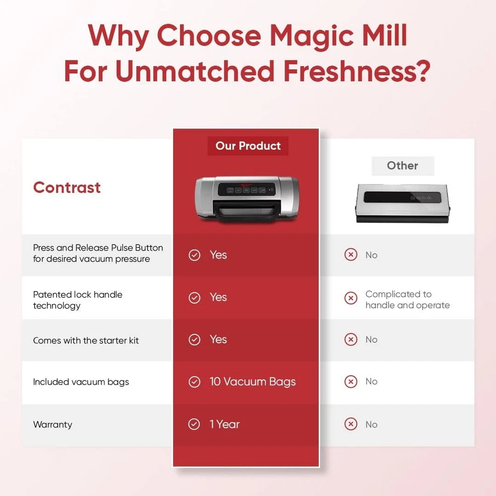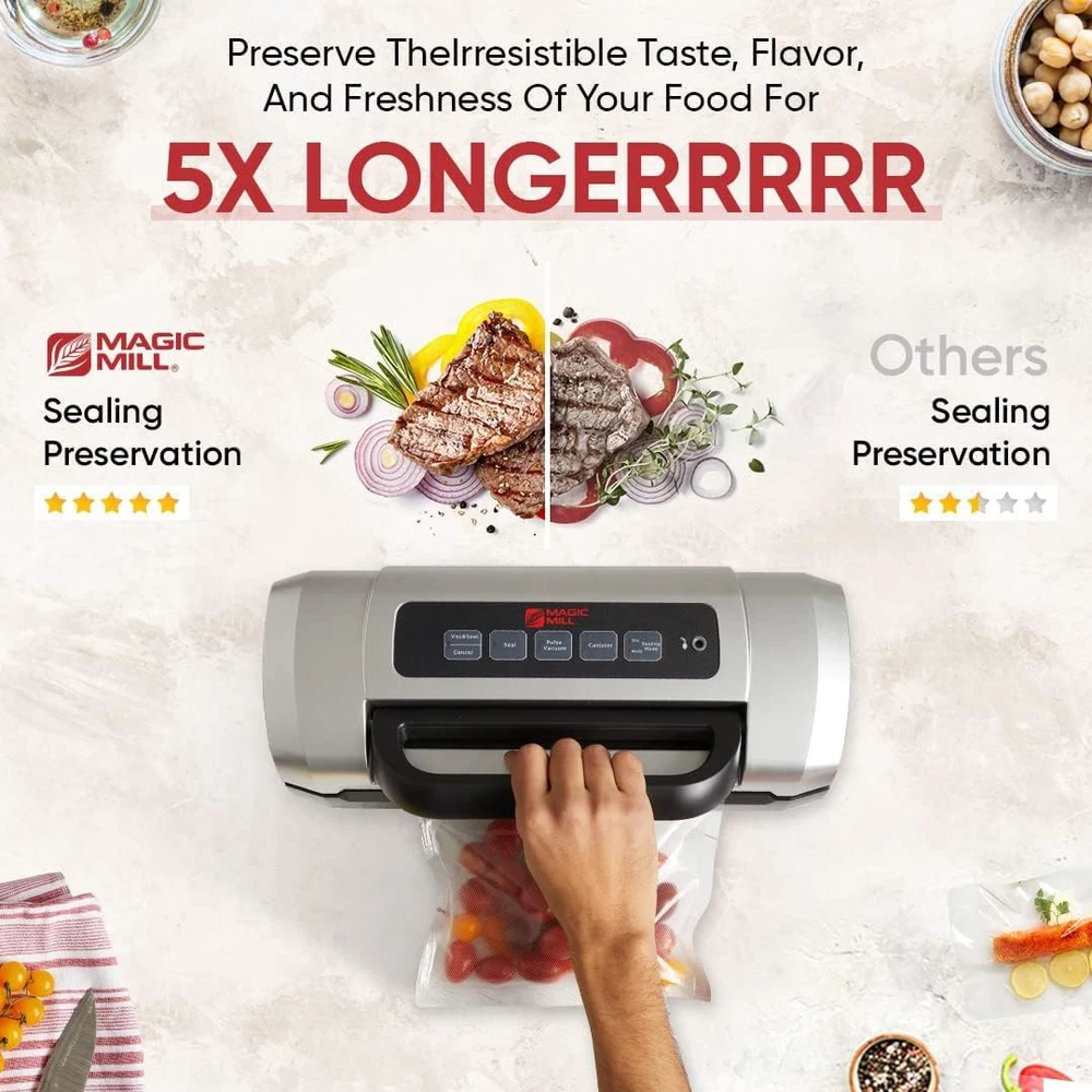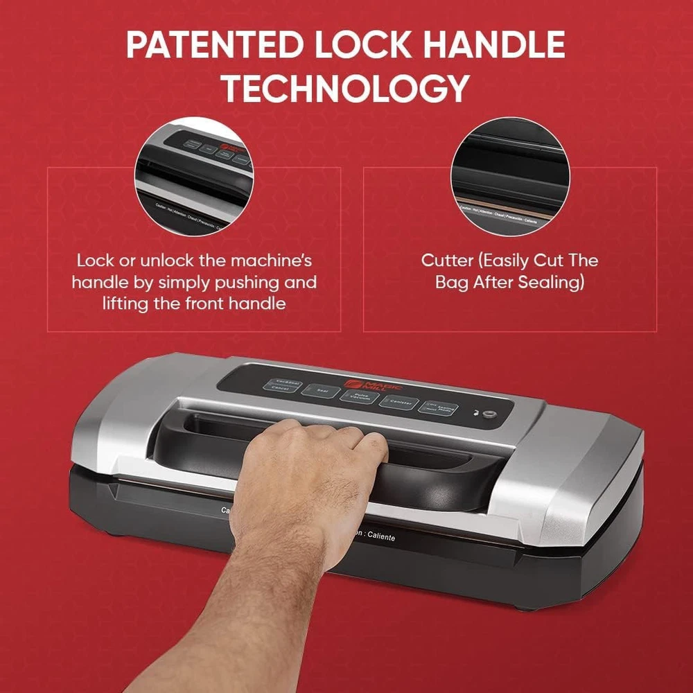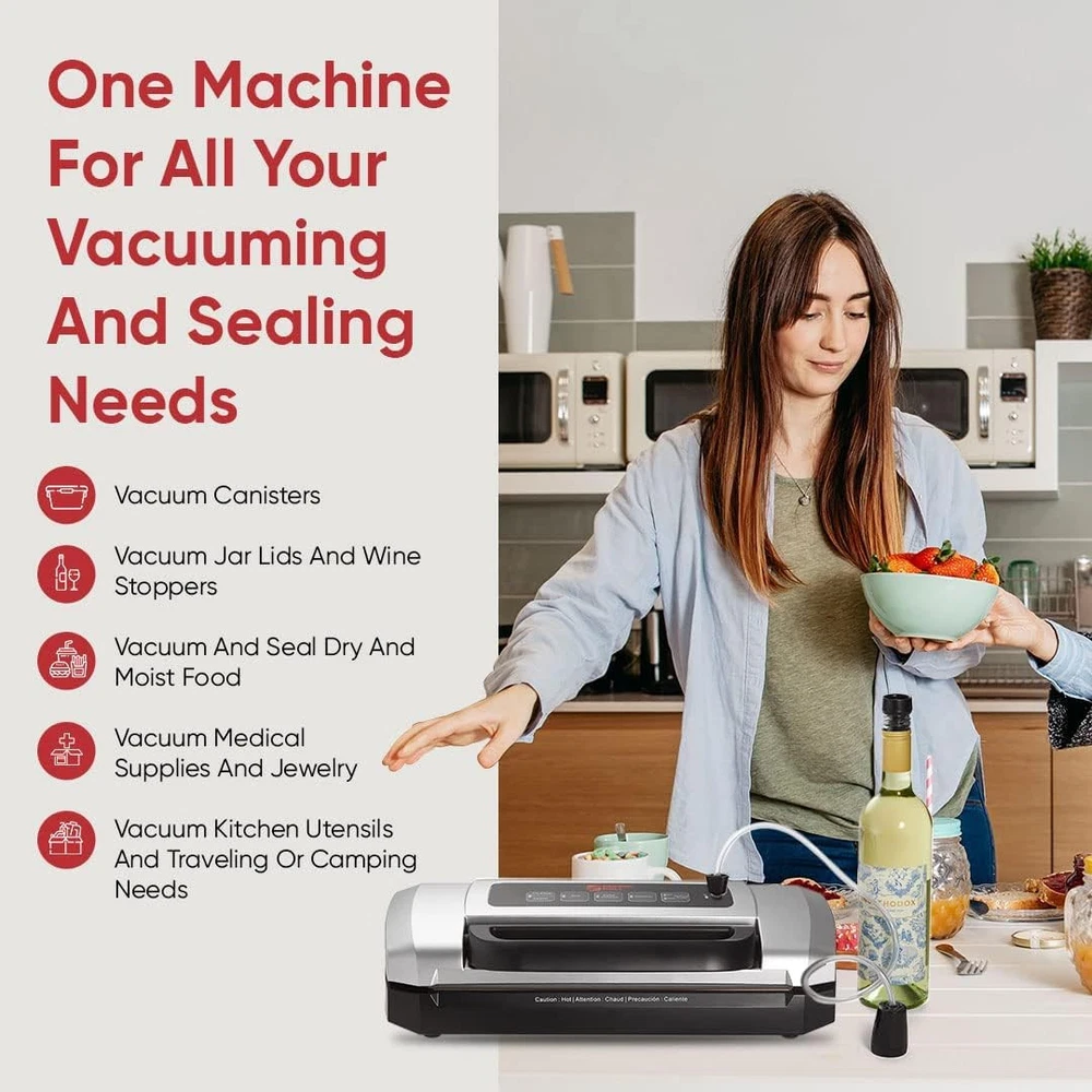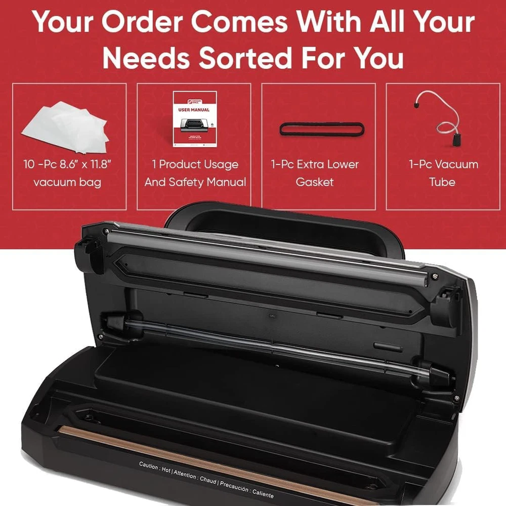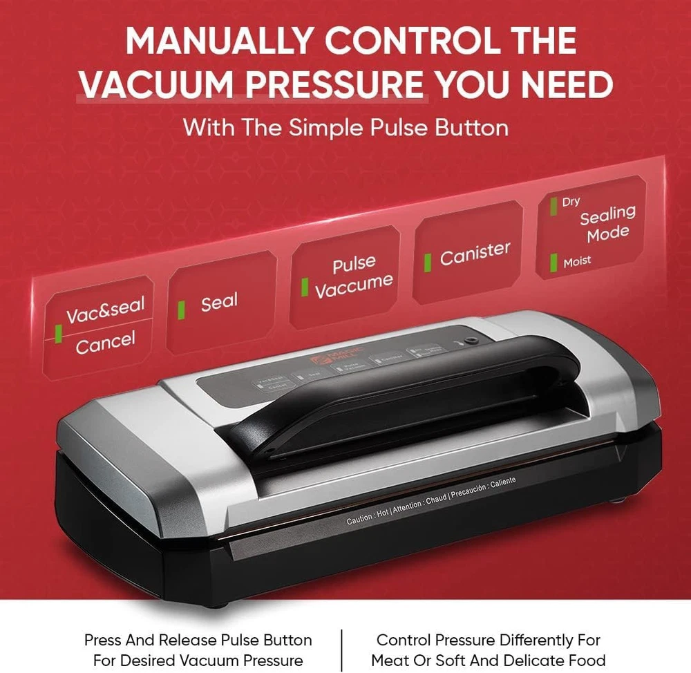 Time-Saving Functions - You can set the professional vacuum food sealer machine on Standby Status, which automatically vacuums and seals bags. You can also use it for Manual Seal and Vacuum Operation, where users can securely seal bags and control the vacuum pressure. Easy to Use Operation - The Vacuum Bag Sealer uses a simple Press and Release Pulse Button. You can easily control vacuum sealing bags by pressing the Pulse Button and releasing it when the desired vacuum pressure is met. As a result, vacuuming different kinds of food like meat or soft and delicate food is made more accessible. Advanced Design Vacuum Sealer with Jar Attachment - This heavy-duty heat sealer machine can also vacumm canisters and jars aside from vacuum sealing food bags. The hose port of this machine allows users to vacuum pressure canisters, jar lids, wine stoppers, and other accessories using the extra hose tube. Users can control the desired vacuum pressure using the Canister Button. Multi-functional Vacuum Sealing Machine - You can use this package sealer in sealing and vacuuming Dry and Moist Food. It can also be used in vacuum-sealing non-food items, including kitchen utensils, traveling or camping needs, medical supplies, jewelry, and more. Extra Starter Kit - Aside from the Vacuum Sealer, the product package also comes with 1- roll 8.6" x 11.8" food saver vaccum bag, 1 Vacuum Tube, 1-piece hand cutter, 1-piece extra lower gasket, and Product Usage and Safety Guidelines. The product has a 1-year Warranty, and for any inquiries about the product, you can always contact customer service.