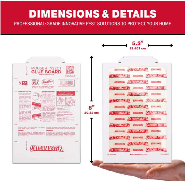 Catchmaster Pro Strength Mouse & Insect Glue Boards 60pk Traps Indoor for Home, Adhesive Bug Catcher, Rat & Rodent Sticky Trap, Non Toxic Bulk Pre-Baited Glue Traps, Pet Safe House Pest Control Brand Catchmaster Color White Style Foldable Material Glue Product Dimensions 6"L x 3.88"W x 8.81"H Item Weight 3.1 Pounds Number of Pieces 60 Is Electric No Target Species Mouse Unit Count 60.0 Count About this item READY TO USE: Insect and Mouse glue traps are pre-scented and are intended for use without additional mouse bait. For best use, leave the mouse trap with paper on so pests can acclimate to the trap, then place the glue board along known or suspected rodent pathways. YEAR-ROUND PROTECTION: Catchmaster glue traps for mice and rats are safe, non-toxic and mess-free. The insect and mouse traps are perforated to tear off and place glue directly against baseboards to secure traps and prevent drag offs. When placed in an area with normal conditions, mouse traps indoor for home can last up to one full year. NO MESS CONVENIENCE: The bulk pack of disposable sticky traps for mice and rats is made with professional strength adhesive and can fold into a tunnel shape for use in tight or dusty areas. The sticky mouse trap can be used as a standalone trap or as an insert for other Catchmaster traps. TOTAL COVERAGE: The glue mouse pad trap can be used indoors in residential, commercial, or industrial buildings, and sensitive areas where rodenticides or snap traps are undesirable or prohibited. Our 60M glue boards cover 30 sq. in. and are proudly made in the USA, fast acting and non-toxic. INTELLIGENT PEST MANAGEMENT: At our core, we are dedicated pest detectives. We believe in utilizing a science-based approach to integrated pest control. We call this approach Intelligent Pest Management. We leave no stones unturned when it comes to pests. . We offer FREE shipping on all orders! . We ship within Five business days of payment, usually sooner. . We use a selection of shipping services such as UPS, FedEx, USPS etc. . We only ship to the lower 48 states, no APO/FPO addresses or PO Boxes allowed. . Local pickups and combined shipping options are not provided at this time. . Your satisfaction is a wonderful reward for our efforts. Please assist us by leaving a positive review if you feel pleased with our service. . In the event that you encounter any difficulties related to your order, please do not hesitate to reach out to us directly through the Messaging system on the Ebay platform. Kindly consider opening a COMPLAINT or a RETURN REQUEST as a last resort, only after all other possible measures have been attempted and we have been unable to provide you with assistance. . We will get in touch with you within 24 hours and make every effort to ensure your satisfaction. . Please rest assured of our service quality.