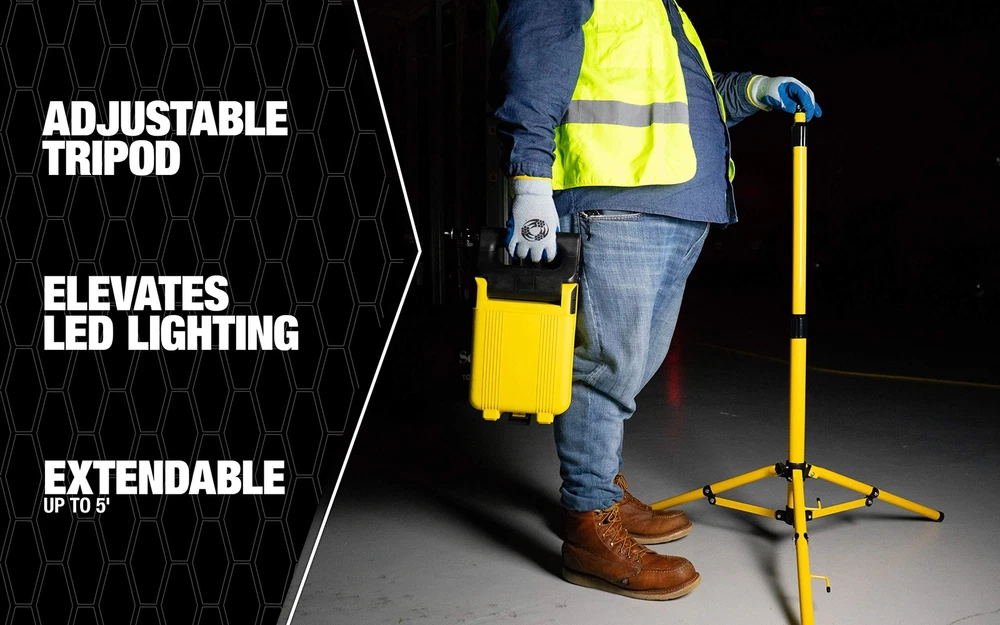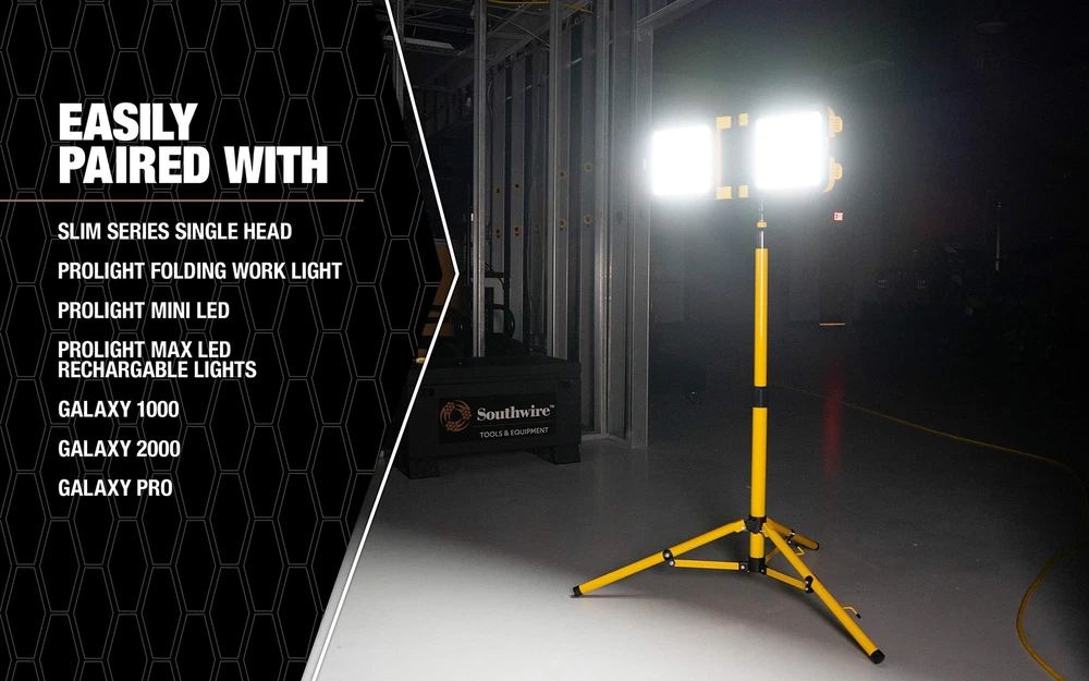 Use this model with: Slim Series 15 W Single Head Prolight Folding Work Light Proflight Mini LED Prolight Max LED Rechargeable Lights Galaxy 1000, 2000, [ADJUSTABLE AND EXTENDABLE] The adjustable tripod extendeds up to 6 feet which makes it the perfect stand to get your LED's off the ground [GREAT FOR PAIRING] the tripod can be easily paired with the 15W slim series dual head; the 30 and 50W slim series single head as well as the 30W dual head utilizing the included crossbar [EASY TRANSPORTATION] the light weight aluminum body allows you to fold up and transfer your stand wherever needed [BUILT TO LAST] the durable alloy aluminum body is built to withstand the toughest of job sites [STORES EASILY] when the tripod is not in use; it can eaily be folded up and stored until your next project