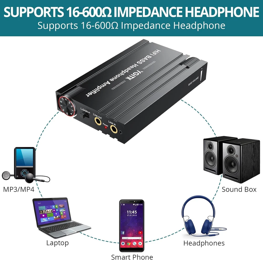 【16-600Ω Headphone Amplifier】The Portable Headphone Amplifier Provides A High-Fidelity Audio Experience With Headphones In The Impedance Range Of 16-600ω. Enjoy Clear, Detailed And Powerful Sound Wherever You Go. 【With Bass and Volume Control Knob】With bass knob, you can flexibly adjust the intensity of the bass, providing a more delicate and mellow bass performance, giving you a more powerful music experience. Enhances the signal input to the amplifier circuit for optimal headphone performance. 【3.5mm Aux In And Out】Snr>100db, Thd+N=0.0003% For Clearer And More Realistic Stereo Sound Without Distortion. It Filters Noise Accurately, Reduces Background Noise, And Delivers High-Quality Audio. No Matter Where You Are, You Can Enjoy An Unrivaled Acoustic Experience! 【Sensitive & Practical】The Sturdy Aluminum Case Is Effectively Shielded To Reduce Signal Interference And Increase Heat Resistance. The Multi-Stripe Design Creates A Unique Aesthetic. 【Rechargeable Battery】The Hifi Switch Amplifier Is Powered By A Rechargeable Lithium-Ion Battery With A Capacity Of 1,350mah, Which Provides An Extra-Long Runtime Of 8 To 10 Hours. In Addition, The Headphone Amplifier Is Equipped With A High-Quality 3.5mm Audio Cable For Easier Connection And Playback. 【Wide Compatibility】HiFi Earphone Amp can Remarkably Compatible with a Various of Digital Devices with 3.5mm Output, Such as Mac, Phones, iPad, MP3, MP4 Computers PS-4 PS5 Controller. (Notice: not recommended for use during charging, as power interference may occur during charging, resulting in noise)
