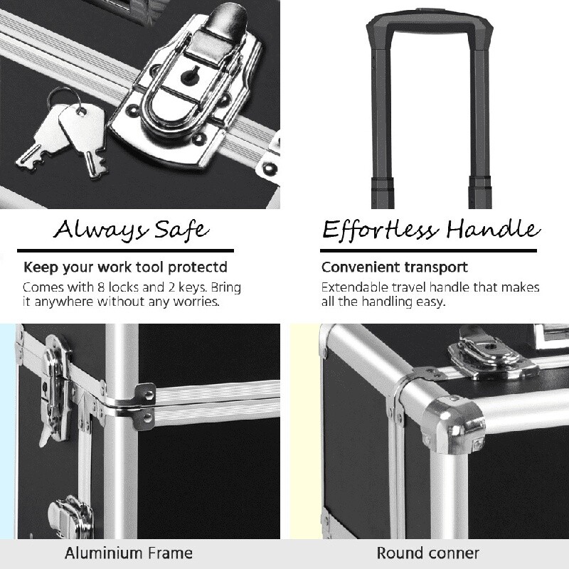 You may also like Beefy Classic Dry Dog Food Crunchy Kibble Nutrient Rich Gravy Meal 14 lb New 18.96 USD 19.96 USD Free shipping 5% off 30 Drawer Storage Cabinet Plastic Organizer Crafts Hardware Parts Wall Mount New 31.79 USD 33.46 USD Free shipping 5% off 32Qt Aluminum Steamer Pot W/ Lid Removable Tray Cooking Seafood Tamales New 39.2 USD 41.26 USD Free shipping 5% off Woven Ceramic Planter W/ Unmovable Wood Base Indoor Outdoor Plants 8 Inch New 16.15 USD 17.0 USD Free shipping 5% off 4 Slice Waffle Maker Non-Stick Removable Plates Space Saving Design Easy Cleanup 44.18 USD 46.51 USD Free shipping 5% off Heavy Duty Waterproof Tarp 20x30ft Outdoor Cover All Weather Tear Resistant New 79.93 USD 67.04 USD Free shipping 5% off Round Ceramic Orchid Planter Indoor Houseplants W/ Drainage Saucer 6 Inch New 14.68 USD 15.45 USD Free shipping 5% off Ergonomic High Back Office Chair Padded Armrests Adjustable Modern Design New 98.79 USD 103.99 USD Free shipping 5% off Round Fire Pit Cover Waterproof Durable Fabric Secure Fit Outdoor Protection New 21.06 USD 22.17 USD Free shipping 5% off Portable Foldable Director's Chair with Side Table Cup Holder Camping Backyard 37.01 USD 38.96 USD Free shipping 5% off Nonstick Carbon Steel Springform Cake Pan 6Inch Oven Safe Durable Design New 12.43 USD 13.08 USD Free shipping 5% off 9 Cup Stainless Steel Coffee Percolator Durable Design Easy Pouring Camping Use 35.73 USD 37.61 USD Free shipping 5% off This makeup train case comes with four detachable universal wheels and a telescopic pull handle for smooth pulling and rolling; A strap can be attached to the upper portion so you can carry the upper case on your shoulder, and a handle on the top of the trolley makeup case for easy lifting. Large upper and bottom compartments with no dividers can store hairdryers, hair straighteners, sprays, brush bags, and other items that are in relatively big sizes. This amazing trolley makeup case is a must-have piece for makeup artists, nail techs, hairstylists, beauticians, or those who possess a mountain of cosmetics. Professional Makeup Case, 3 in 1 Portable Trolley, Black: Material: Aluminum alloy, oxford lining, PVC, metal hardware Overall Dimension: 14. 2" L x 9. 4" W x 41. 7" H Max. Weight capacity: 66 lb G. W. : 19. 1 lb You may also like Convertible Loveseat Sofa Bed Modern Upholstered Recliner Futon Apartment Office 192.4 USD 164.78 USD Free shipping 5% off Backless Upholstered Counter Stool Comfortable Design Easy Assembly Indoor Use 113.91 USD 95.54 USD Free shipping 5% off Modern Upholstered Sofa Couch W/ 2 Pillows Durable Living Room Loveseat New 182.9 USD 153.4 USD Free shipping 5% off Single Serve Coffee Maker Hot Iced Brew Strong Brew Pause Pour 12 Cup Carafe New 184.45 USD 154.7 USD Free shipping 5% off 7-Level Cat Tree Activity Tower W/ Hammock Scratching Posts Rubber Massager Toys 105.81 USD 111.38 USD Free shipping 5% off Quad Fold High Profile Steel Bed Frame Queen Heavy Duty Tool Free Assembly New 154.95 USD 129.96 USD Free shipping 5% off 12 Piece Nonstick Aluminum Cookware Set Fry Pan Dutch Oven Saucepan Utensils New 153.45 USD 128.7 USD Free shipping 5% off 20" Hardside Luggage Spinner Wheels TSA Lock Ergonomic Handle Durable Travel Bag 83.45 USD 69.99 USD Free shipping 5% off Modern Upholstered Loveseat Sofa Couch W/ 2 Pillows Comfort & Stability New 176.7 USD 148.2 USD Free shipping 5% off Ergo Folding Chair W/ Footrest 7 Recline Positions Heavy-Duty Outdoor Use 136.99 USD 114.89 USD Free shipping 5% off 6 Person Instant Cabin Tent Dark Rest Technology Easy Setup Outdoor Camping Gear 193.75 USD 162.5 USD Free shipping 5% off 14 Inch Quad Fold Heavy Duty Steel Bed Frame Full Size No Box Spring Needed New 139.45 USD 116.96 USD Free shipping 5% off